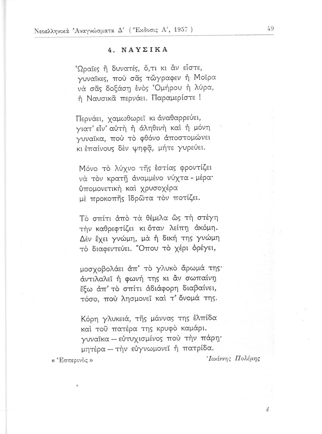 Σχολικό εγχειρίδιο Νέων Ελληνικών Δ΄ Γυμνασίου Θηλέων που περιλαμβάνει πεζά, ποιήματα και δημοτικά τραγούδια εμπνευσμένα από την σύγχρονη ελληνική ιστορία και την οικογενειακή και θρησκευτική ζωή. Περιέχει και