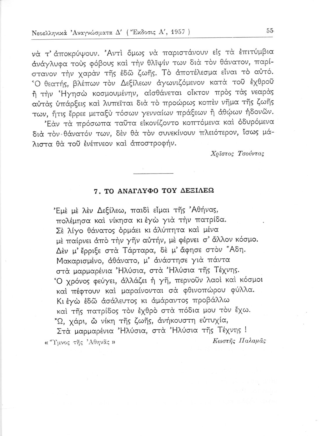 Σχολικό εγχειρίδιο Νέων Ελληνικών Δ΄ Γυμνασίου και Β΄ Αστικού Σχολείου που περιέχει πεζά και ποιήματα Ελλήνων συγγραφέων εμπνευσμένα από τη θρησκευτική και κοινωνική ζωή, την ελληνική μυθολογία, την αρχαία και