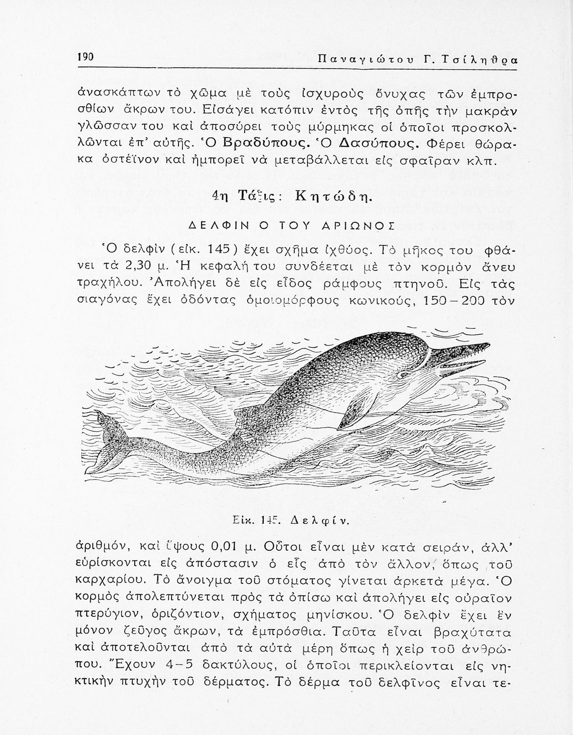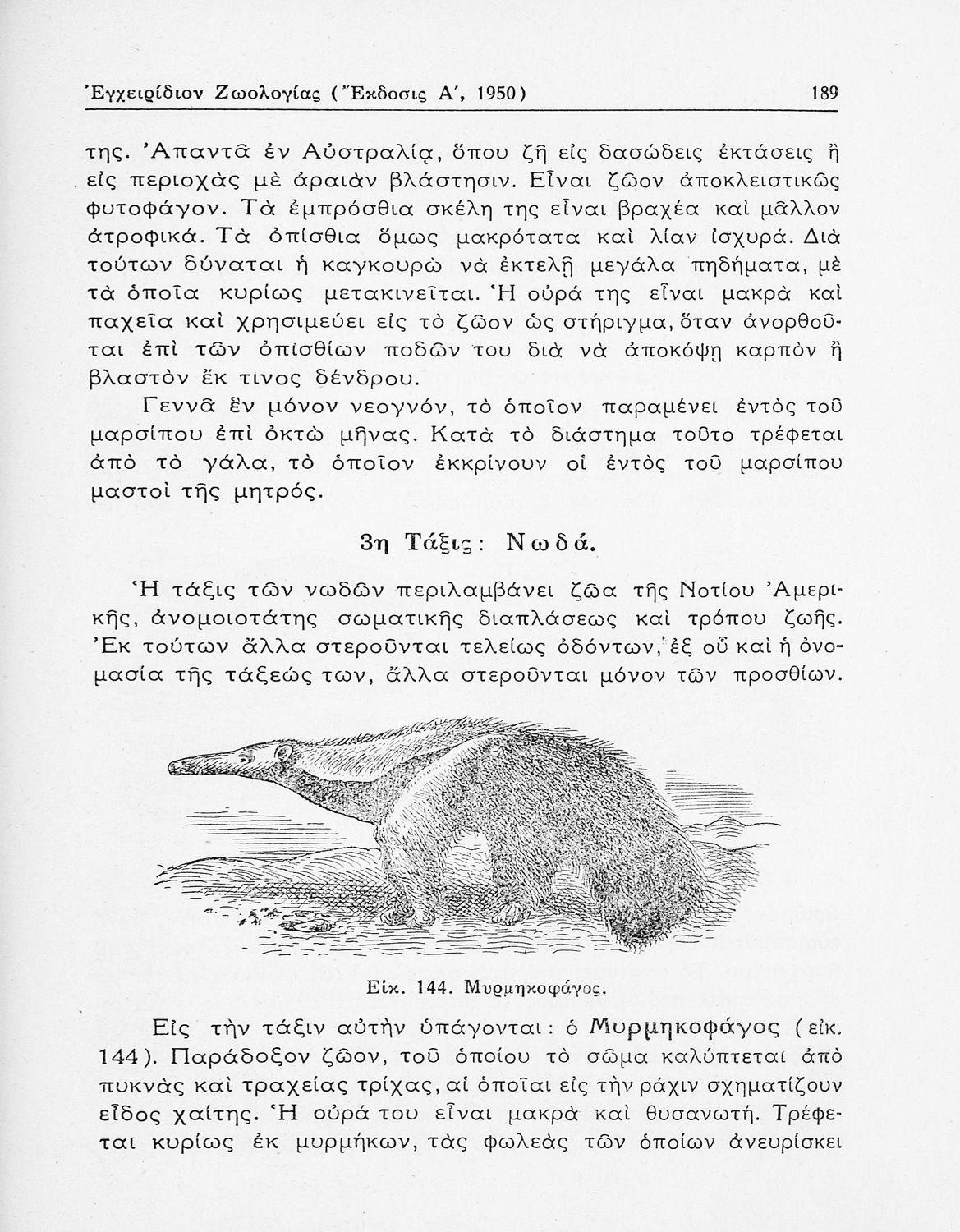 Σχολικό εγχειρίδιο Ζωολογίας για τα Γυμνάσια και τα Διδασκαλεία που εστιάζει στην ανθρώπινη φυσιολογία και παρουσιάζει τα διάφορα ζώα ανάλογα με την συνομοταξία στην οποία ανήκουν.