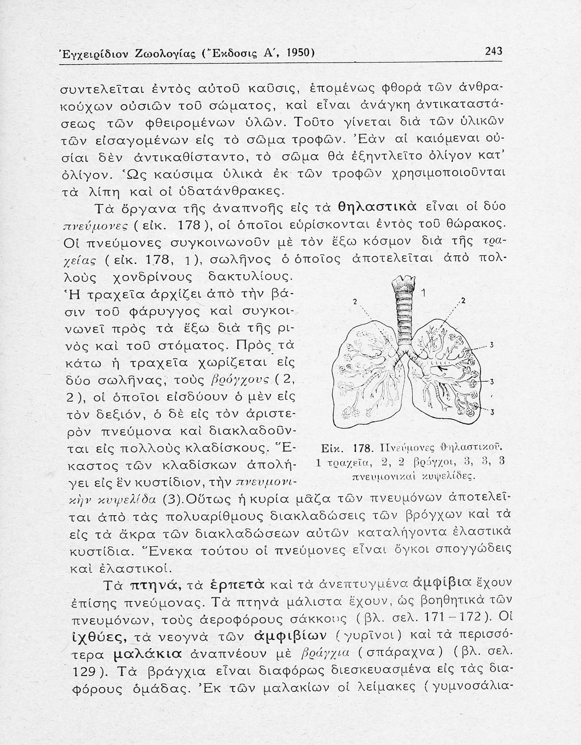 Σχολικό εγχειρίδιο Ζωολογίας για τα Γυμνάσια και τα Διδασκαλεία που εστιάζει στην ανθρώπινη φυσιολογία και παρουσιάζει τα διάφορα ζώα ανάλογα με την συνομοταξία στην οποία ανήκουν.