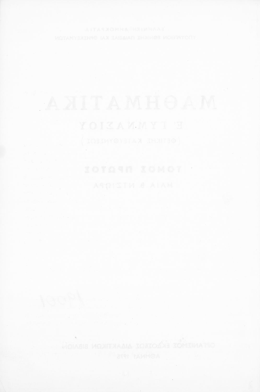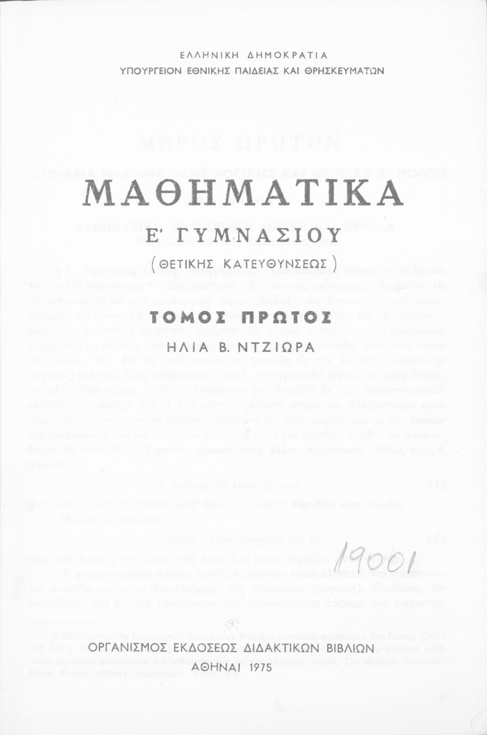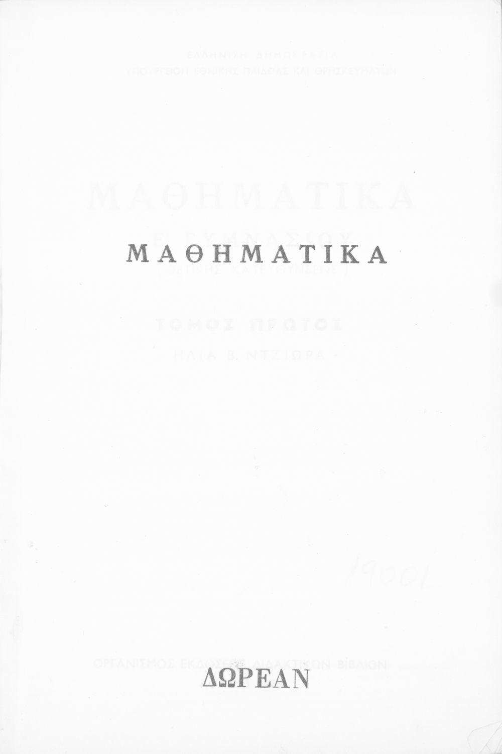 Κωδικός αναγνώρισης: 01-19001 Τίτλος: Μαθηματικά Ε΄ Γυμνασίου (θετικής κατευθύνσεως), τόμος Α΄ Συγγραφέας: Ηλίας Β. Ντζιώρας Μέγεθος και υπόστρωμα: Σχολικό εγχειρίδιο, 23εκ., μαλακό εξώφυλλο, 414 σελίδες. |