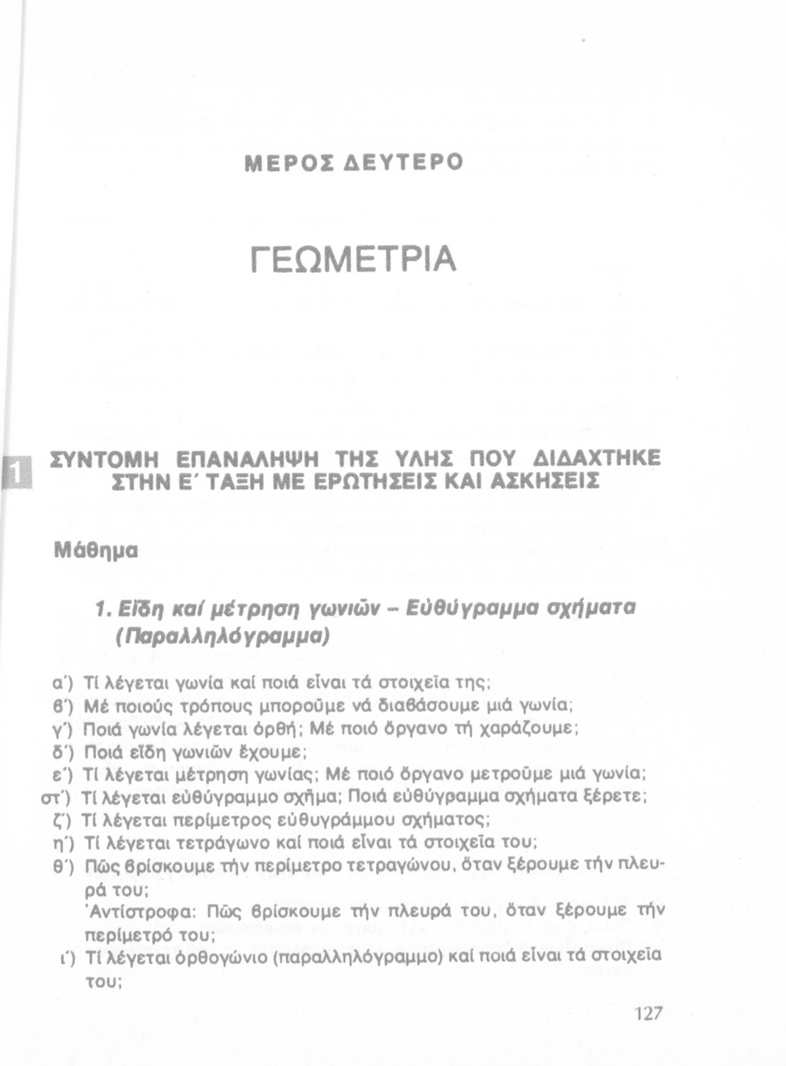 Βαθμίδα εκπαίδευσης: Δευτεροβάθμια Τάξη: ΣΤ' Δημοτικού Μάθημα: Μαθηματικά Γλώσσα: Δημοτική Παρουσίαση περιεχομένου: Σχολικό εγχειρίδιο Μαθηματικών ΣΤ΄ Δημοτικού που συνδυάζει Αριθμητική και Γεωμετρία και εστιάζει στις πράξεις με ακέραιους και συμμιγείς αριθμούς και τη μέτρηση γεωμετρικών στερεών. |