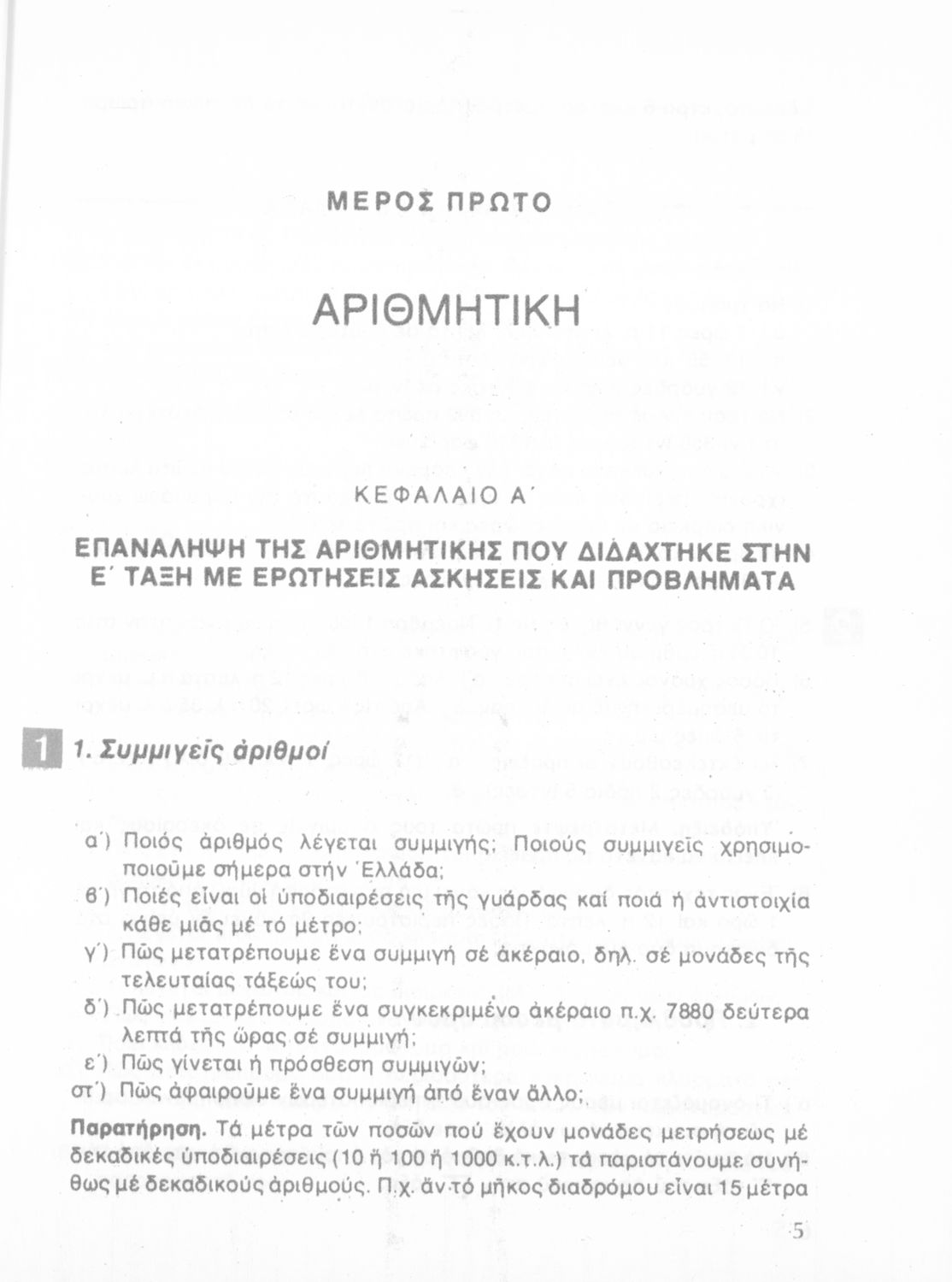 Σχολικό εγχειρίδιο Μαθηματικών ΣΤ΄ Δημοτικού που συνδυάζει Αριθμητική και Γεωμετρία και εστιάζει στις πράξεις με ακέραιους και συμμιγείς αριθμούς και τη μέτρηση γεωμετρικών στερεών.