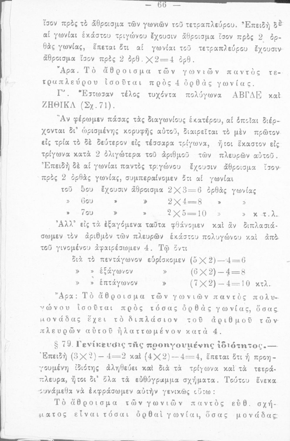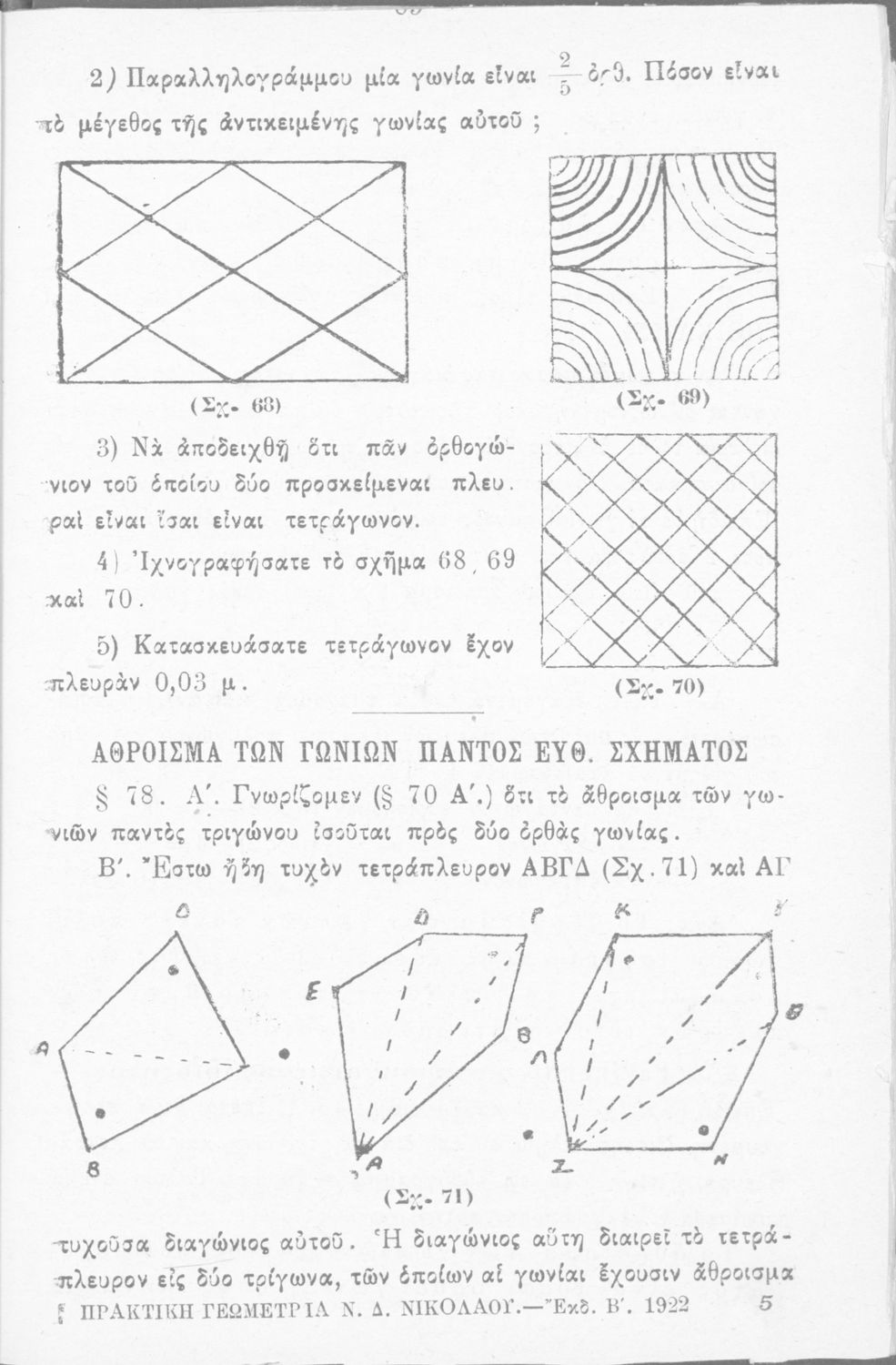 Σχολικό εγχειρίδιο Γεωμετρίας για τα Ελληνικά και Αστικά Σχολεία χωρισμένο σε Επιπεδομετρία και Στερεομετρία. Περιλαμβάνει προβλήματα και στοιχεία χωρομετρίας.