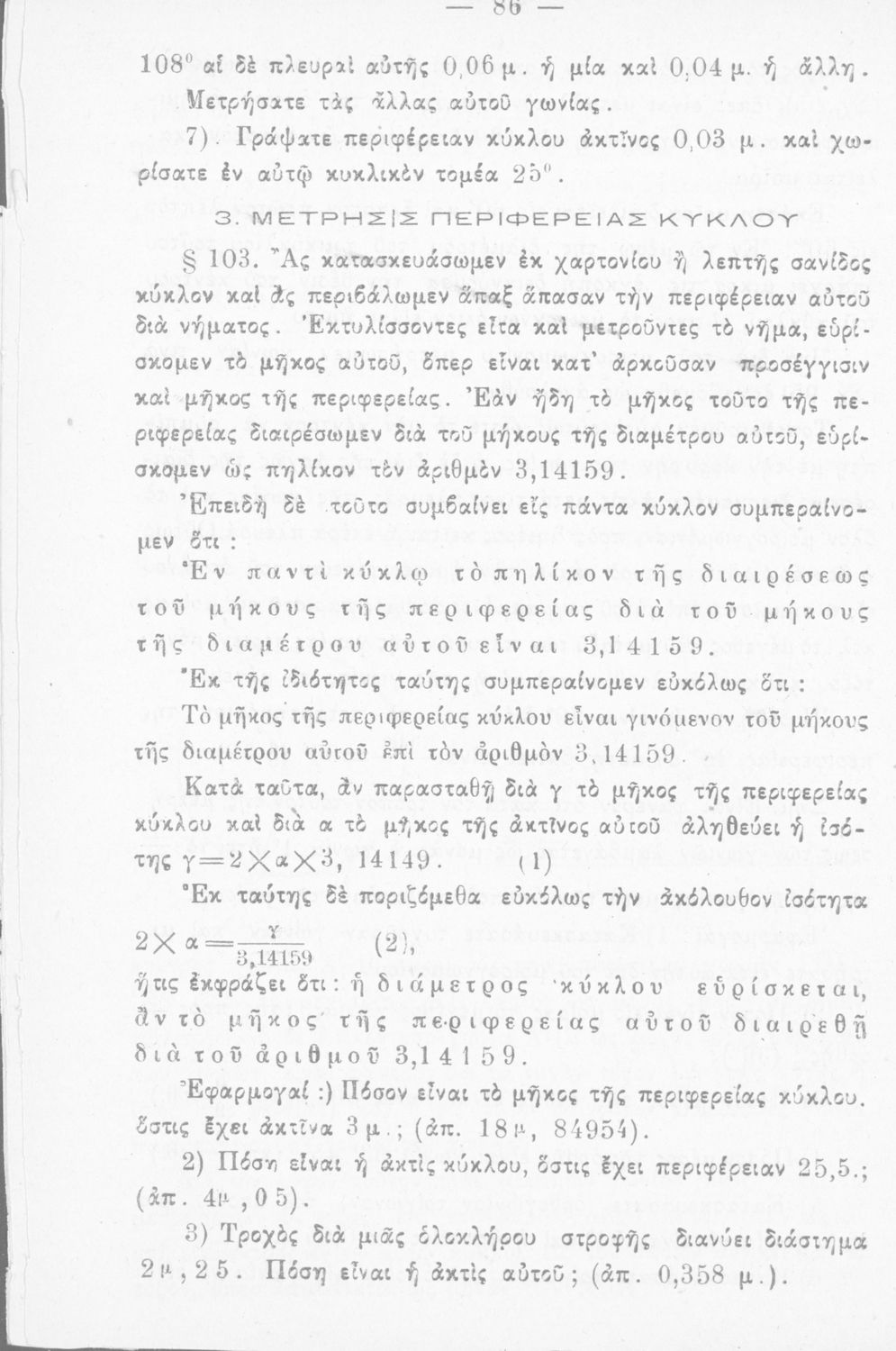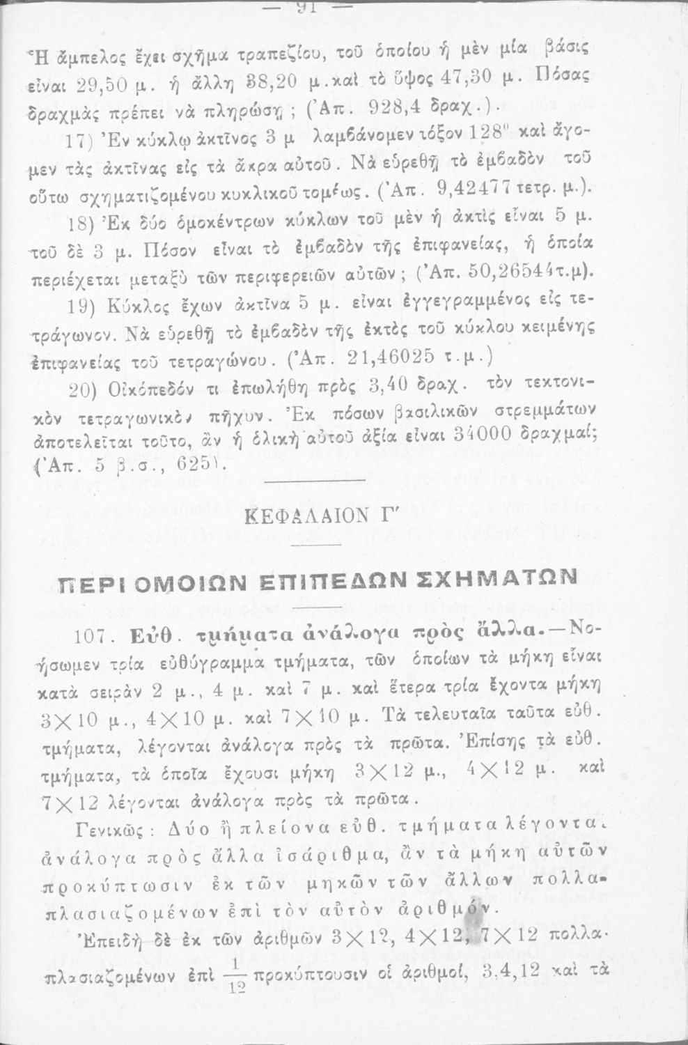 Σχολικό εγχειρίδιο Γεωμετρίας για τα Ελληνικά και Αστικά Σχολεία που περιέχει θεωρία και ασκήσεις και είναι χωρισμένο σε Επιπεδομετρία και Στερεομετρία.