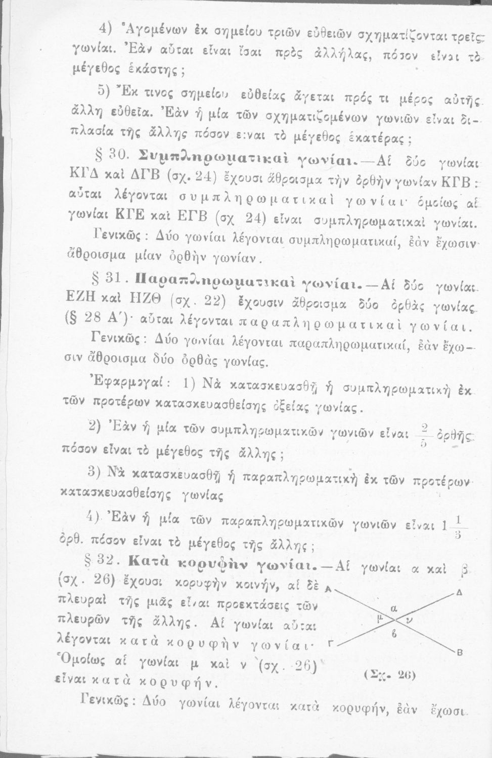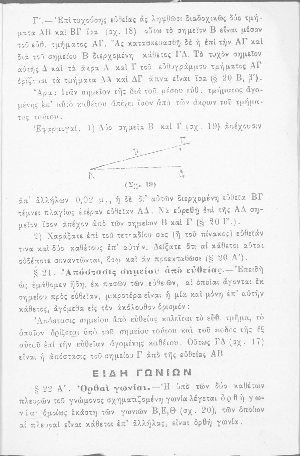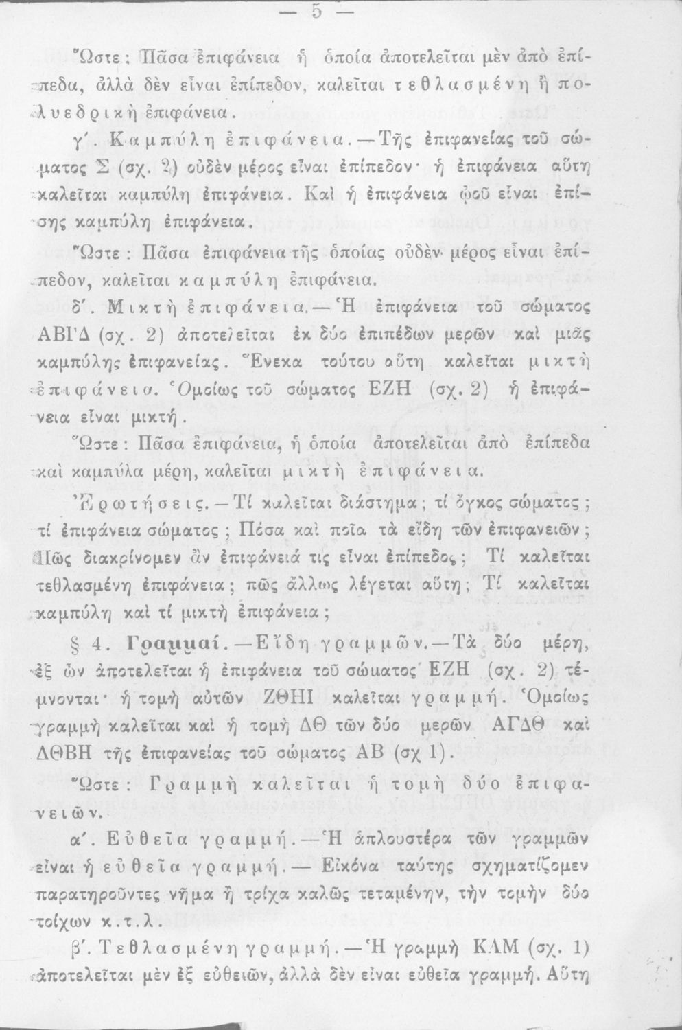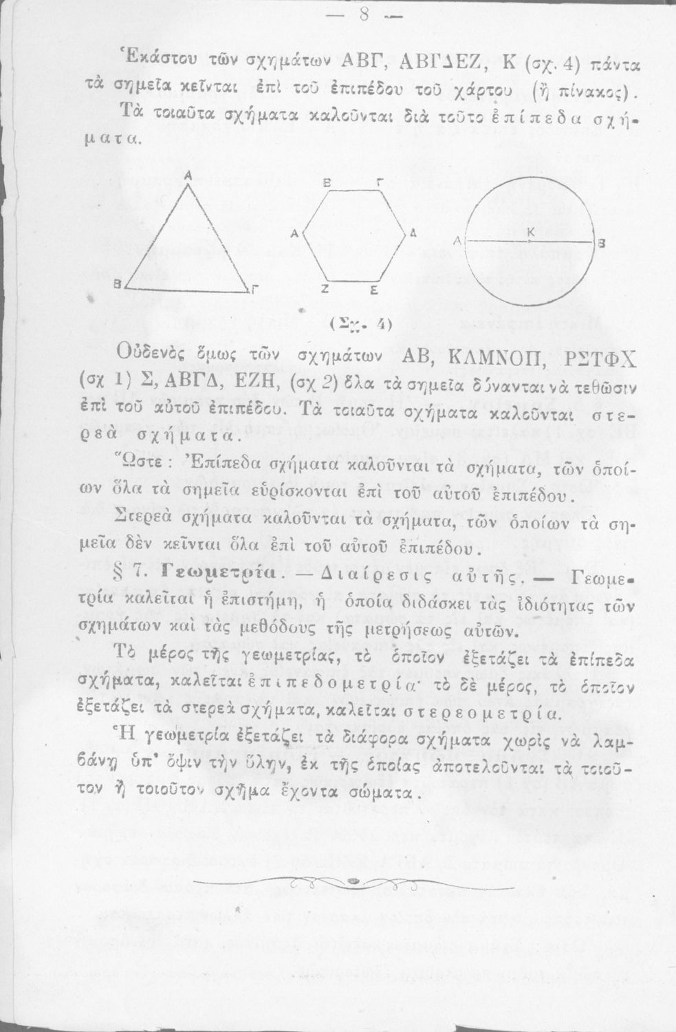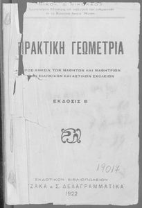 Σχολικό εγχειρίδιο Γεωμετρίας για την Α΄, Β΄ και Γ΄ τάξη των Ελληνικών και Αστικών Σχολείων και Παρθεναγωγείων που είναι χωρισμένο σε Επιπεδομετρία και Στερεομετρία και περιλαμβάνει θεωρία και ασκήσεις.