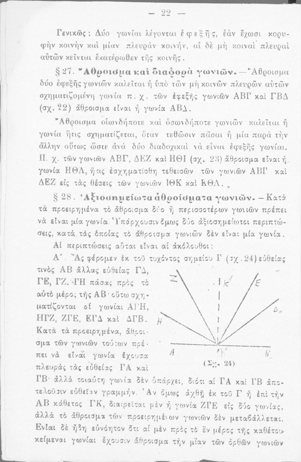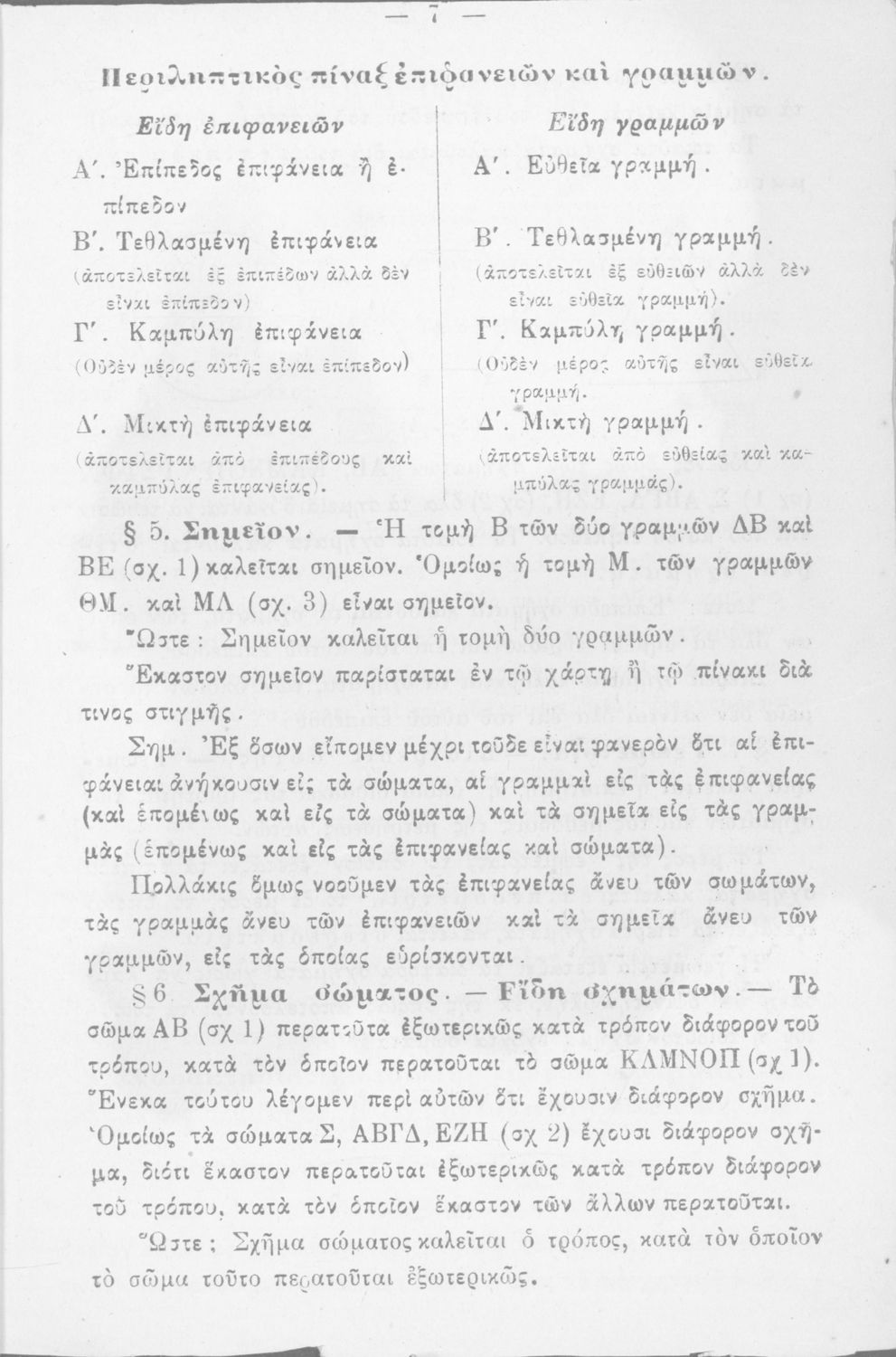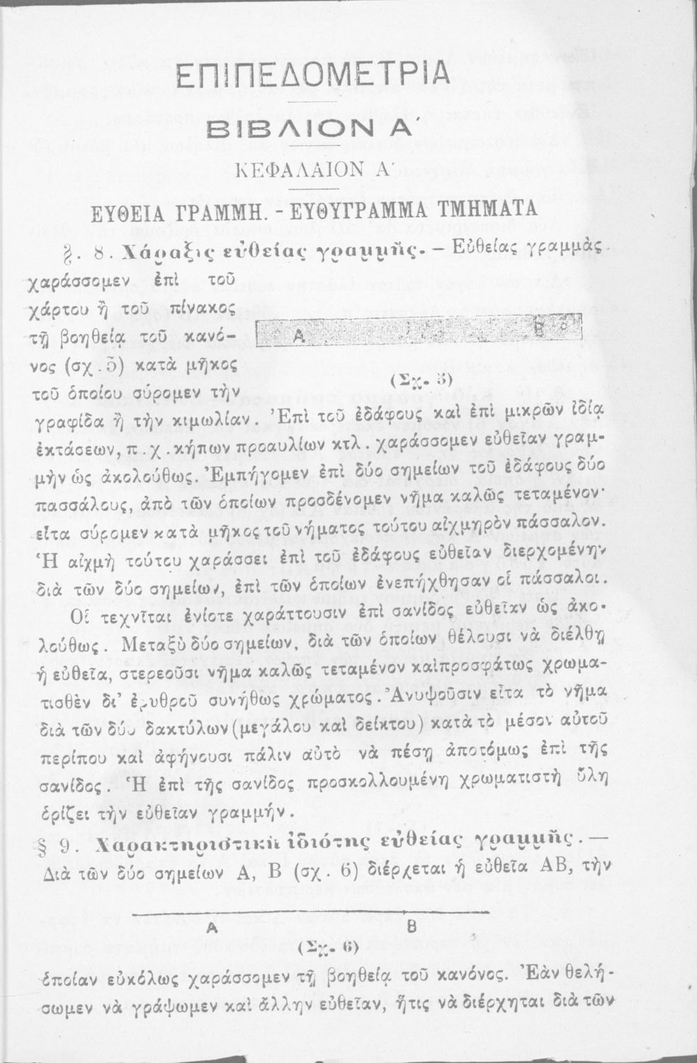 Σχολικό εγχειρίδιο Γεωμετρίας για τα Ελληνικά και Αστικά Σχολεία χωρισμένο σε Επιπεδομετρία και Στερεομετρία. Περιλαμβάνει προβλήματα και στοιχεία χωρομετρίας.