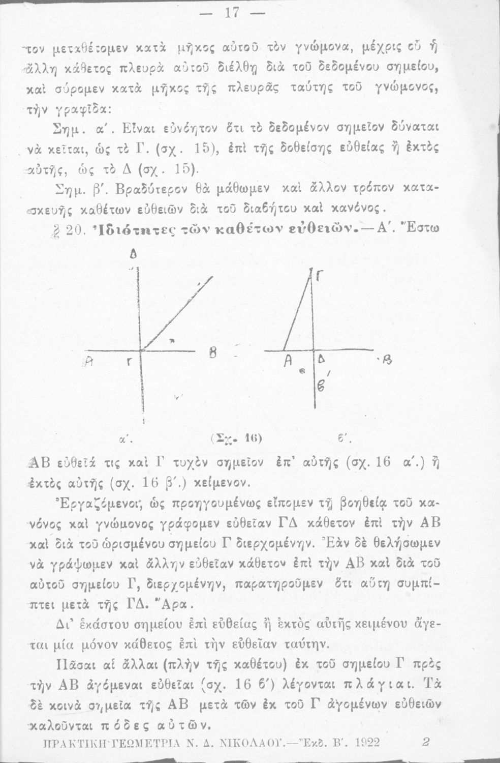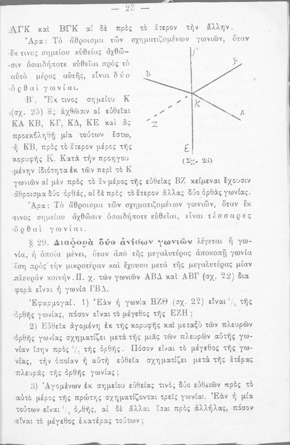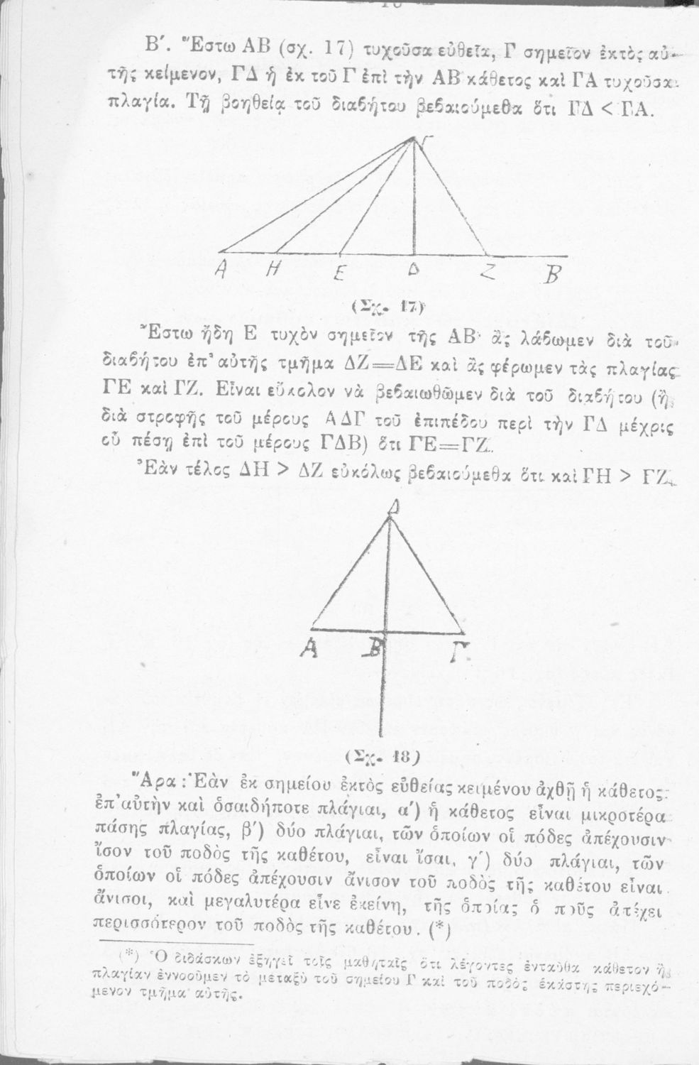 Σχολικό εγχειρίδιο Γεωμετρίας για τα Ελληνικά και Αστικά Σχολεία χωρισμένο σε Επιπεδομετρία και Στερεομετρία. Περιλαμβάνει προβλήματα και στοιχεία χωρομετρίας.
