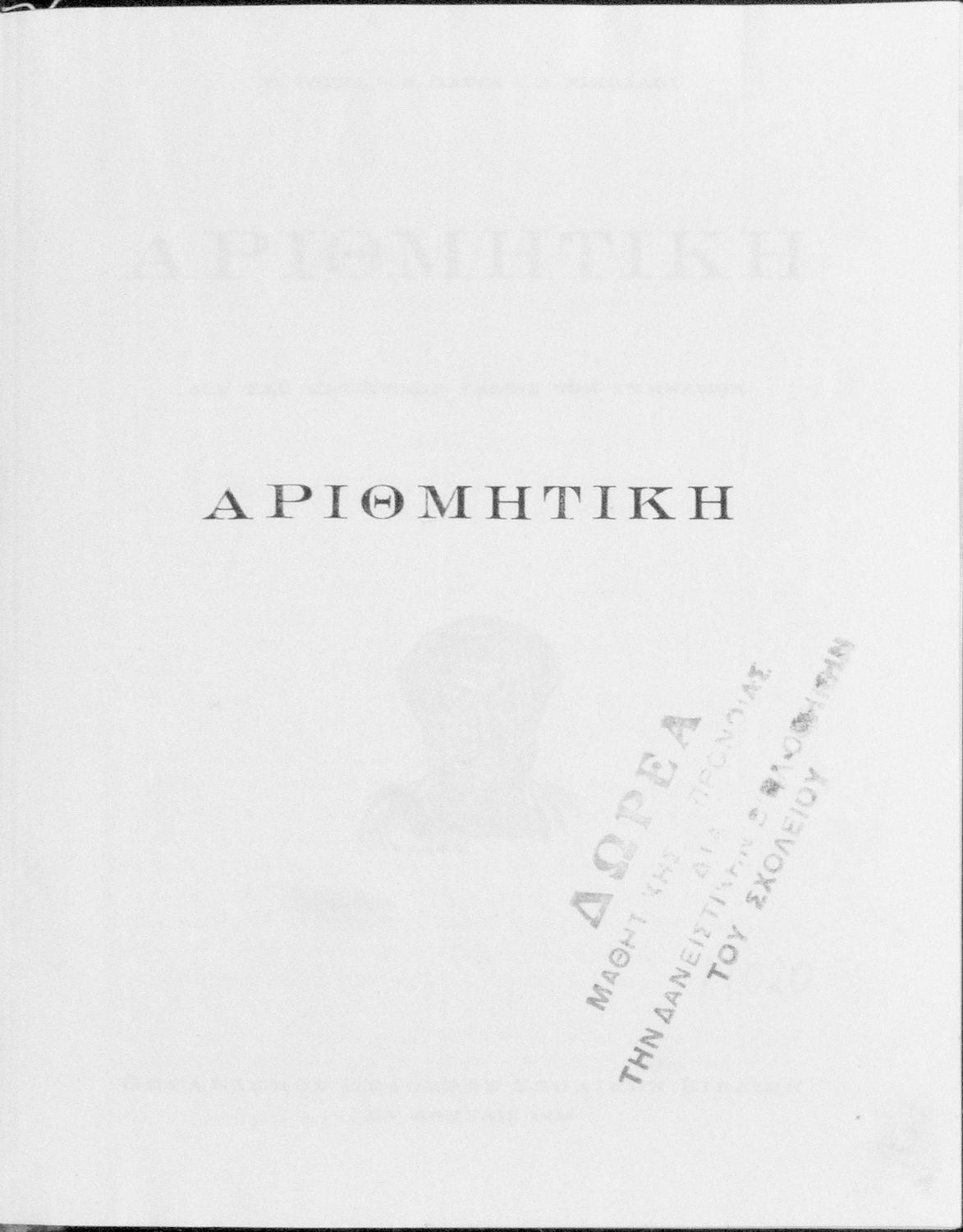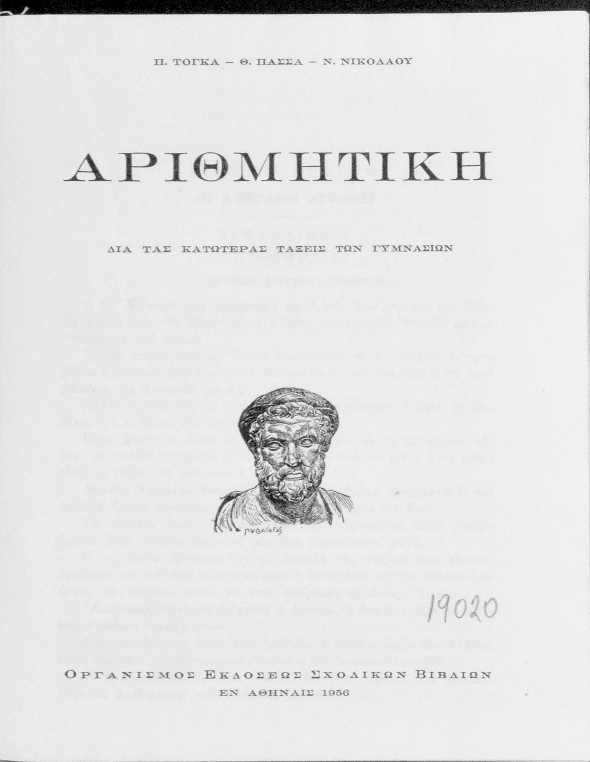 Κωδικός αναγνώρισης: 01-19020 Τίτλος: Αριθμητική δια τας κατωτέρας τάξεις των Γυμνασίων Συγγραφέας: Π. Τόγκας, Θ. Πασσάς, Ν. Νικολάου, Δ. Κάρτσωνας (επιμέλεια) Μέγεθος και υπόστρωμα: Σχολικό εγχειρίδιο, 20εκ., σκληρό εξώφυλλο, 379 σελίδες. |