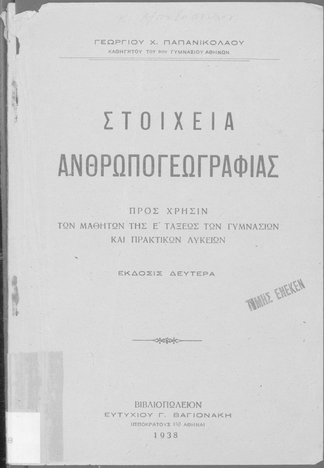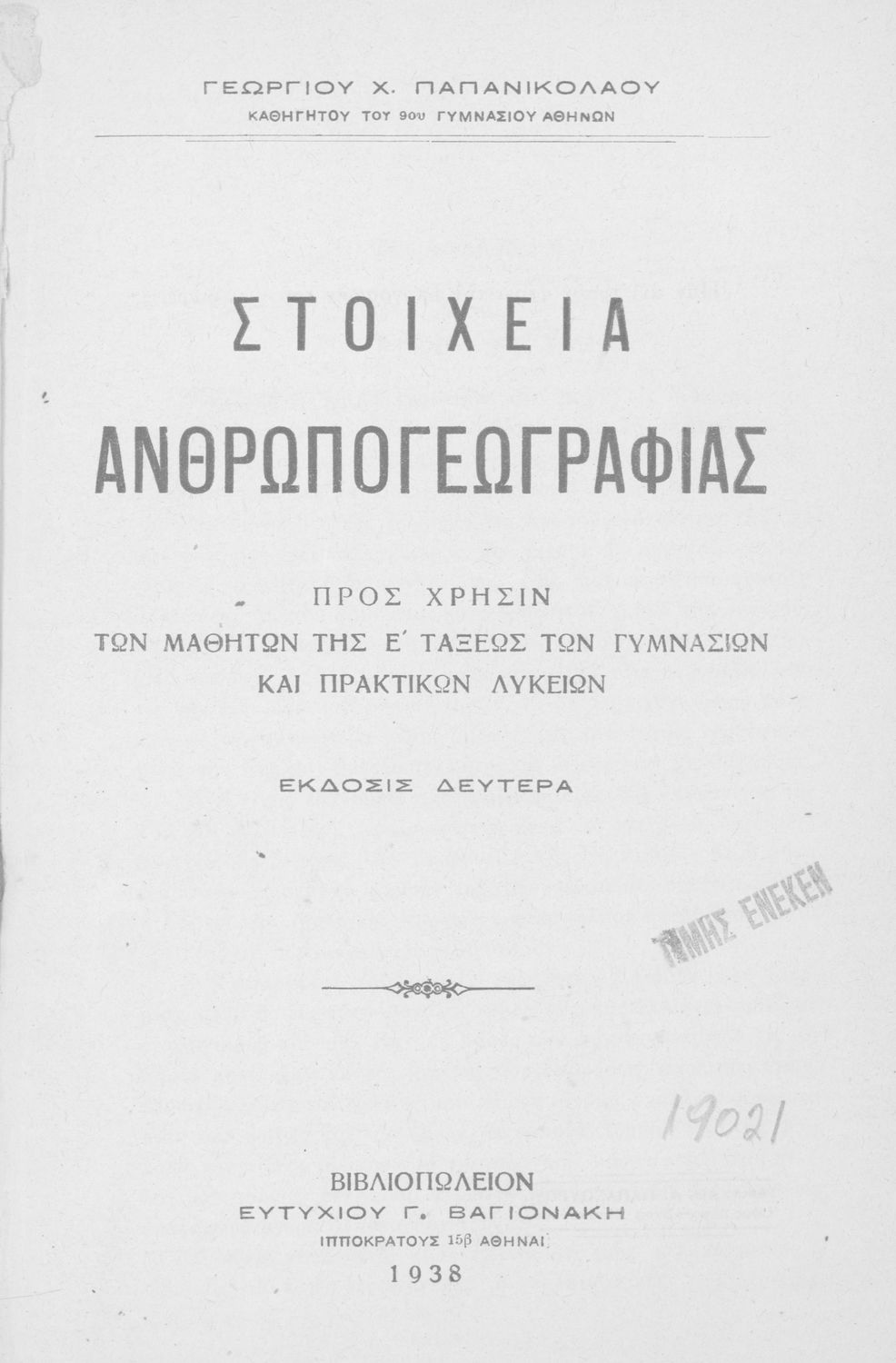 Εκδότης: Ευτύχιος Γ. Βαγιονάκης Έτος έκδοσης: 1938 Τόπος έκδοσης: Αθήνα Έκδοση: 2η |
