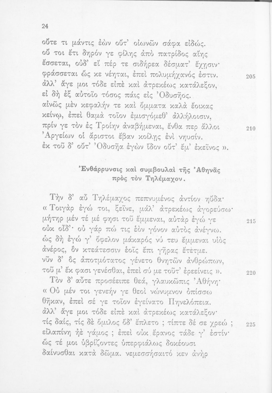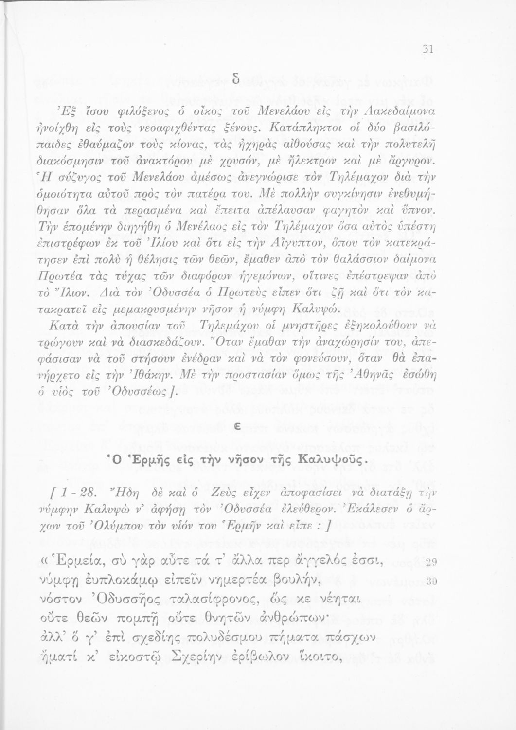 Σχολικό εγχειρίδιο του Γυμνάσιου για το μάθημα των Αρχαίων Ελληνικών. Περιέχει ραψωδίες της Οδύσσειας σε αρχαίο κείμενο, καθώς και τη μετάφραση, τα ερμηνευτικά, πραγματολογικά σχόλια και τις λεξιλογικές παρατηρήσεις των συγγραφέων. Ο συγγραφέας ήταν Καθηγητής στο Κολέγιο Αθηνών. Η συγγραφέας ήταν Καθηγήτρια Φιλόλογος.