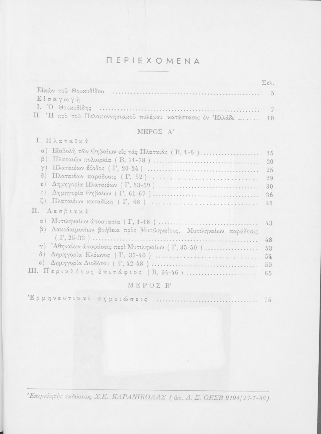 Σχολικό εγχειρίδιο Αρχαίων Ελληνικών Γυμνασίου που περιέχει εισαγωγή στη ζωή και το έργο του Θουκυδίδη, αποσπάσματα από τα Πλαταιϊκά, τα Λεσβιακά και τον Επιτάφιο του Περικλή και ερμηνευτικές σημειώσεις.