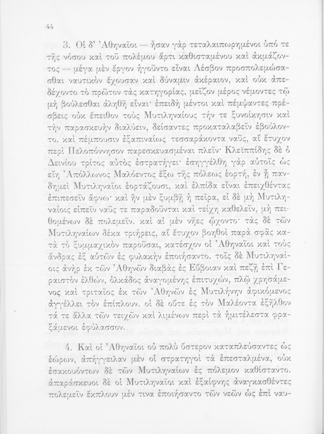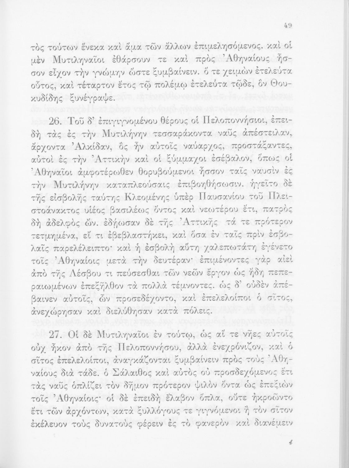 Σχολικό εγχειρίδιο Αρχαίων Ελληνικών Γυμνασίου που περιέχει εισαγωγή στη ζωή και το έργο του Θουκυδίδη, αποσπάσματα από τα Πλαταιϊκά, τα Λεσβιακά και τον Επιτάφιο του Περικλή και ερμηνευτικές σημειώσεις. Φέρει