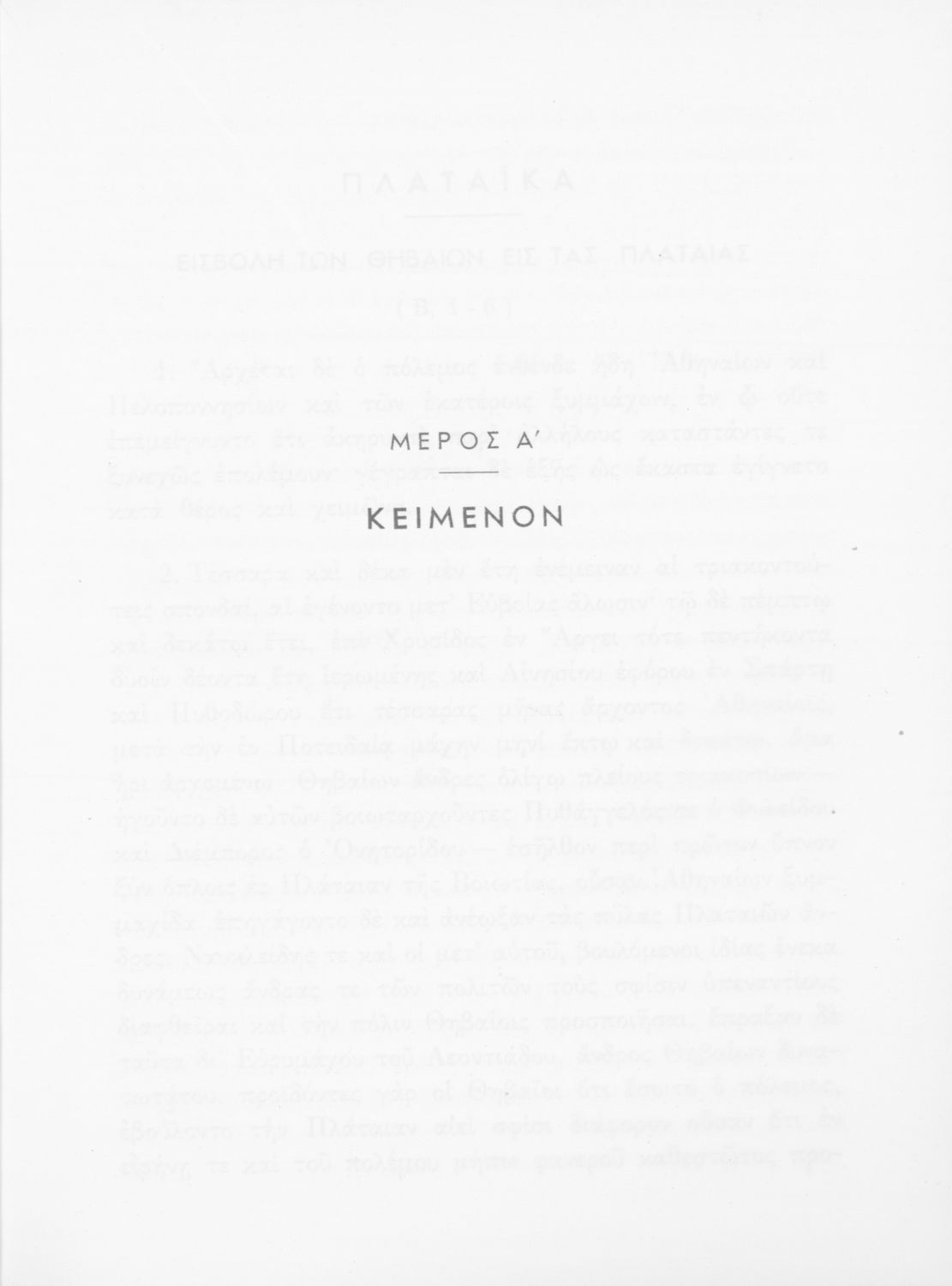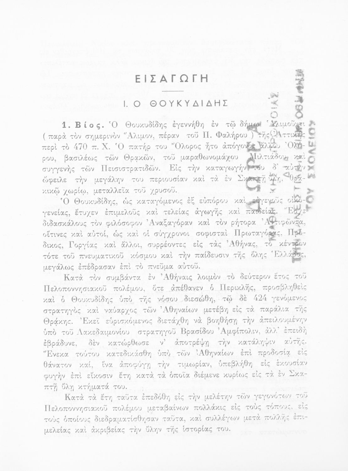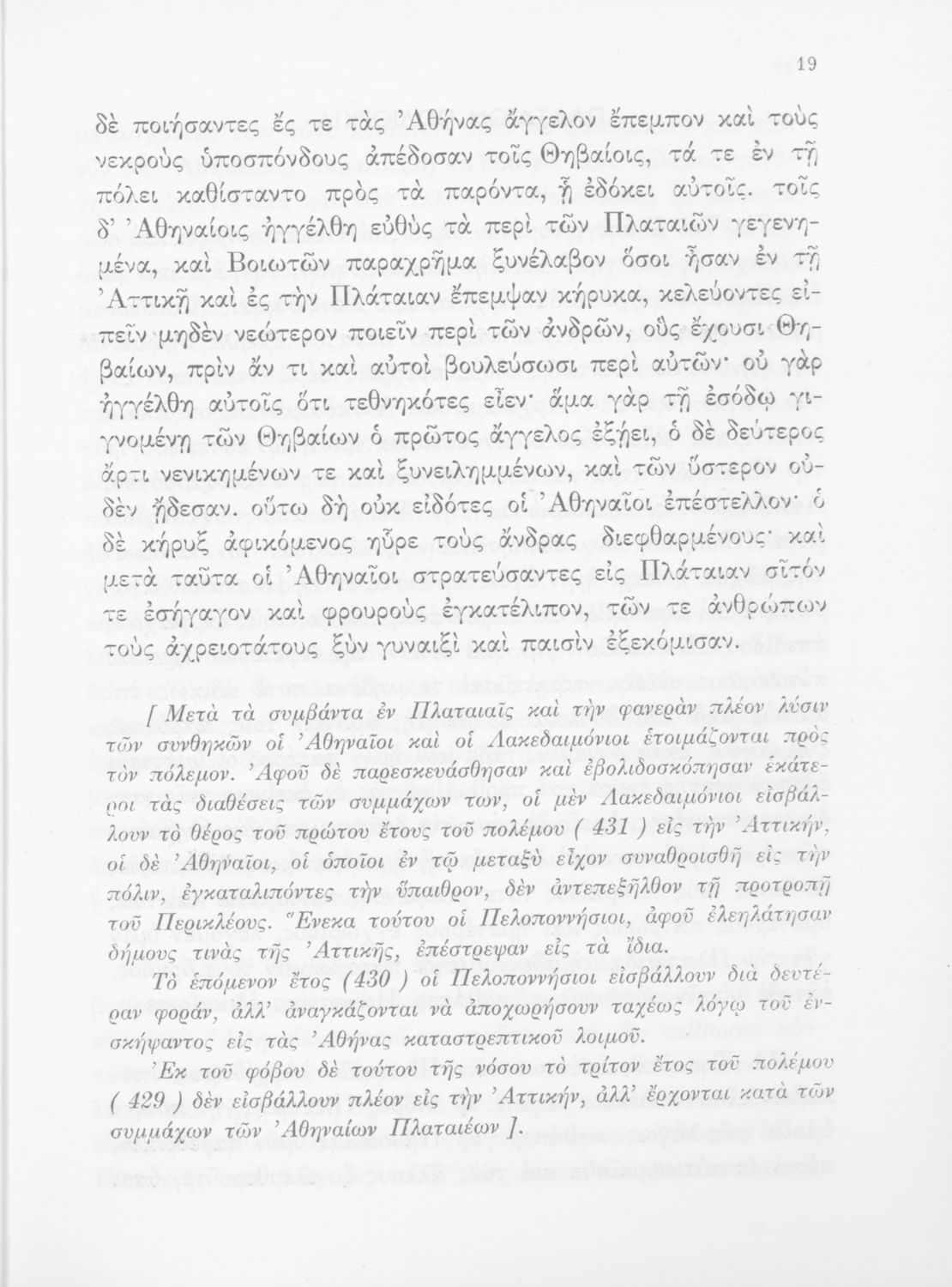 Σχολικό εγχειρίδιο Αρχαίων Ελληνικών Γυμνασίου που περιέχει εισαγωγή στη ζωή και το έργο του Θουκυδίδη, αποσπάσματα από τα Πλαταιϊκά, τα Λεσβιακά και τον Επιτάφιο του Περικλή και ερμηνευτικές σημειώσεις. Φέρει