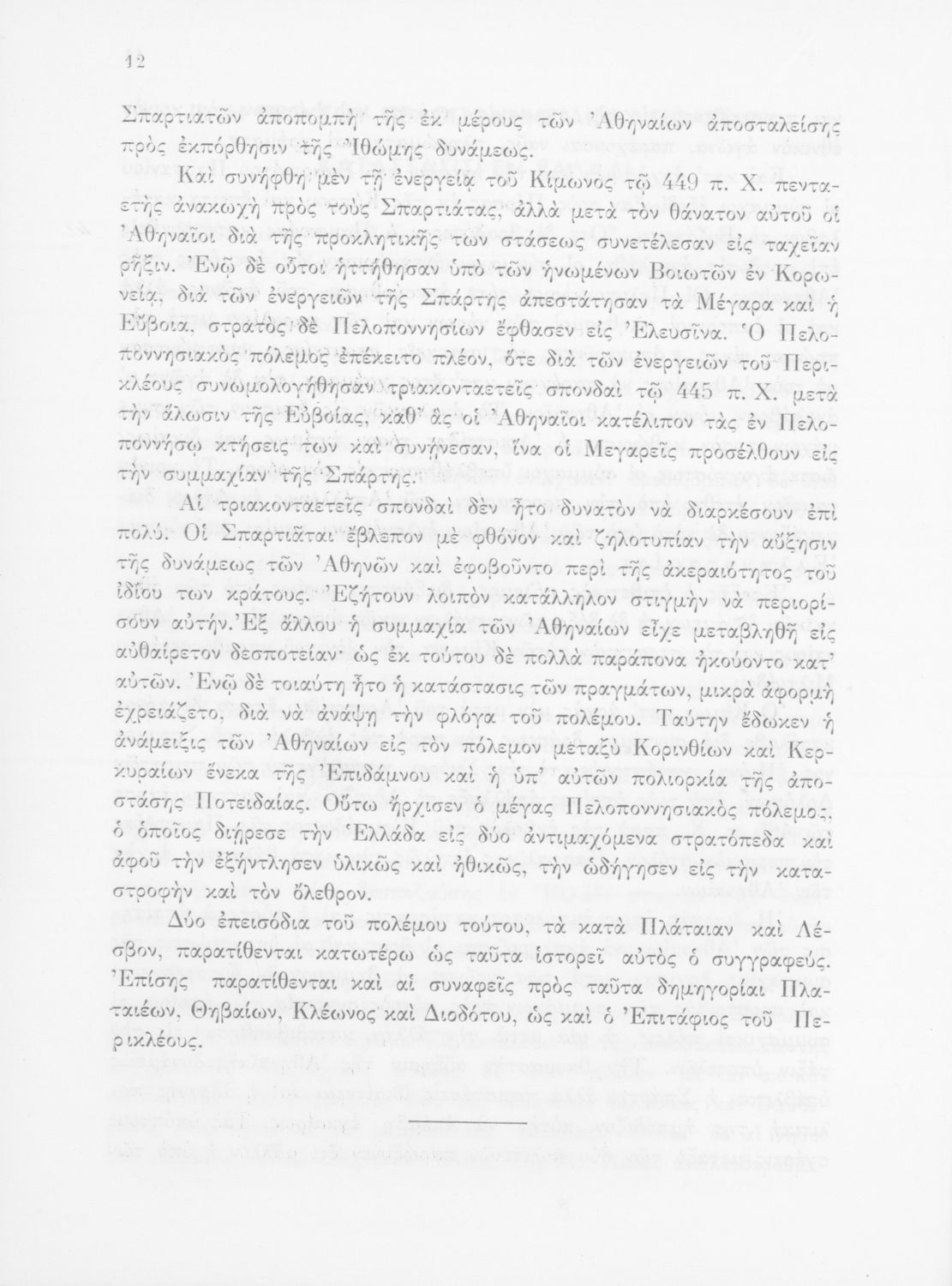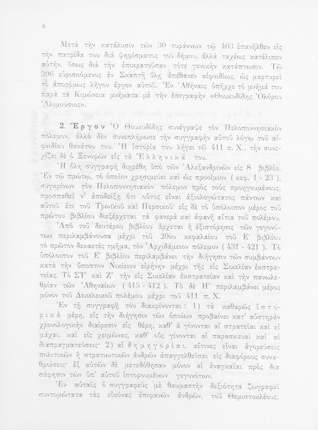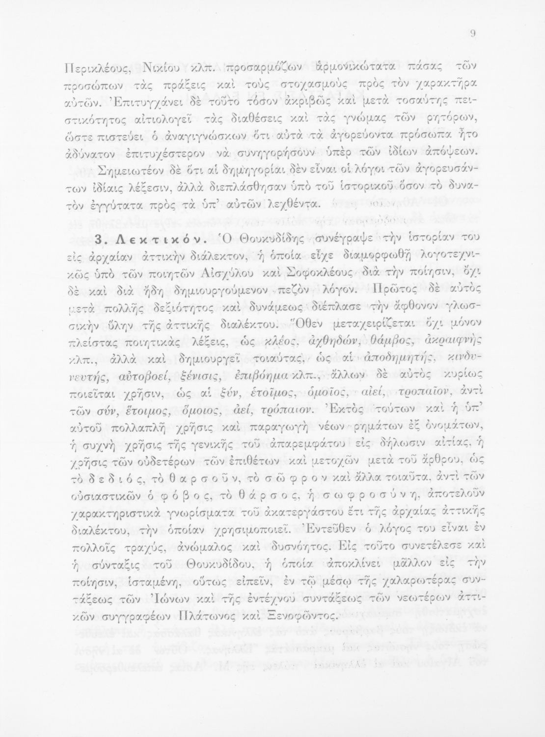 Σχολικό εγχειρίδιο Αρχαίων Ελληνικών Γυμνασίου που περιέχει εισαγωγή στη ζωή και το έργο του Θουκυδίδη, αποσπάσματα από τα Πλαταιϊκά, τα Λεσβιακά και τον Επιτάφιο του Περικλή και ερμηνευτικές σημειώσεις. Φέρει