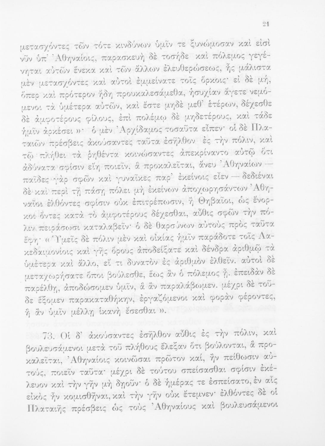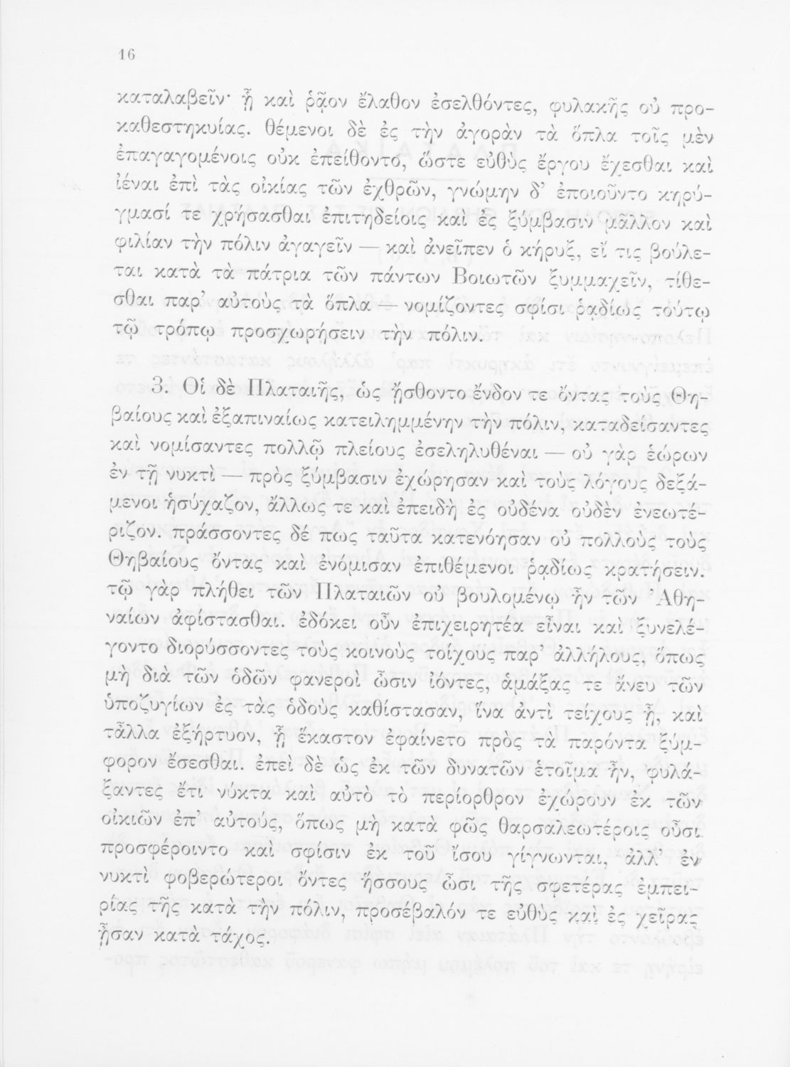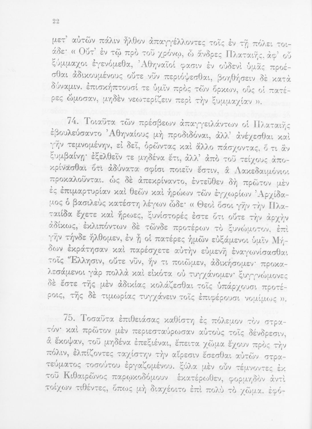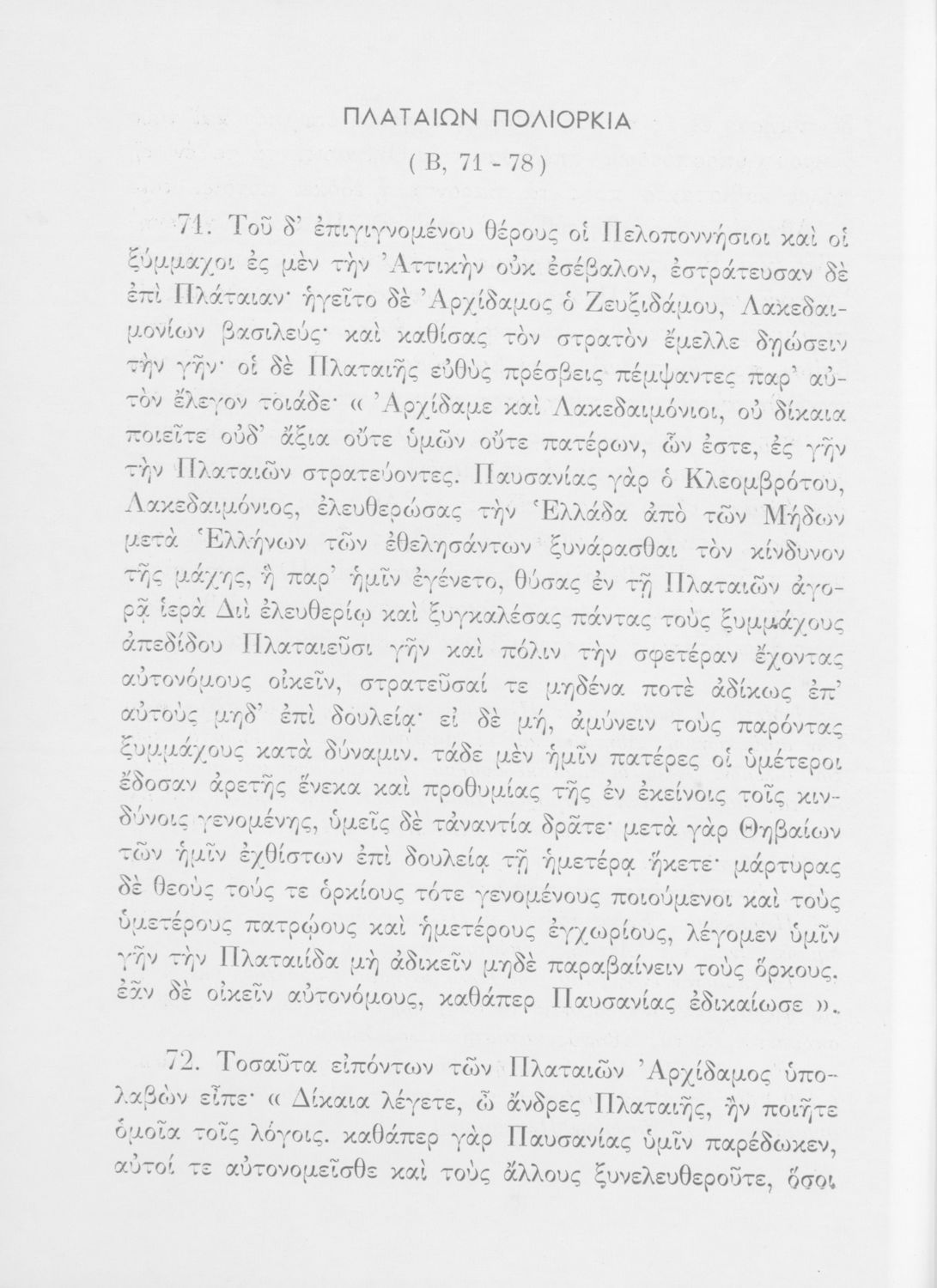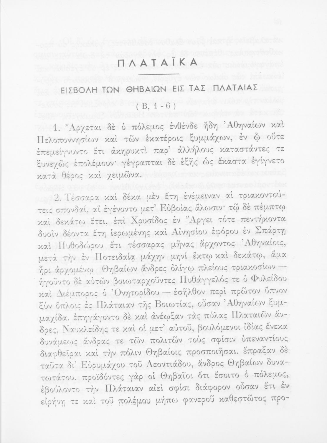 Σχολικό εγχειρίδιο Αρχαίων Ελληνικών Γυμνασίου που περιέχει εισαγωγή στη ζωή και το έργο του Θουκυδίδη, αποσπάσματα από τα Πλαταιϊκά, τα Λεσβιακά και τον Επιτάφιο του Περικλή και ερμηνευτικές σημειώσεις.