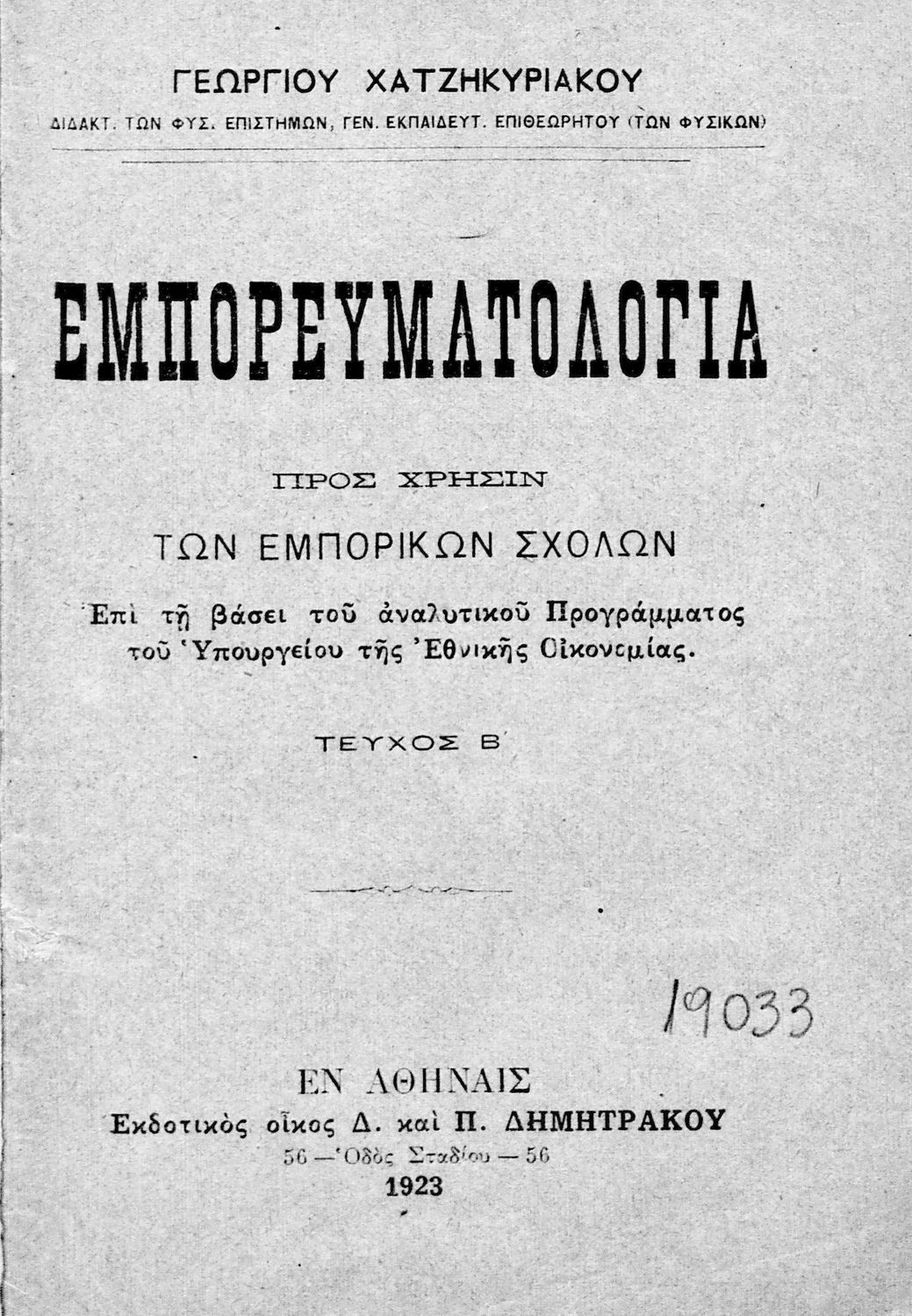 Κωδικός αναγνώρισης: 01-19033 Τίτλος: Εμπορευματολογία Β΄ τεύχος Συγγραφέας: Γεώργιος Χατζηκυριάκος Μέγεθος και υπόστρωμα: Σχολικό εγχειρίδιο, 17εκ., σκληρό εξώφυλλο, 162 σελίδες. |
