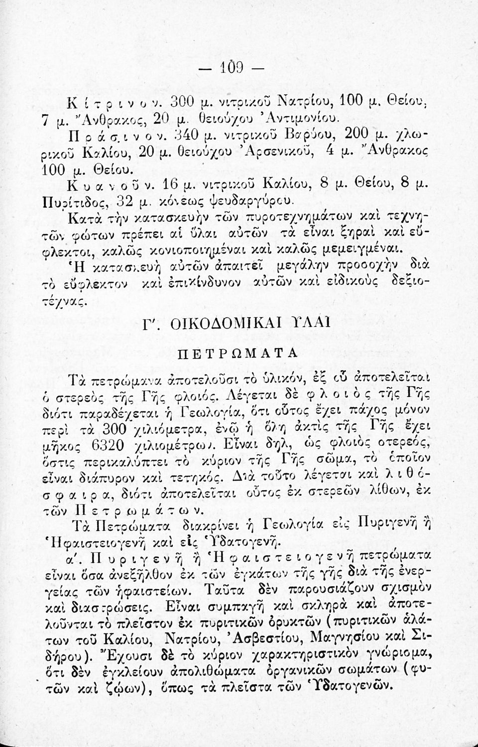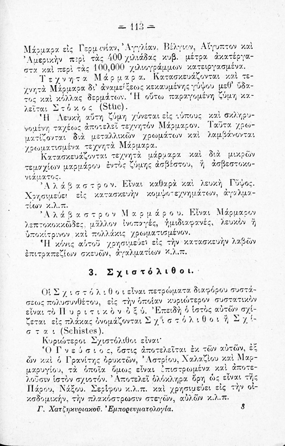 Σχολικό εγχειρίδιο Εμπορευματολογίας για τους μαθητές των Εμπορικών Σχολών που παρουσιάζει τα μέταλλα, τα οξέα, τα άλατα, τα χημικά χρώματα, τις εκρηκτικές, οικοδομικές και καύσιμες ύλες.
