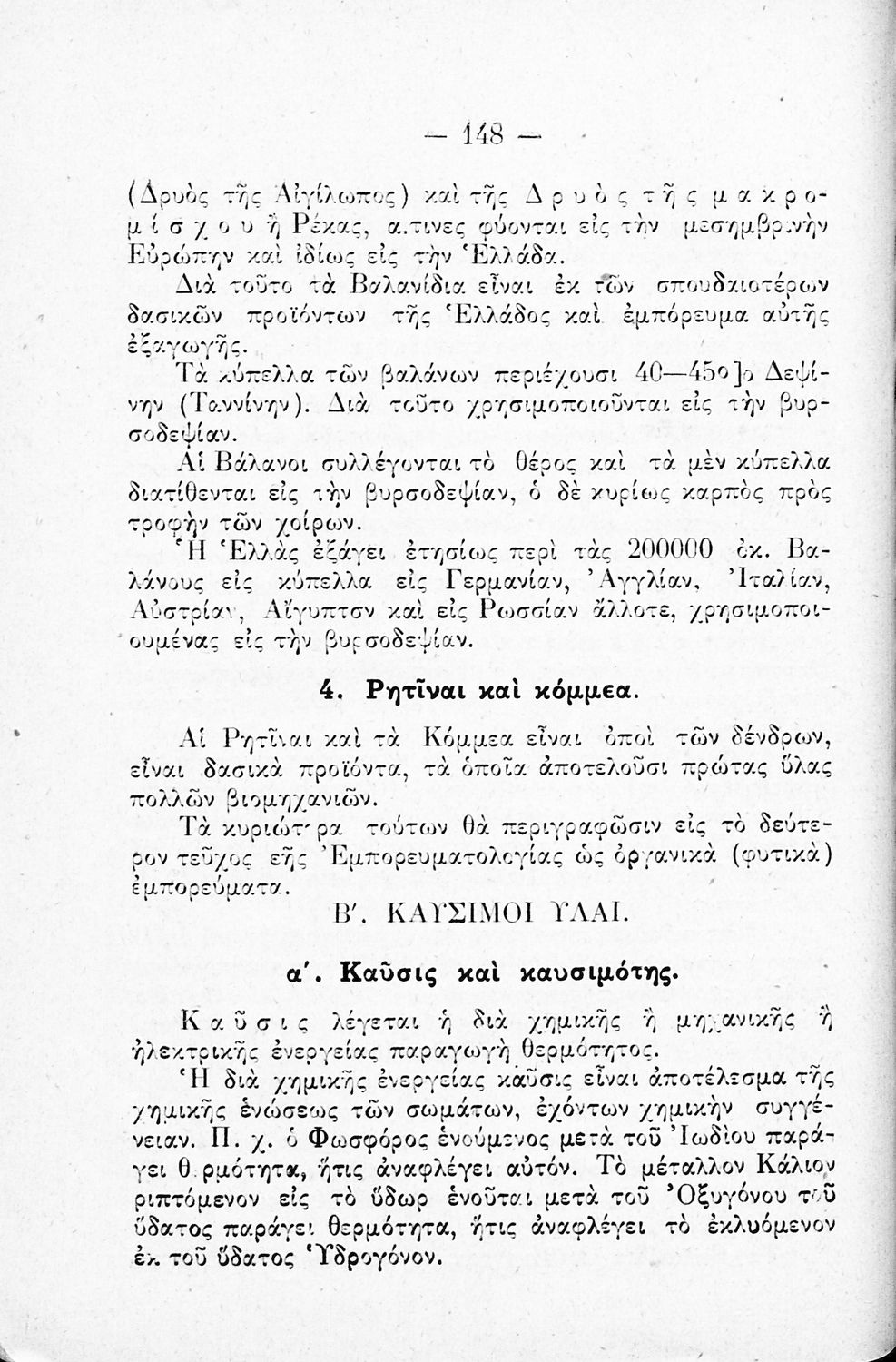 Βαθμίδα εκπαίδευσης: Δευτεροβάθμια Μάθημα: Εμπορευματολογία Γλώσσα: Καθαρεύουσα Παρουσίαση περιεχομένου: Σχολικό εγχειρίδιο Εμπορευματολογίας για τους μαθητές των Εμπορικών Σχολών που παρουσιάζει τα μέταλλα, τα οξέα, τα άλατα, τα χημικά χρώματα, τις εκρηκτικές, οικοδομικές και καύσιμες ύλες. |