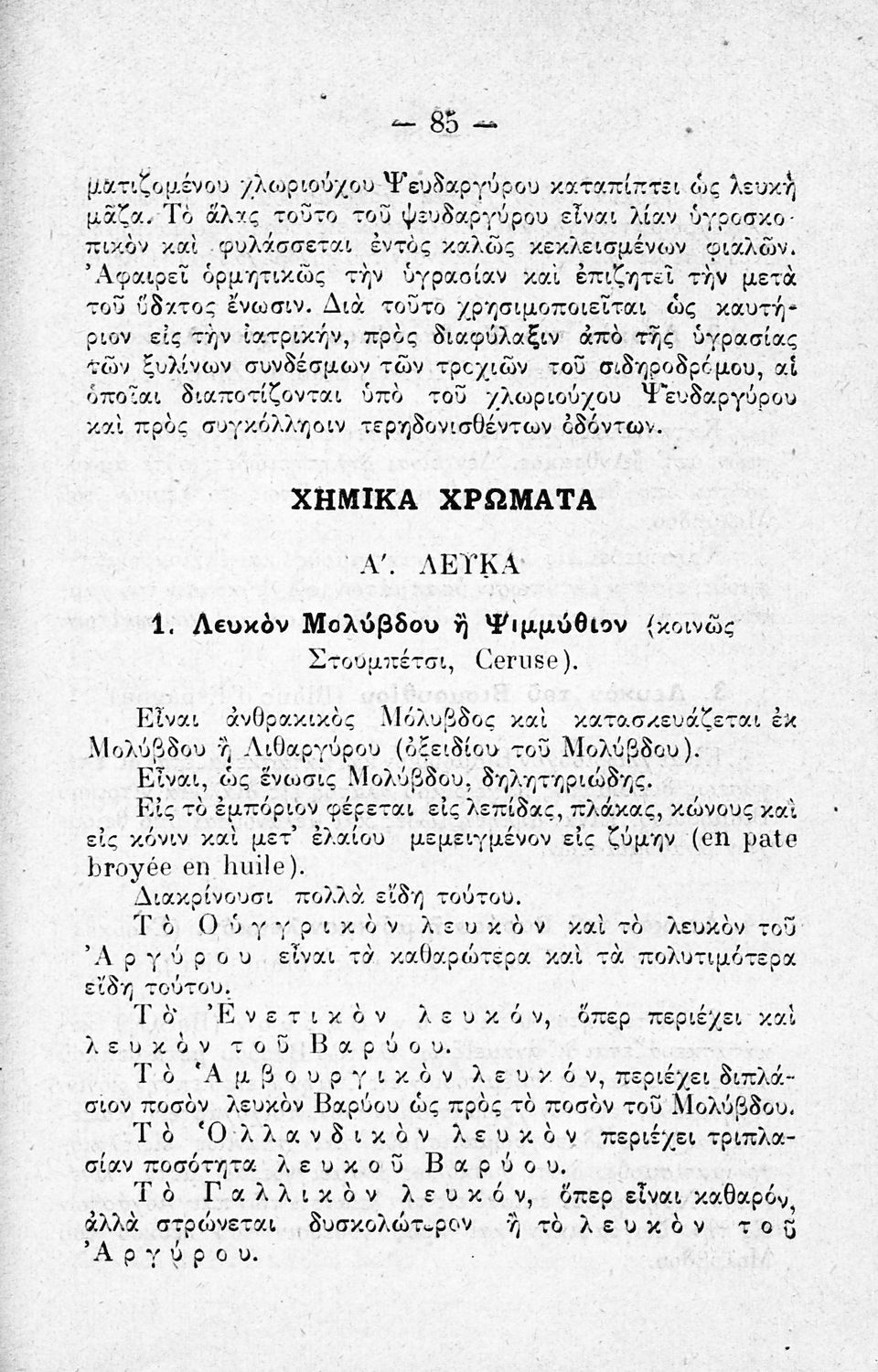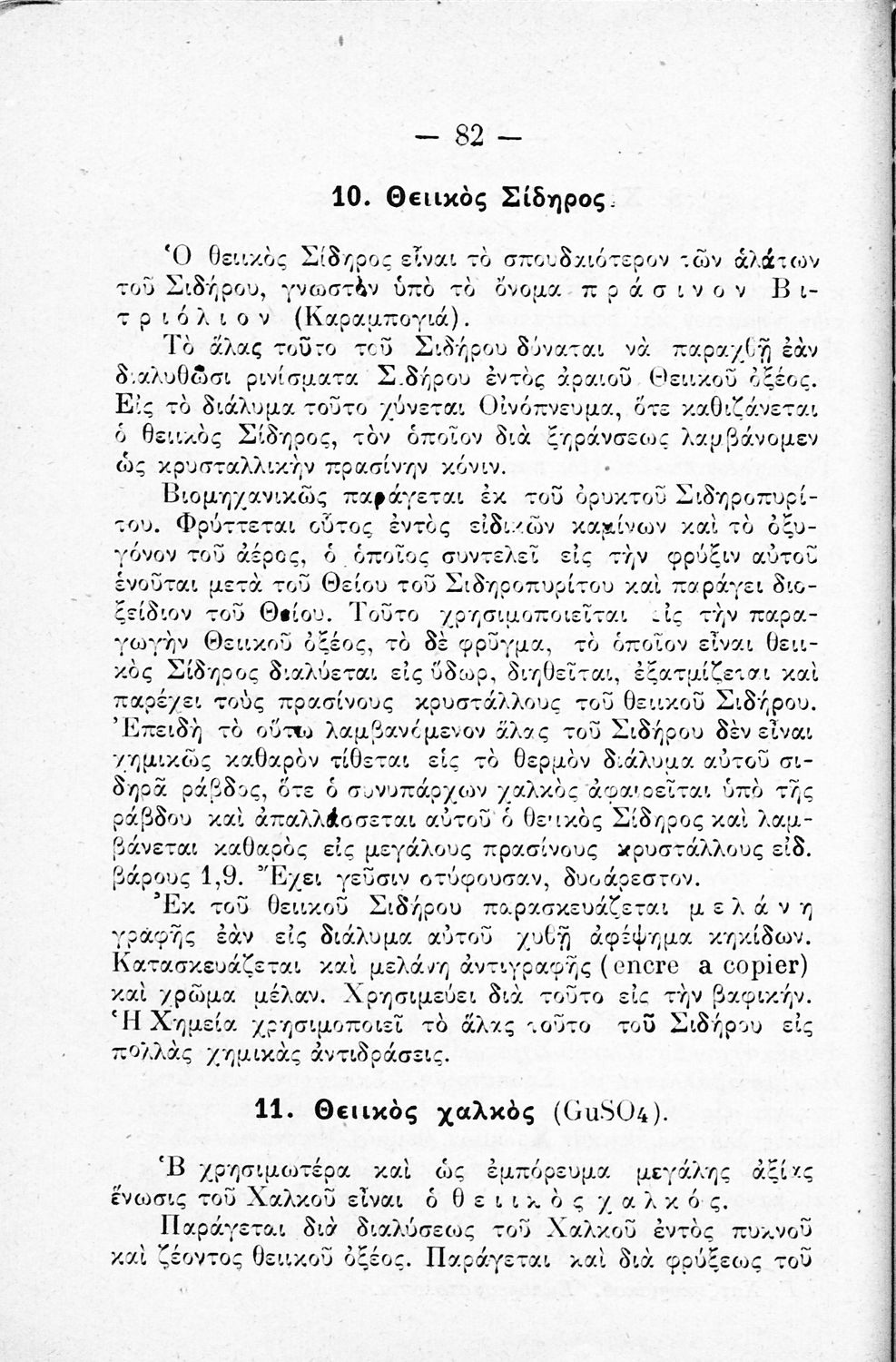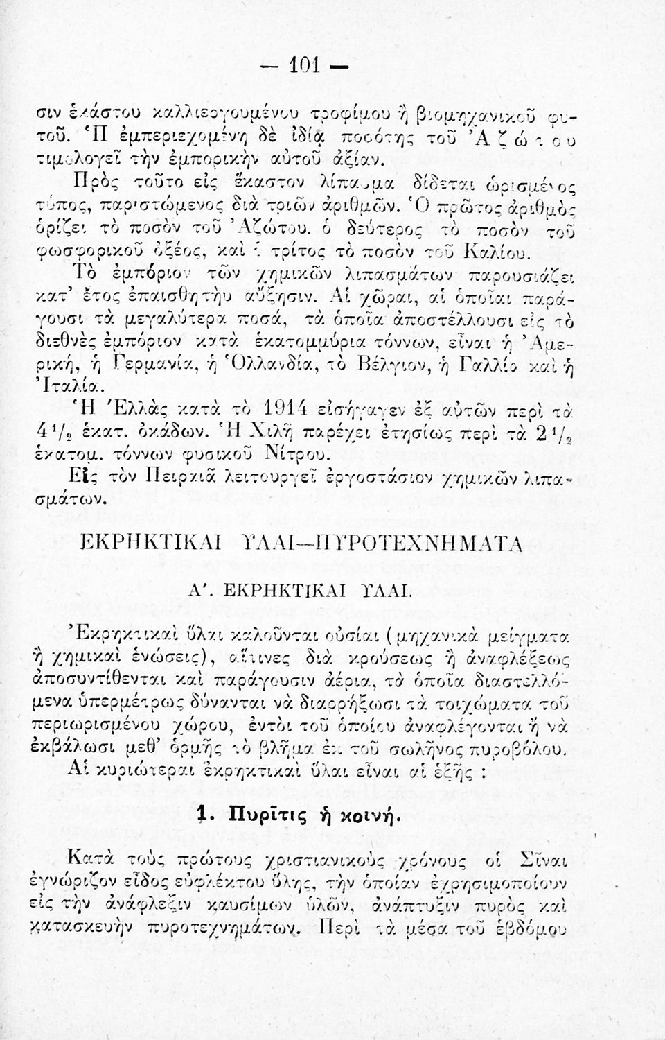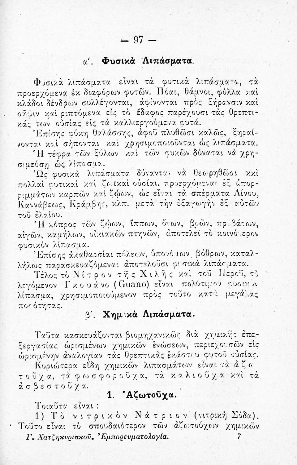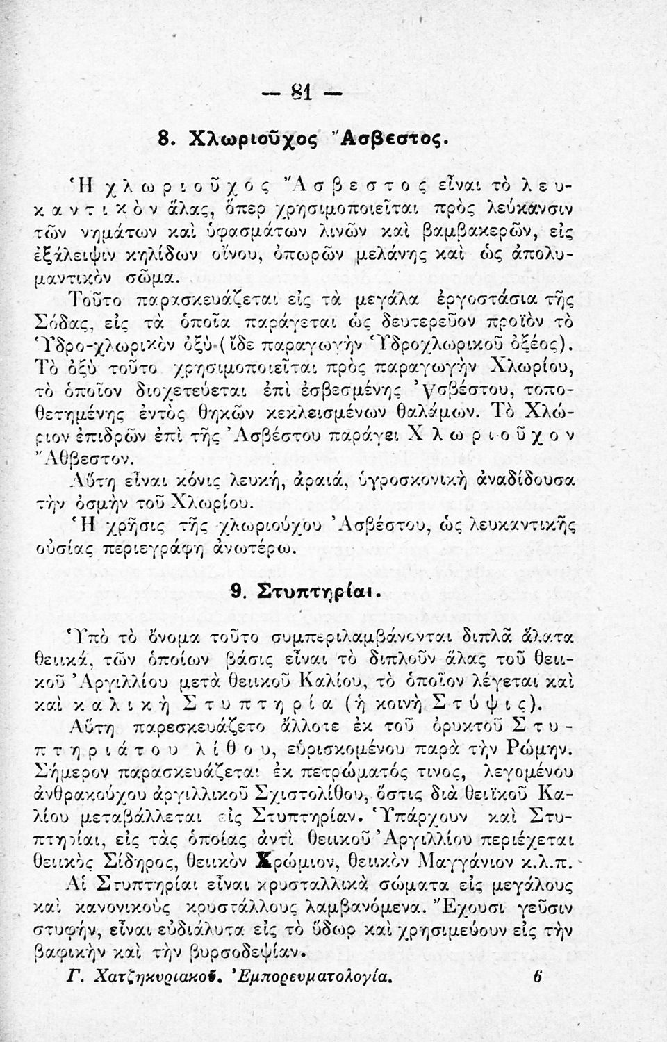 Σχολικό εγχειρίδιο Εμπορευματολογίας για τους μαθητές των Εμπορικών Σχολών που παρουσιάζει τα μέταλλα, τα οξέα, τα άλατα, τα χημικά χρώματα, τις εκρηκτικές, οικοδομικές και καύσιμες ύλες.