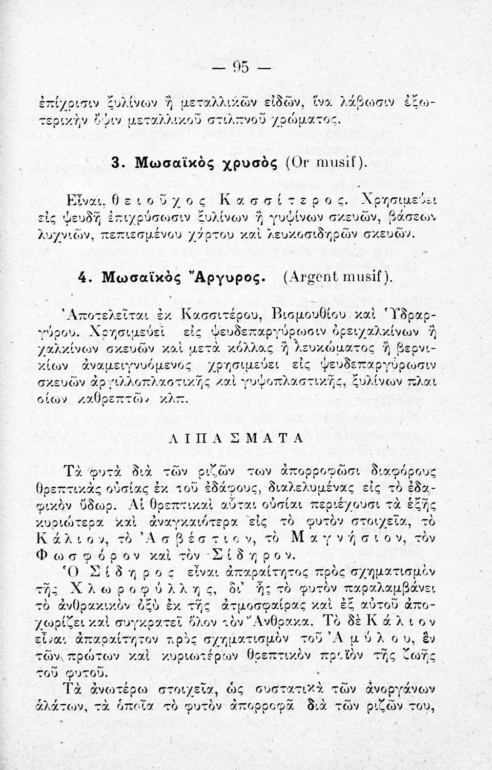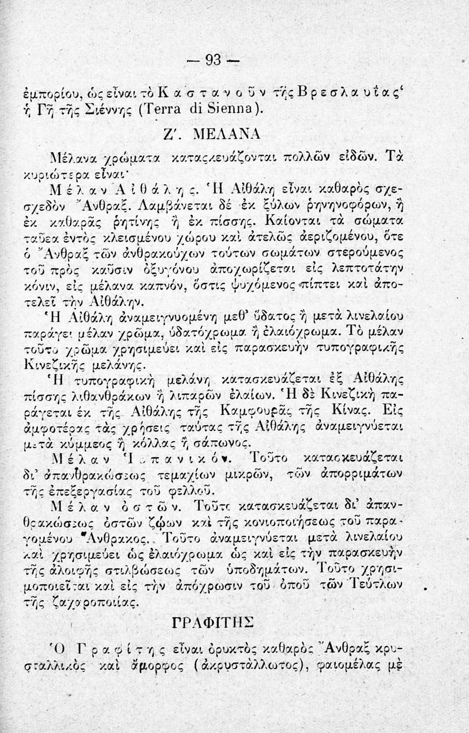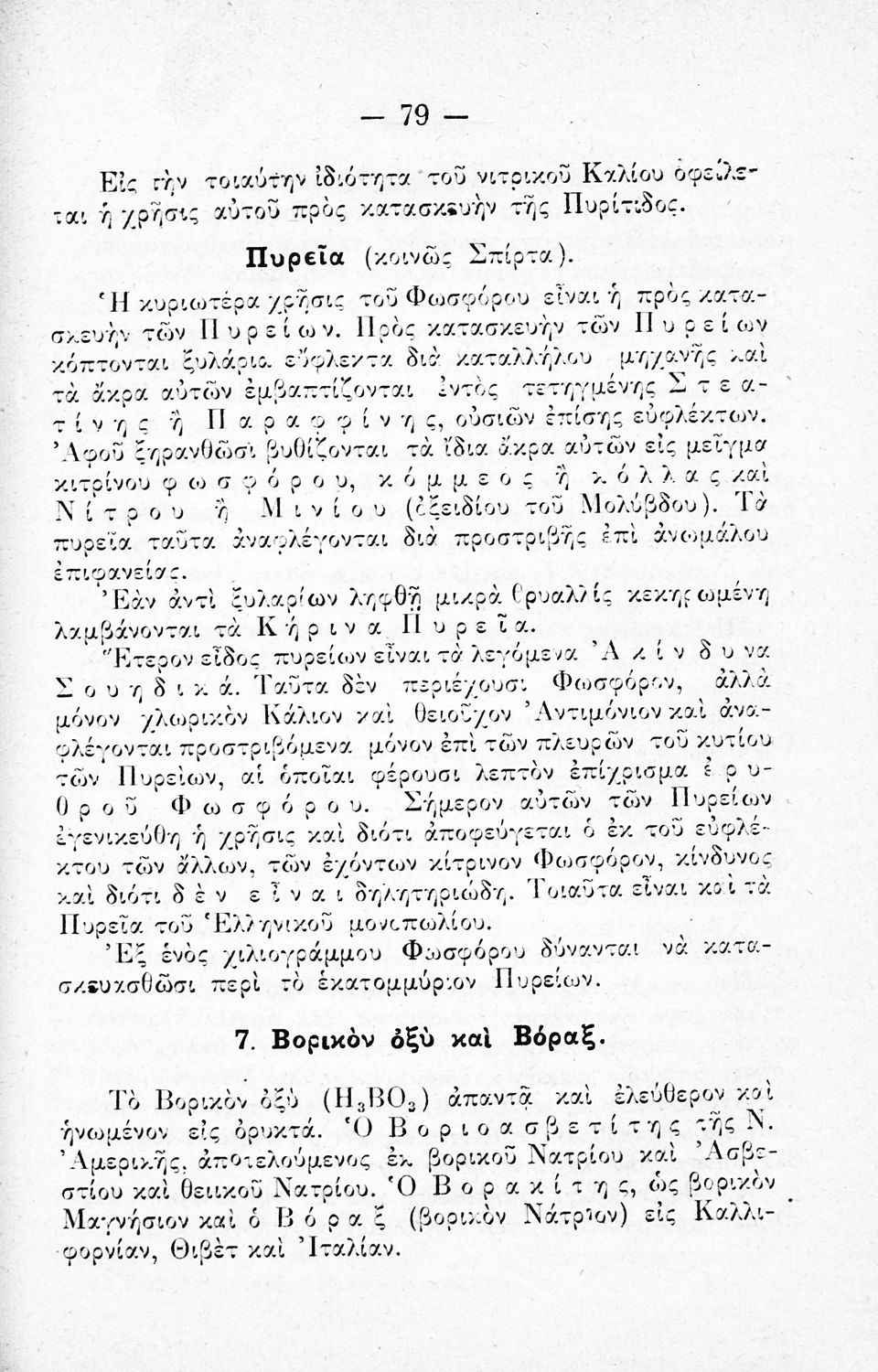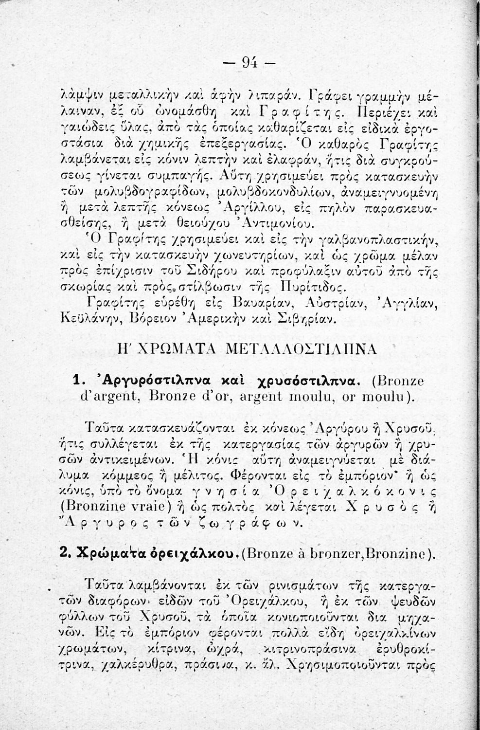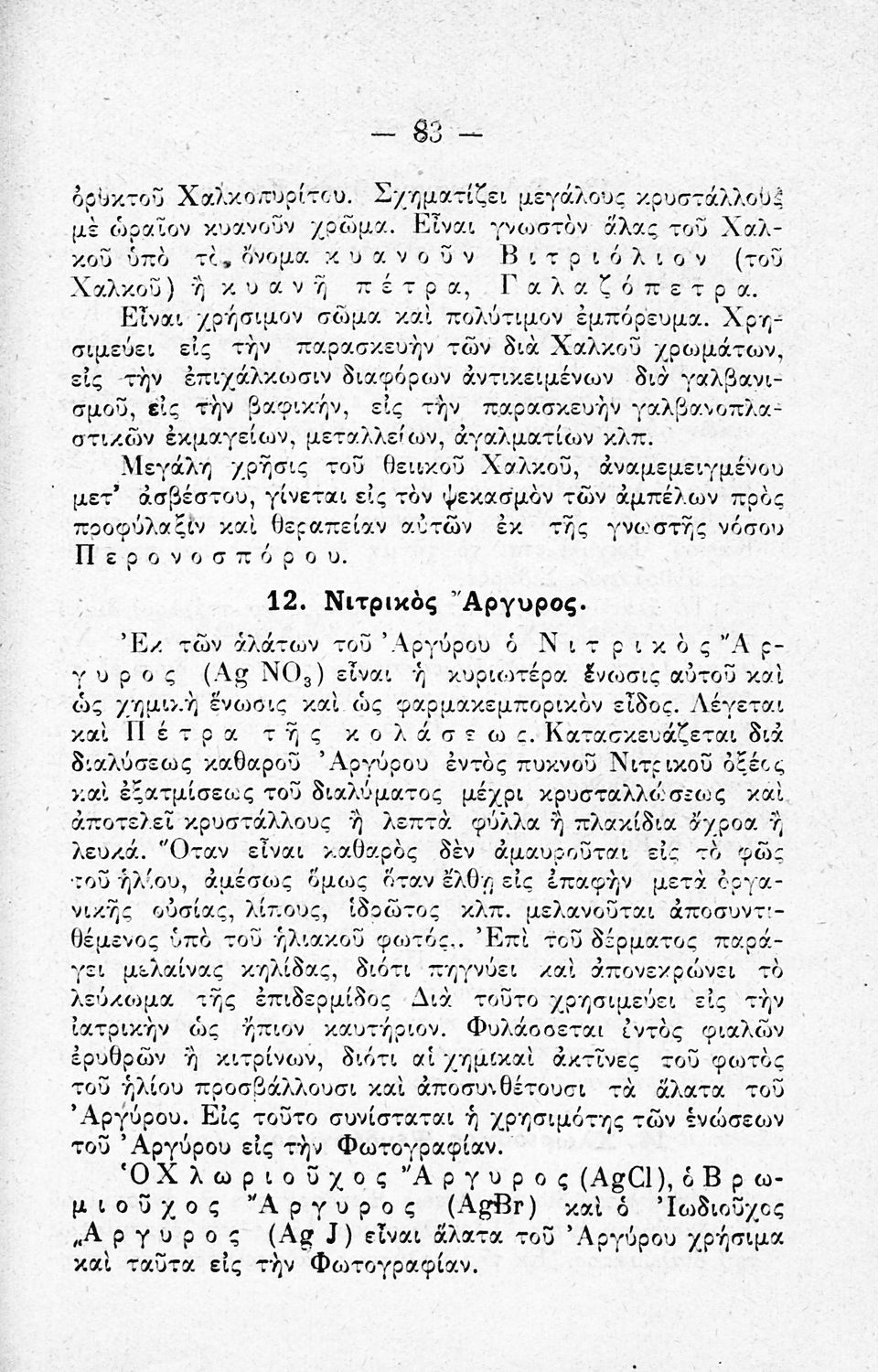 Σχολικό εγχειρίδιο Εμπορευματολογίας για τους μαθητές των Εμπορικών Σχολών που παρουσιάζει τα μέταλλα, τα οξέα, τα άλατα, τα χημικά χρώματα, τις εκρηκτικές, οικοδομικές και καύσιμες ύλες.