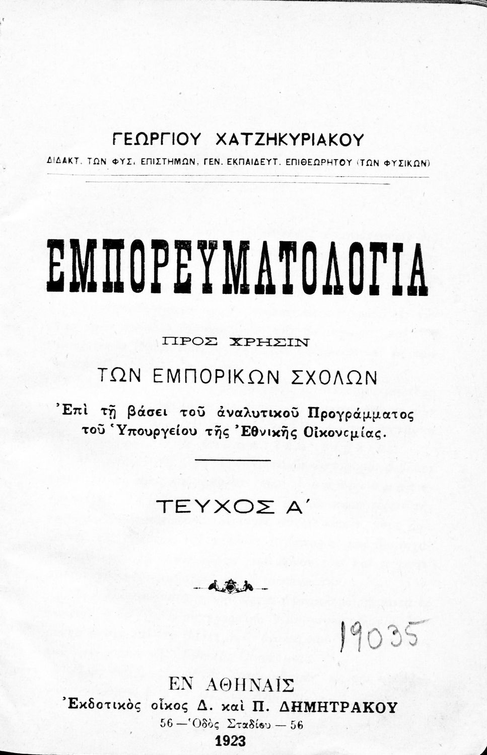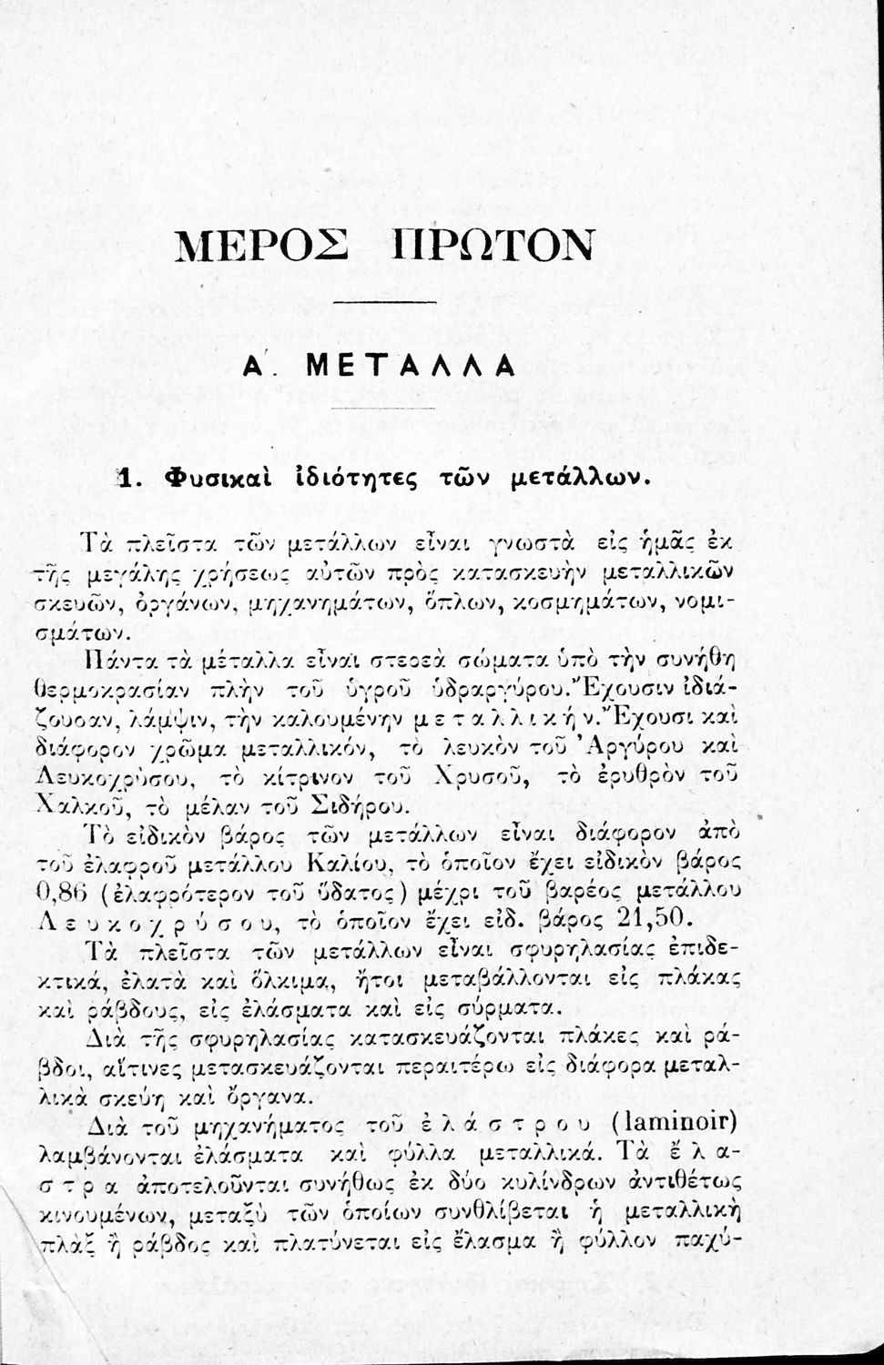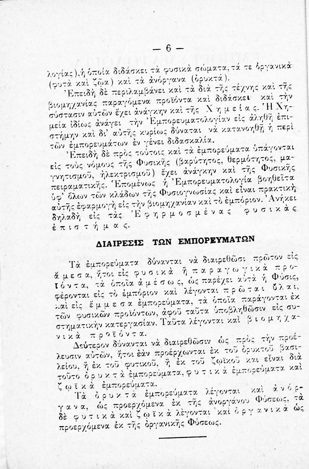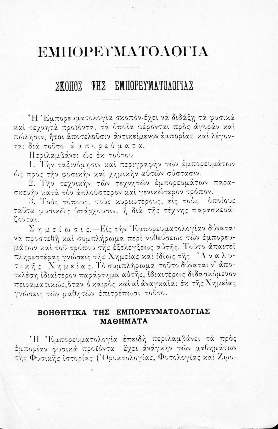 Σχολικό εγχειρίδιο Εμπορευματολογίας για τους μαθητές των Εμπορικών Σχολών που παρουσιάζει τα μέταλλα, τα οξέα, τα άλατα, τα χημικά χρώματα, τις εκρηκτικές, οικοδομικές και καύσιμες ύλες.