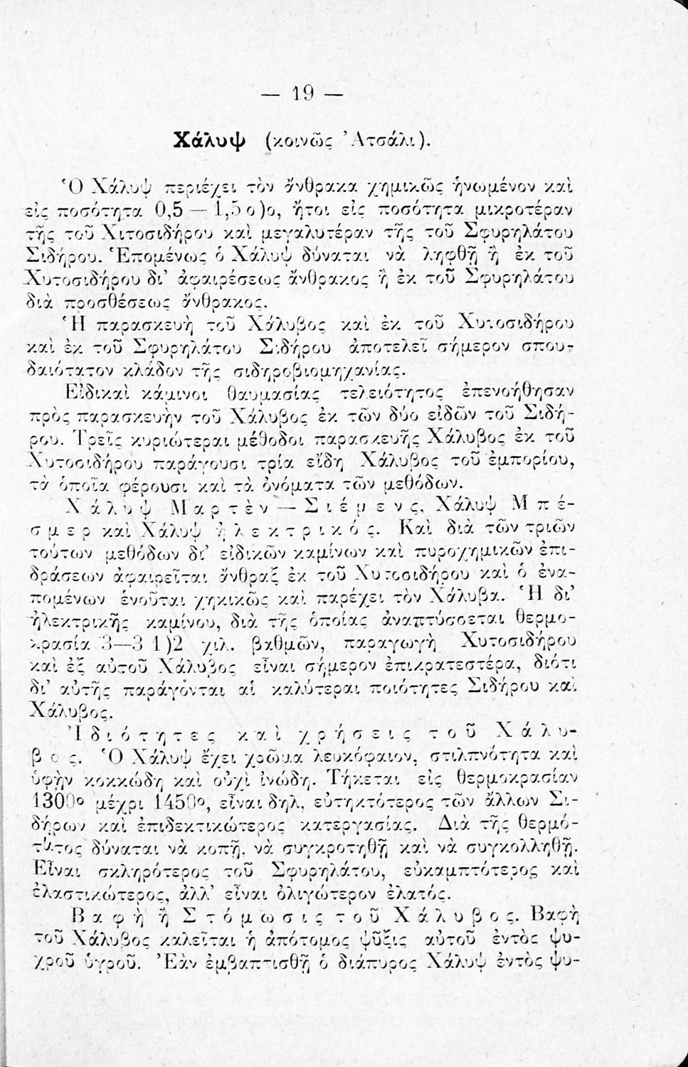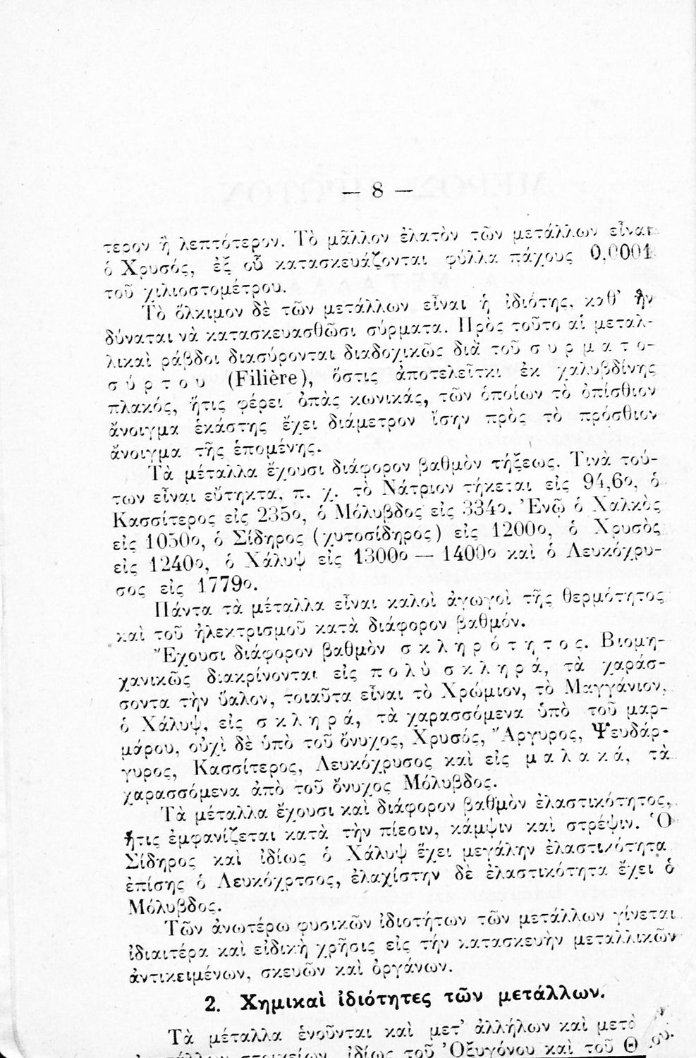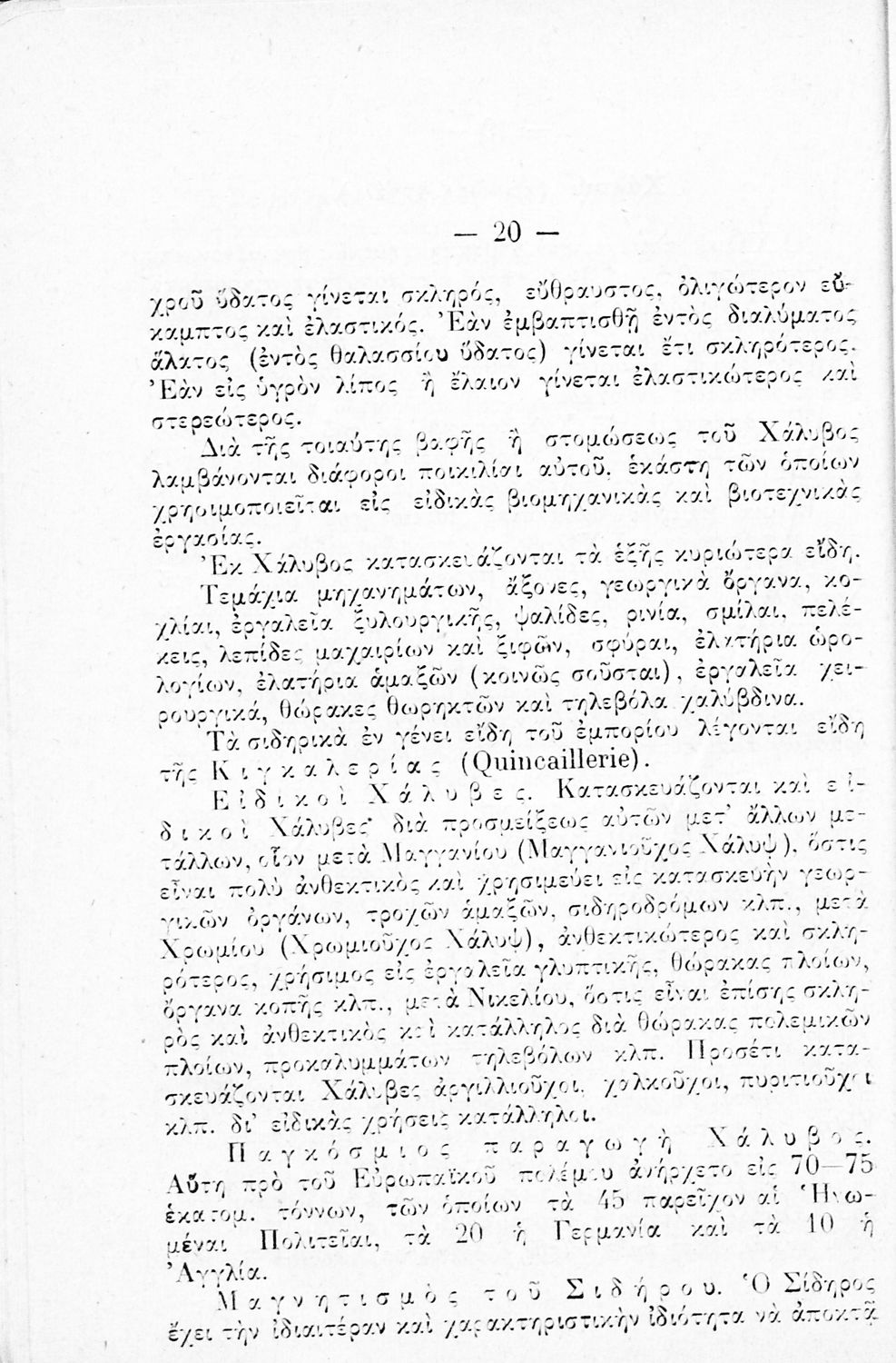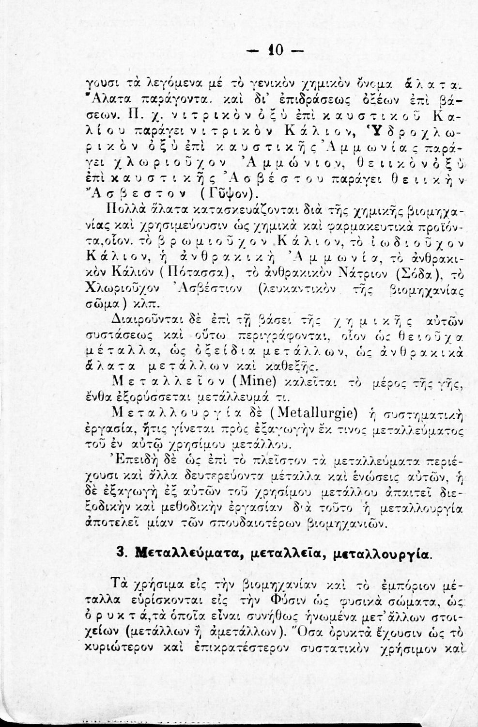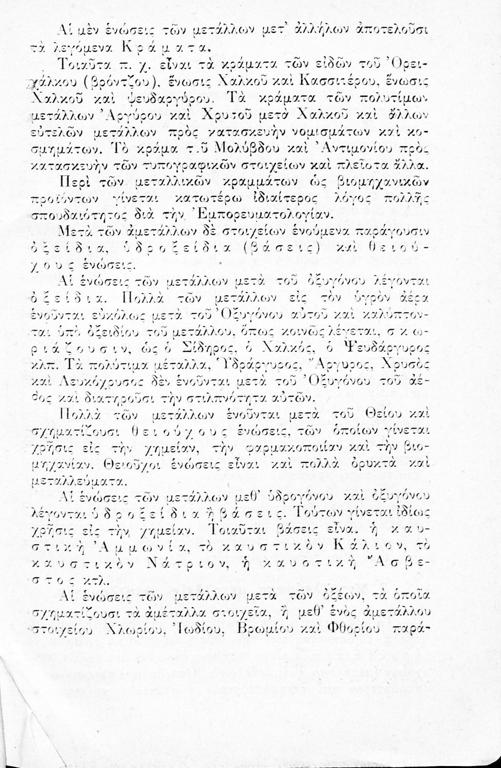 Σχολικό εγχειρίδιο Εμπορευματολογίας για τους μαθητές των Εμπορικών Σχολών που παρουσιάζει τα μέταλλα, τα οξέα, τα άλατα, τα χημικά χρώματα, τις εκρηκτικές, οικοδομικές και καύσιμες ύλες.