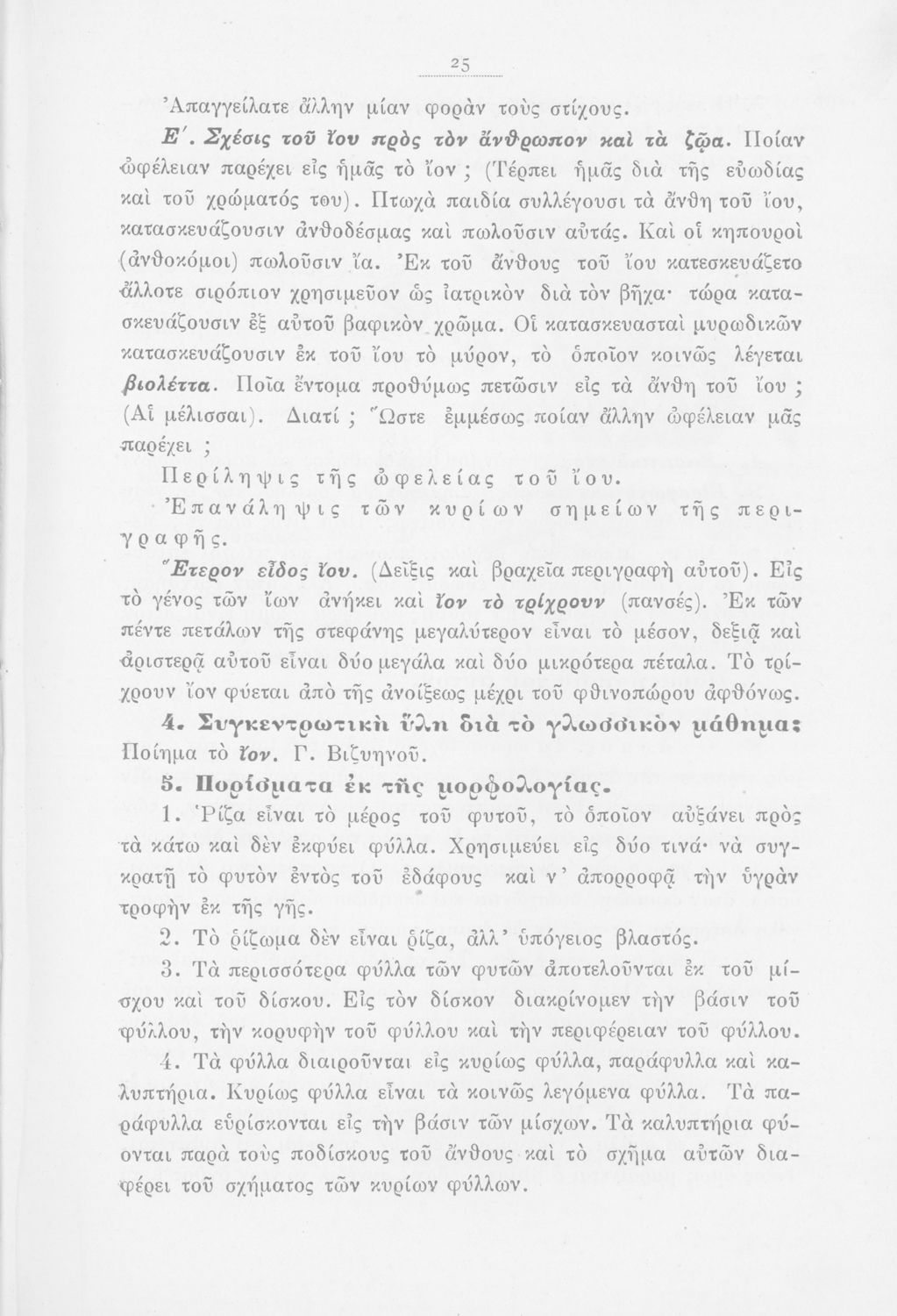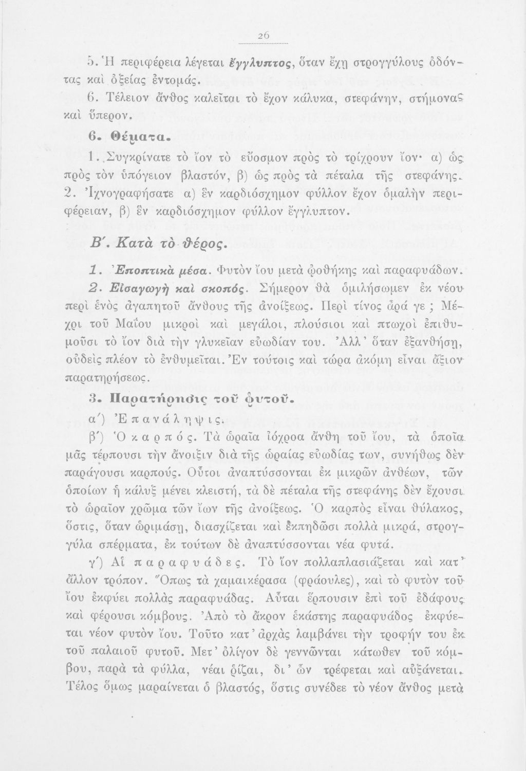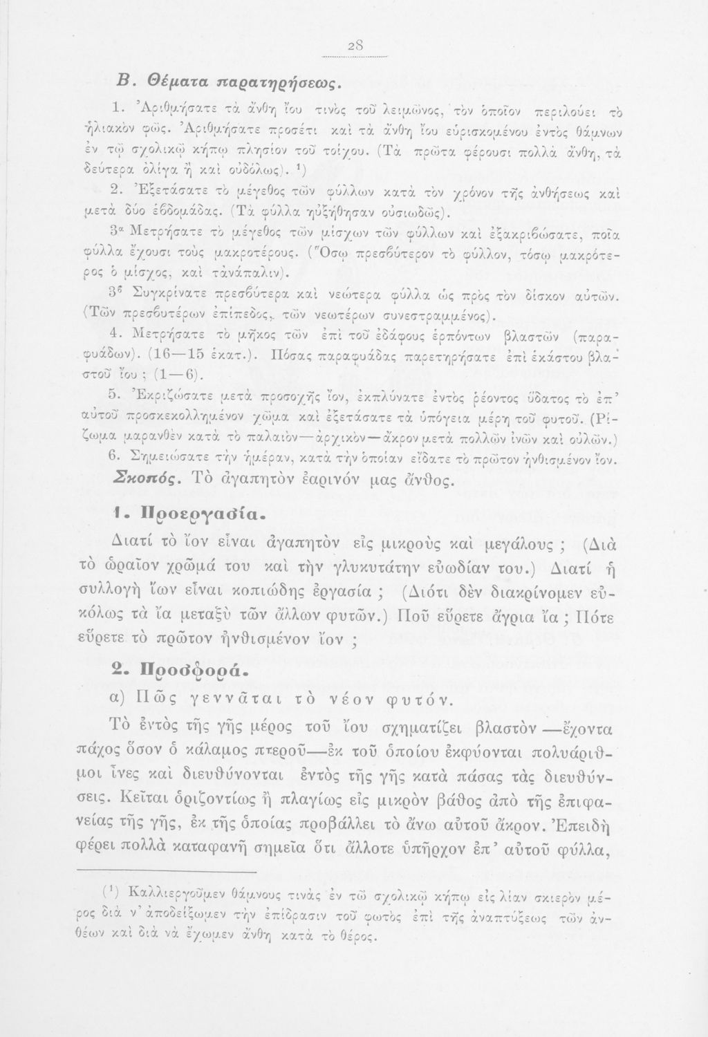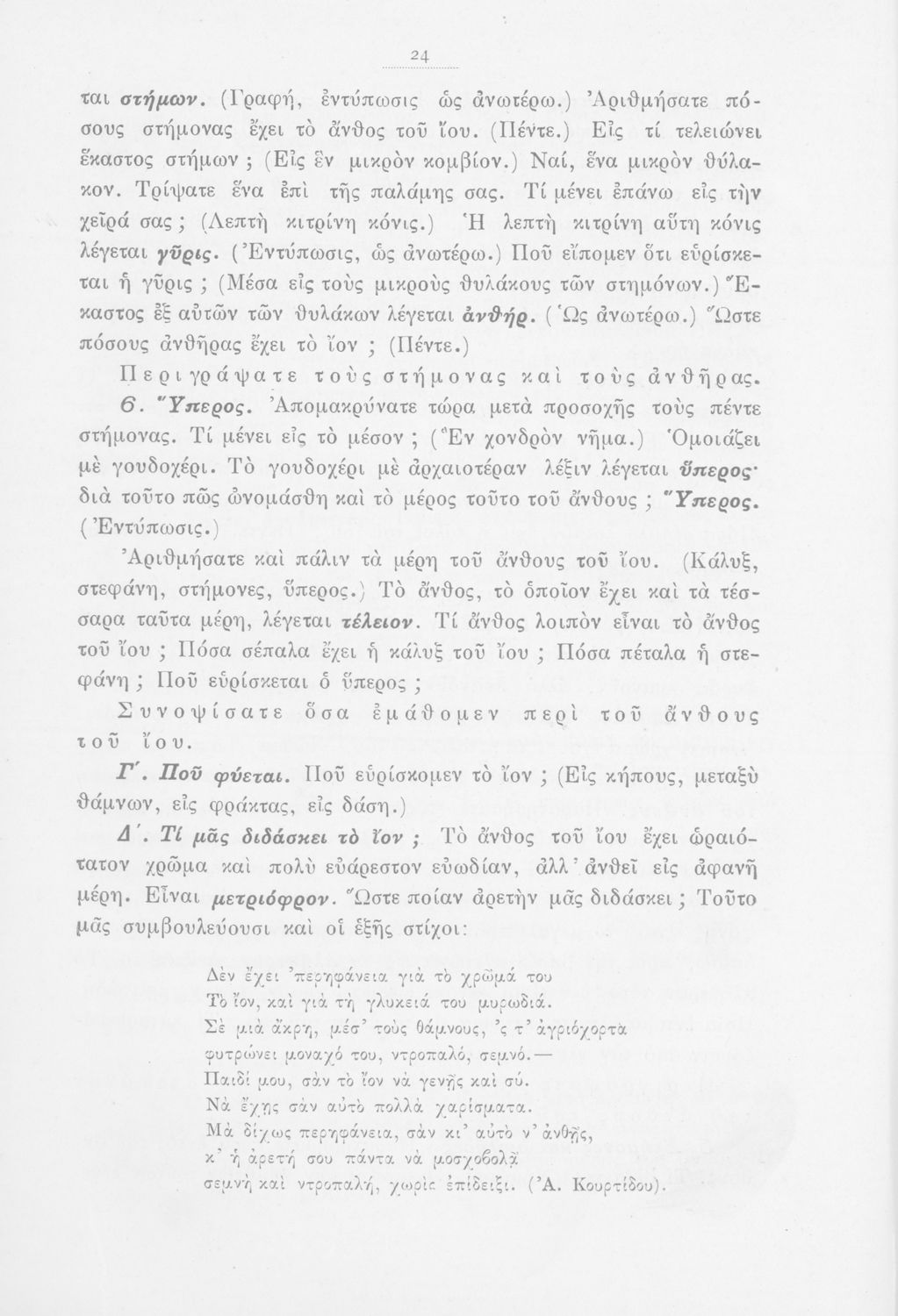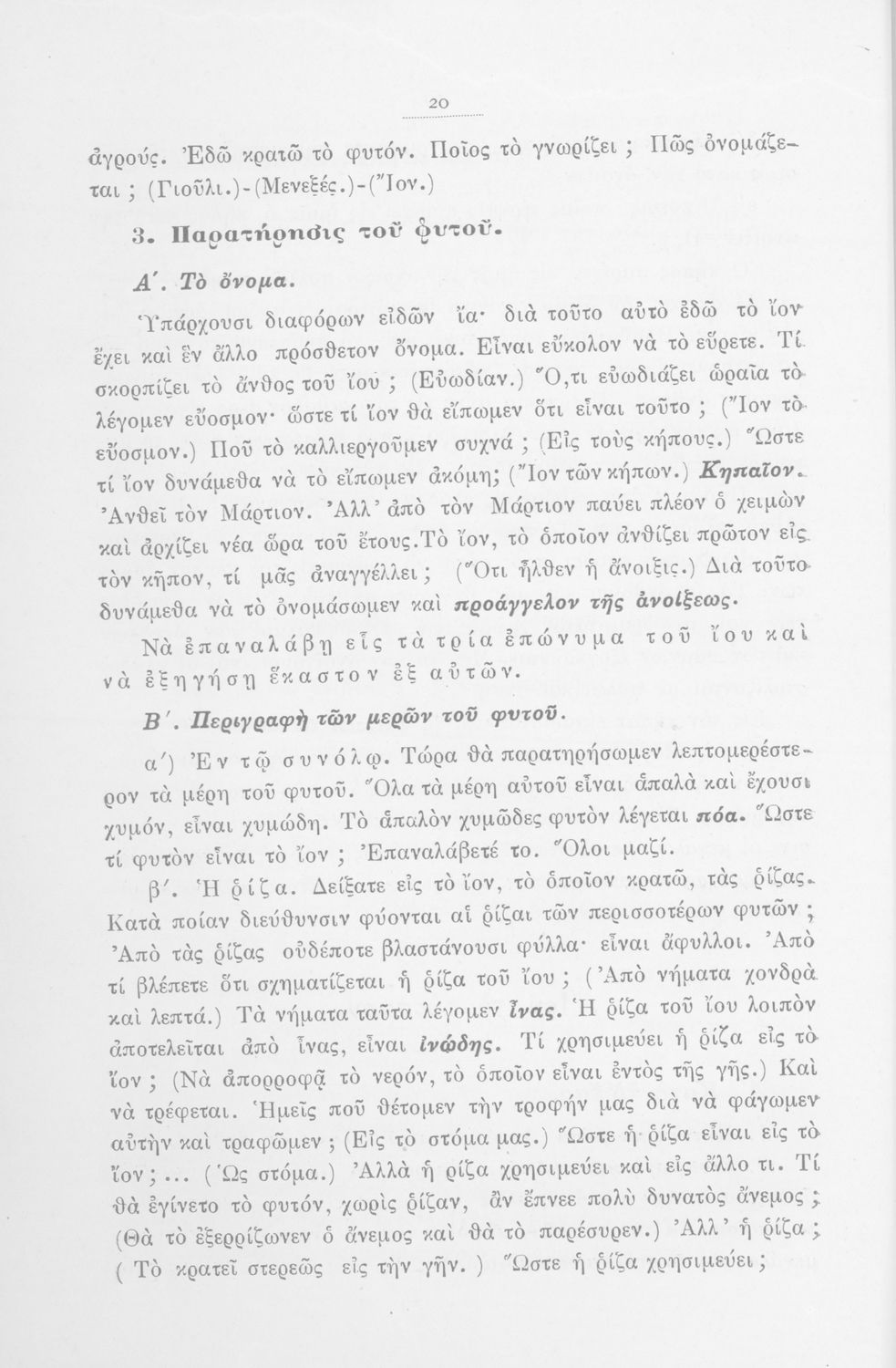 Μάθημα: Φυτολογία Γλώσσα: Καθαρεύουσα Παρουσίαση περιεχομένου: Παιδαγωγικό βοήθημα με υποδείγματα διδασκαλίας της Φυτολογίας. Παρέχει γενικές πληροφορίες για τα φυτά που θα χρησιμοποιηθούν σε μια διηγηματική διδασκαλία και υποδείγματα διδασκαλίας στο σχολικό κήπο για παρατήρηση και πειραματισμό των μαθητών. |