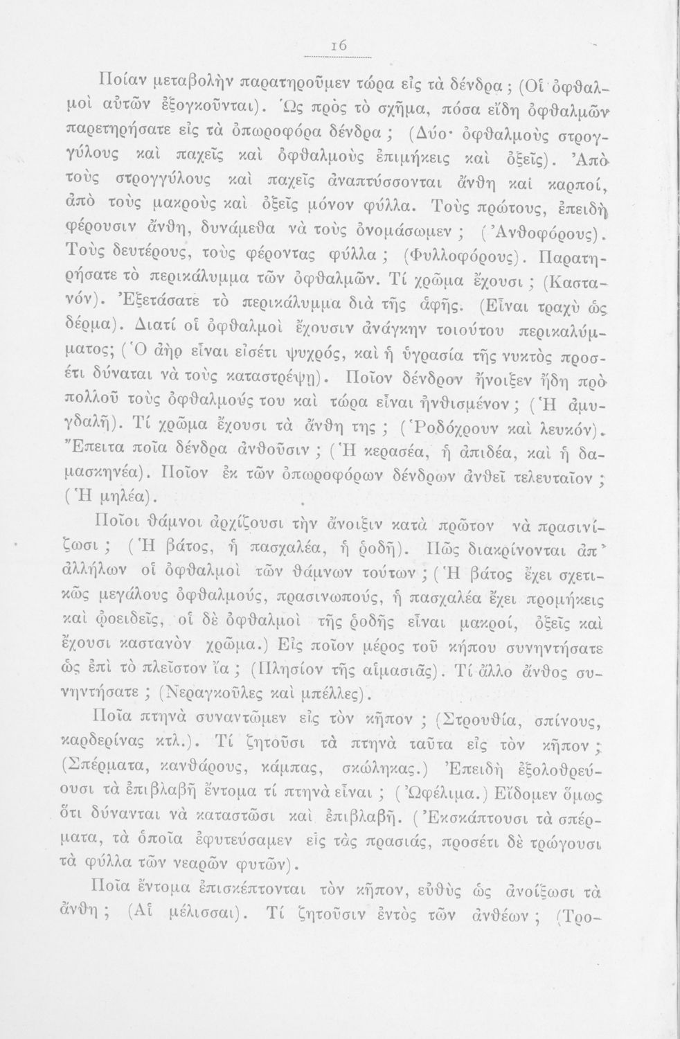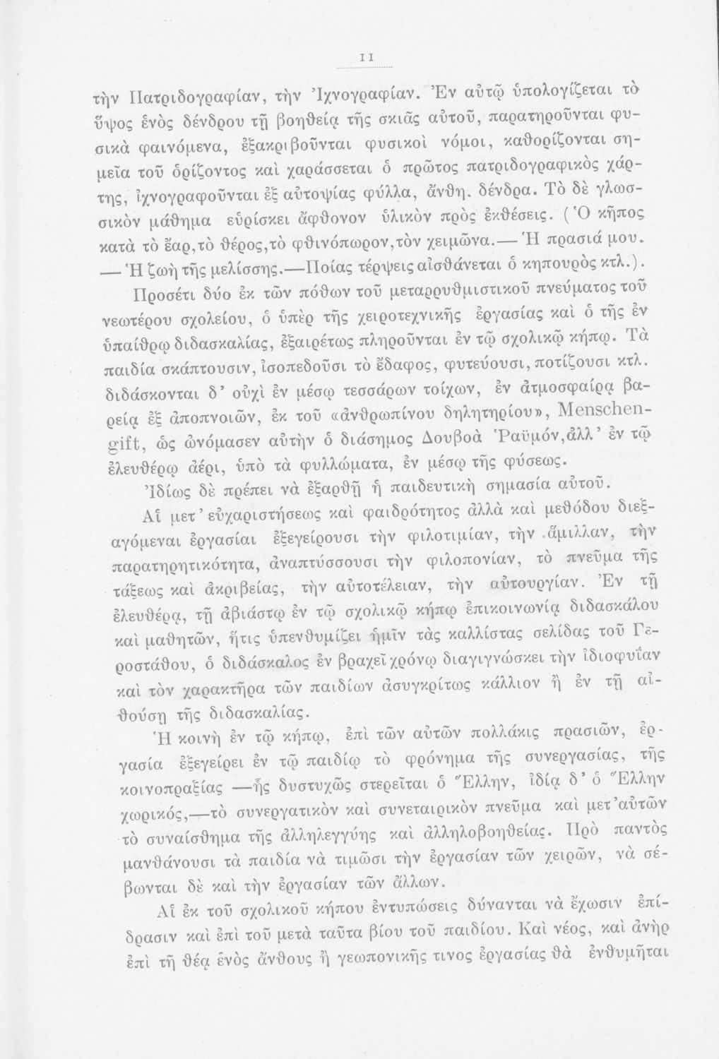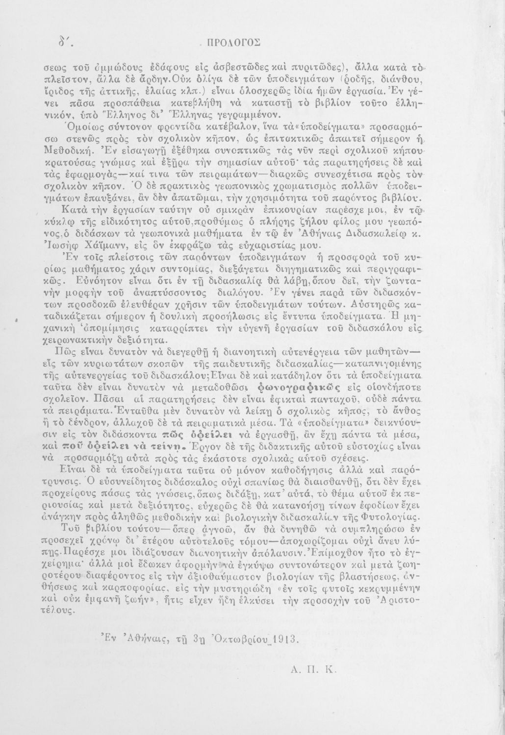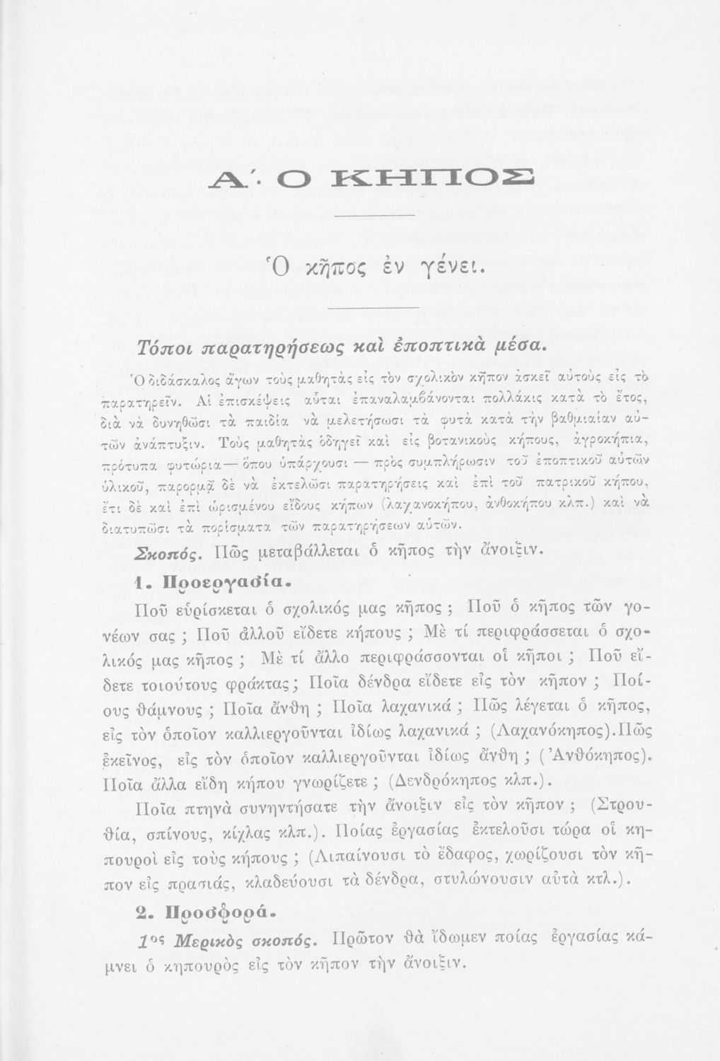Μάθημα: Φυτολογία Γλώσσα: Καθαρεύουσα Παρουσίαση περιεχομένου: Παιδαγωγικό βοήθημα με υποδείγματα διδασκαλίας της Φυτολογίας. Παρέχει γενικές πληροφορίες για τα φυτά που θα χρησιμοποιηθούν σε μια διηγηματική διδασκαλία και υποδείγματα διδασκαλίας στο σχολικό κήπο για παρατήρηση και πειραματισμό των μαθητών. |