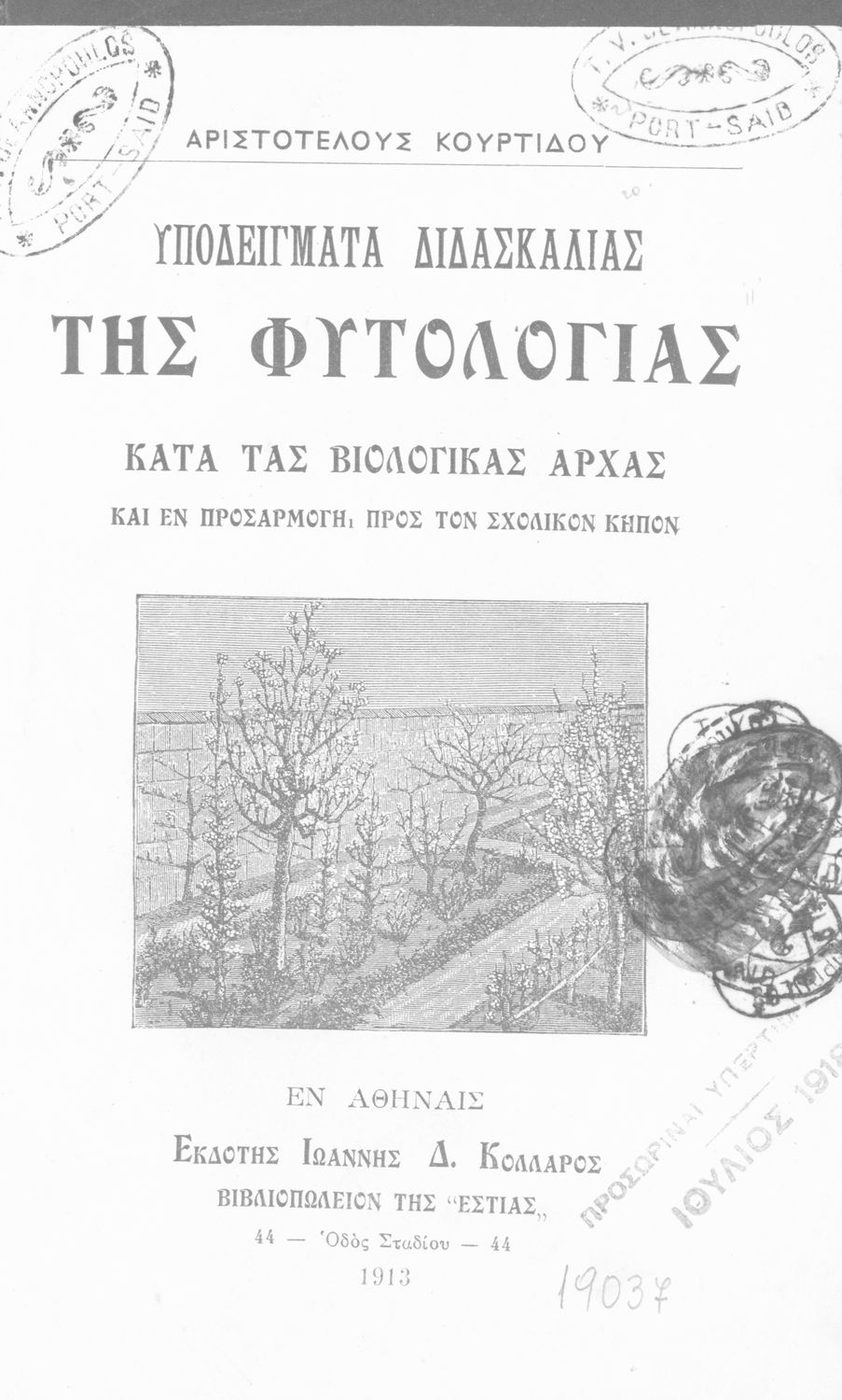Κωδικός αναγνώρισης: 01-19037 Τίτλος: Υποδείγματα Διδασκαλίας της Φυτολογίας κατά τας βιολογικάς αρχάς και εν προσαρμογή, προς τον σχολικό κήπον Συγγραφέας: Αριστοτέλης Κουρτίδης Μέγεθος και υπόστρωμα: Παιδαγωγικό βοήθημα, σκληρό εξώφυλλο, 345 σελίδες. Σχέδια και σκίτσα (ασπρόμαυρο). |