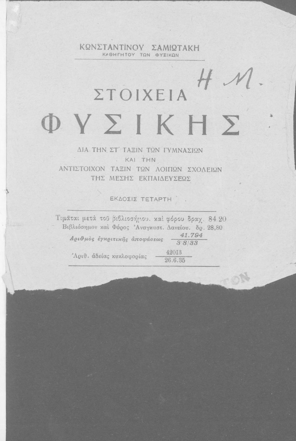 Κωδικός αναγνώρισης: 01-19042 Τίτλος: Στοιχεία φυσικής δια την ΣΤ΄ τάξιν των Γυμνασίων και την αντίστοιχον Τάξιν των λοιπών σχολείων της Μέσης Εκπαίδευσης Συγγραφέας: Κων. Σαμιωτάκης Μέγεθος και υπόστρωμα: Σχολικό εγχειρίδιο, μαλακό εξώφυλλο, 36 σελίδες. Σκίτσα, σχεδιαγράμματα (ασπρόμαυρα). |
