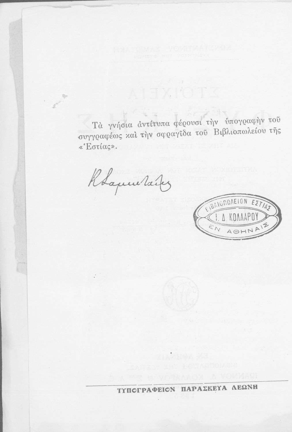 Εκδότης: Ιωάννης Δ. Κολλάρος, Βιβλιοπωλείο της "Εστίας" Έτος έκδοσης: 1935 Τόπος έκδοσης: Αθήνα Έκδοση: 4η Υπουργική απόφαση / Σύμβαση: 41794/3-8-1933 Έτος έγκρισης: 1933 |