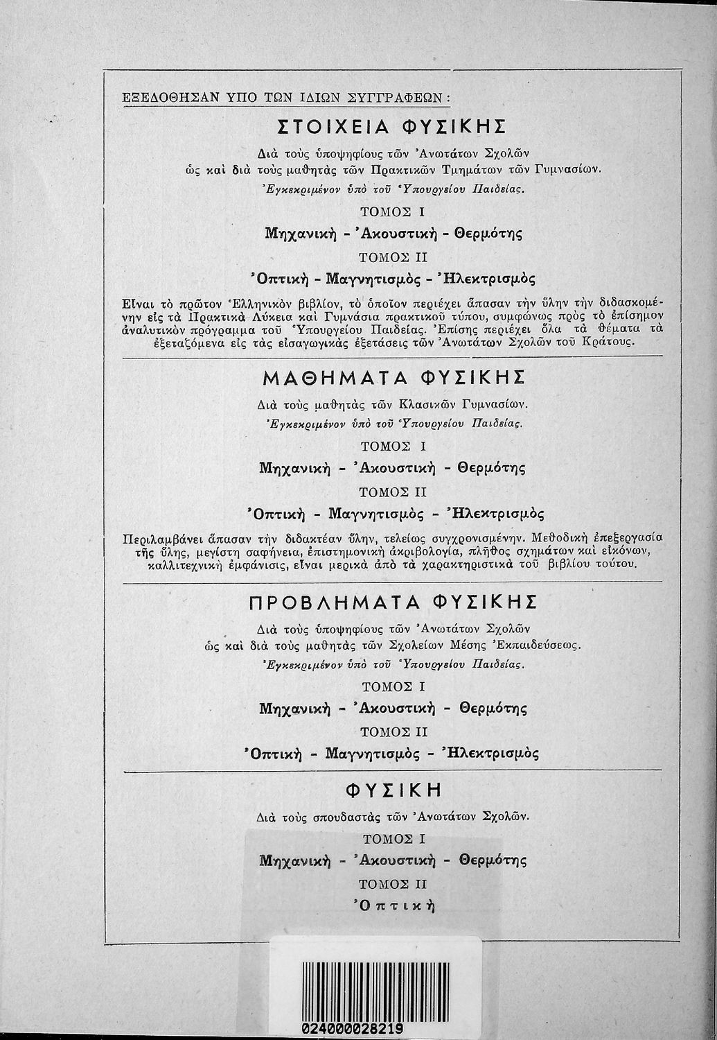 Τίτλος: Μαθήματα Φυσικής προς χρήσιν των υποψηφίων δια τας εισαγωγικάς εξετάσεις των Ανώτατων Σχολών και των μαθητών των ανωτέρων τάξεων των Σχολείων Μέσης Εκπαιδεύσεως.