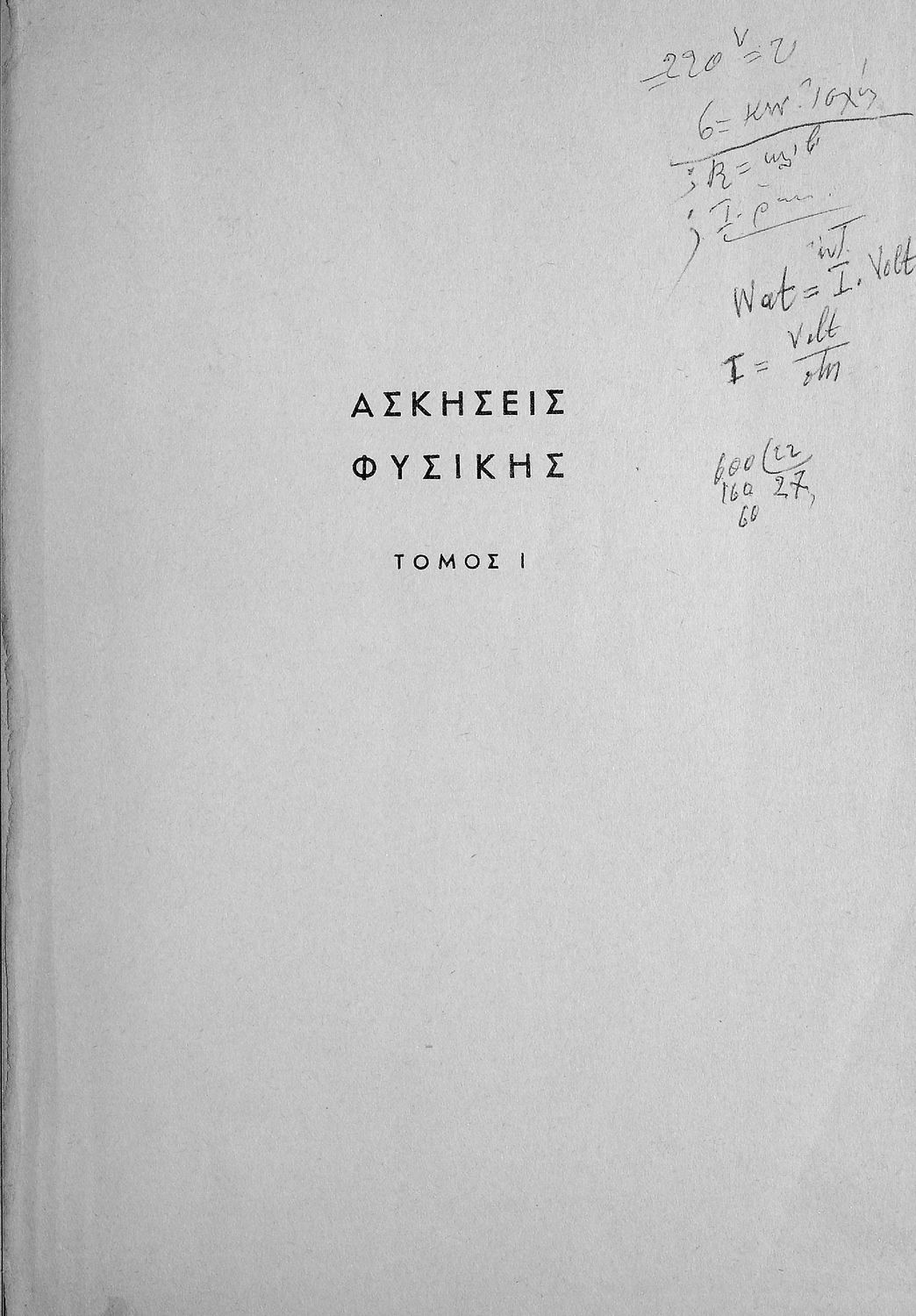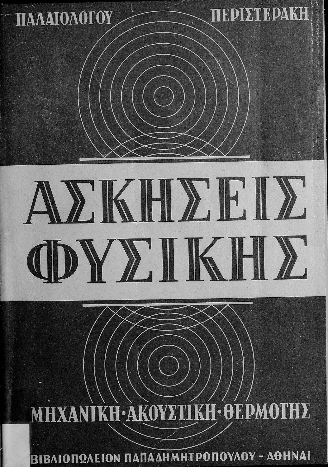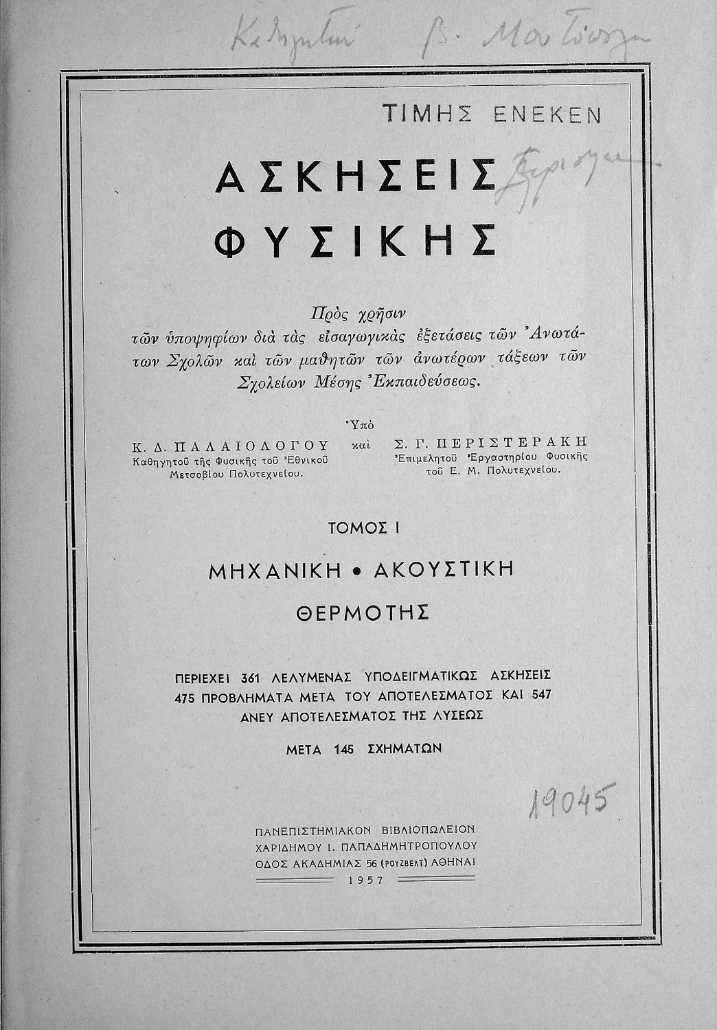 Τίτλος: Μαθήματα Φυσικής προς χρήσιν των υποψηφίων δια τας εισαγωγικάς εξετάσεις των Ανώτατων Σχολών και των μαθητών των ανωτέρων τάξεων των Σχολείων Μέσης Εκπαιδεύσεως.
