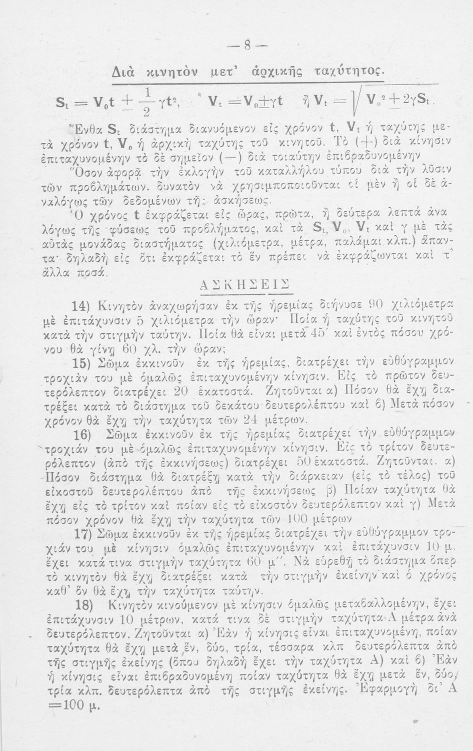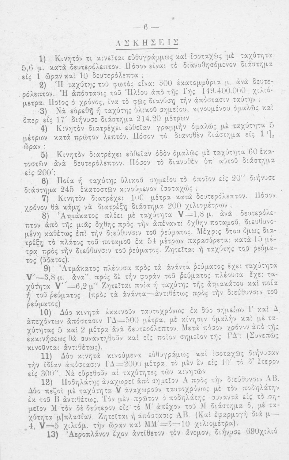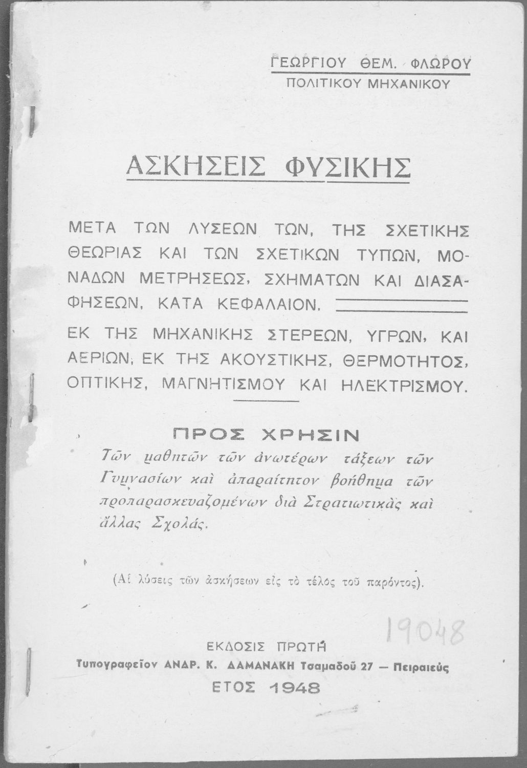 Ασκήσεις Φυσικής μετά των λύσεων της σχετικής θεωρίας των σχετικών τύπων, μονάδων μετρήσεως, σχημάτων και διασαφήσεων κατά κεφάλαιον. Εκ της μηχανικής στερεών, εκ της ακουστικής, θερμότητος, οπτικής, μαγνητισμού και ηλεκτρισμού. Προς χρήσιν των μαθητών των ανωτέρων Τάξεων των Γυμνασίων και απαραίτητων βοήθημα των παρασκευαζόμενων δια Σττρατιωτικάς και άλλας Σχολάς.