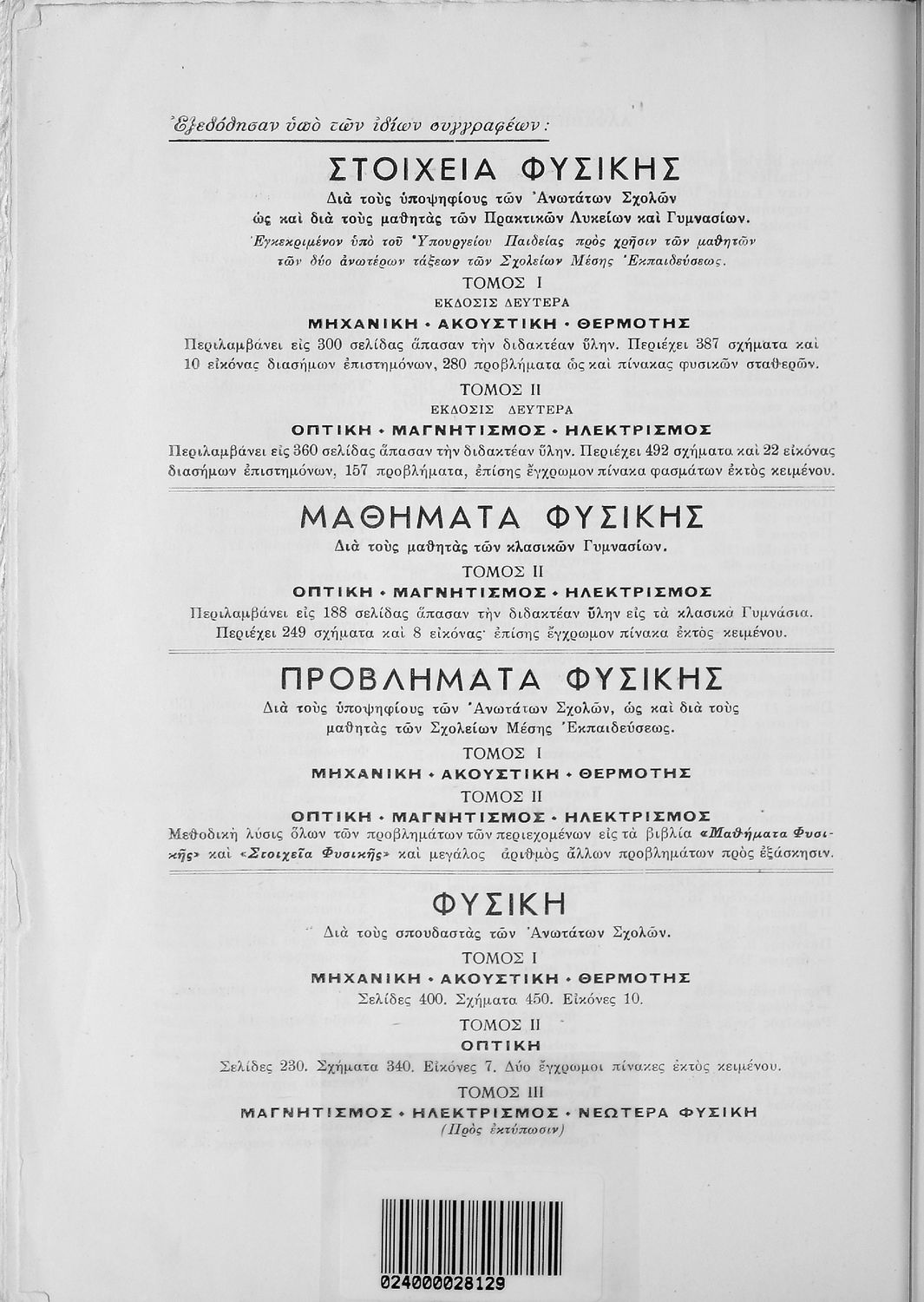 Τίτλος: Μαθήματα Φυσικής προς χρήσιν των μαθητών των Κλασικών Γυμνασίων
