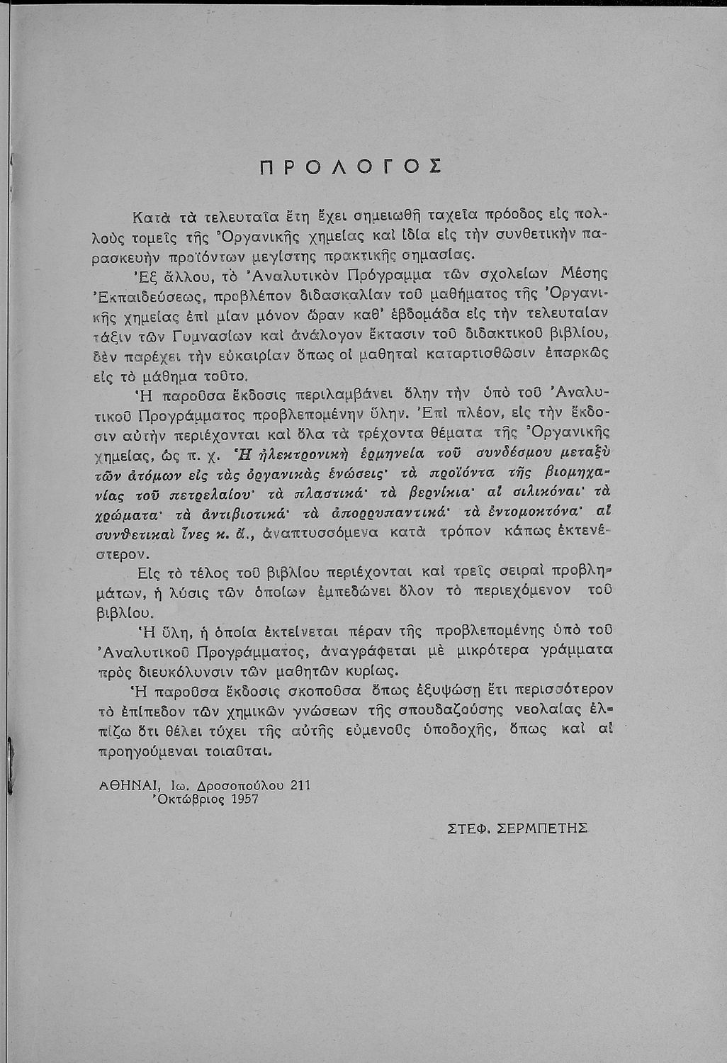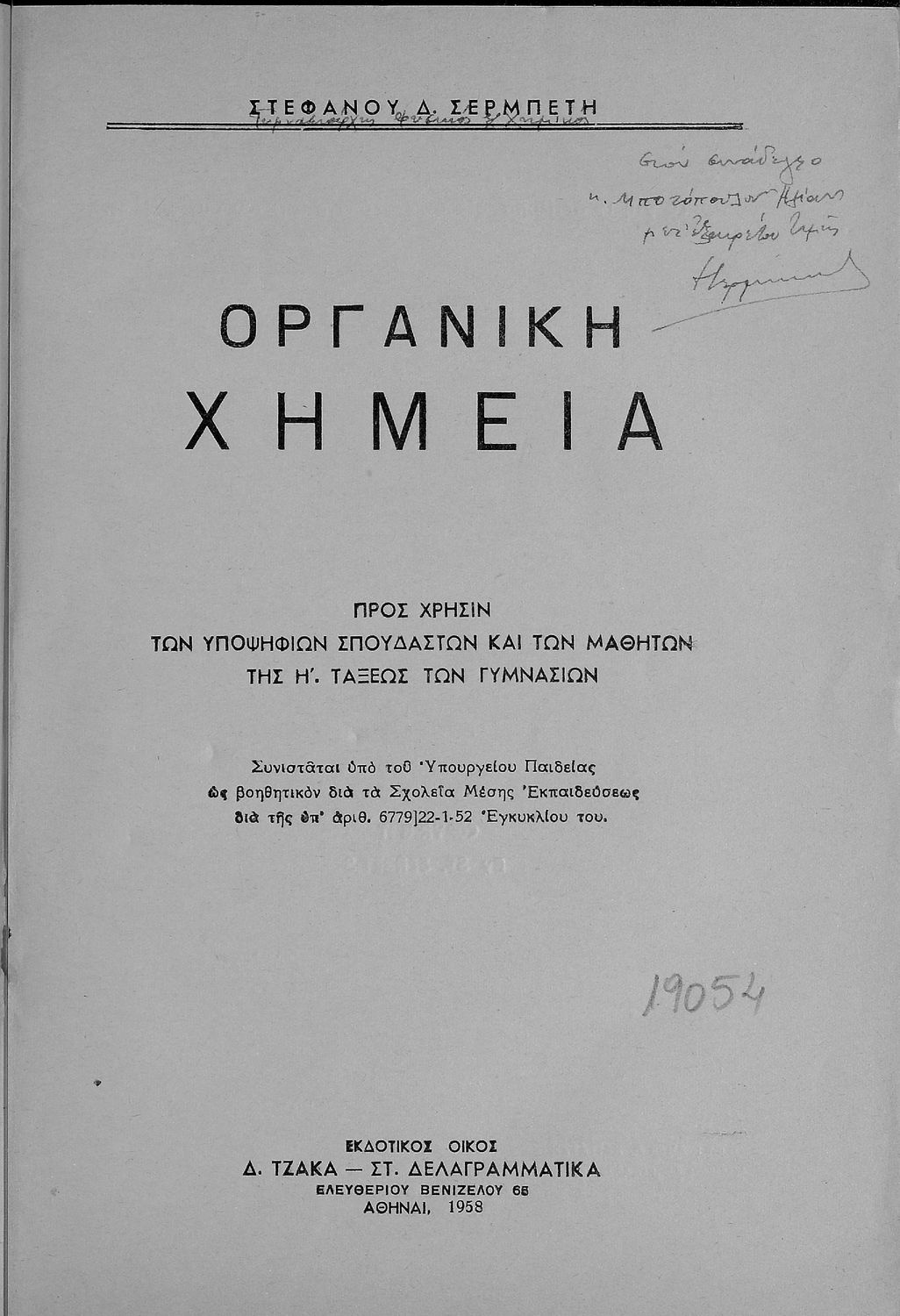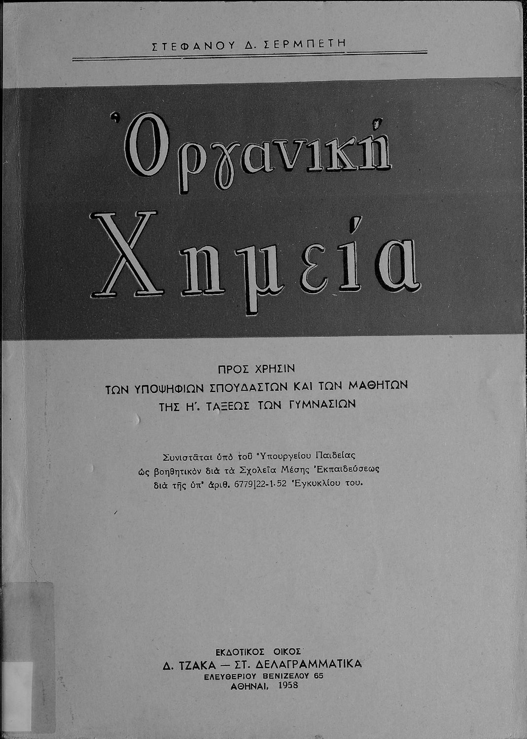 Κωδικός αναγνώρισης: 01-19054 Τίτλος: Οργανική Χημεία προς χρήσιν των υποψήφιων σπουδαστών και των μαθητών της Η΄ τάξεως των Γυμνασίων Συγγραφέας: Στέφανος Δ. Σερμπέτης Μέγεθος και υπόστρωμα: Σχολικό εγχειρίδιο, μαλακό εξώφυλλο, 183 σελίδες. Σχέδια και σχήματα (ασπρόμαυρα). |