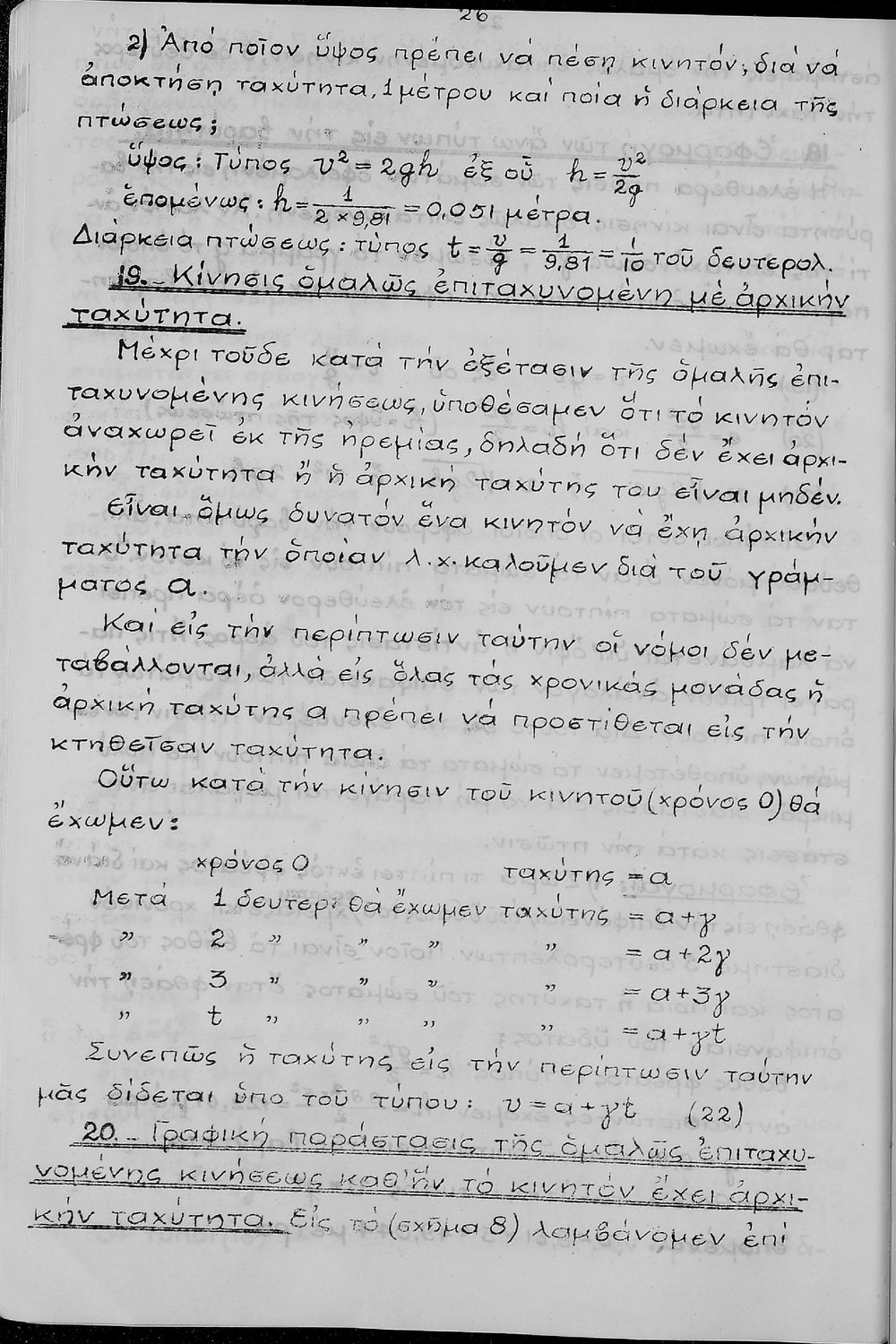 Μαθητικό βοήθημα για το μάθημα της Φυσικής. Το σύγγραμμα ήταν μελέτη του συγγραφέα από τη σχολή Μηχανικών και απευθυνόταν στους σπουδαστές. Περιλαμβάνει σημείωσες για τη μηχανική, σχετικά με τις κινήσεις, τις δυνάμεις, το βάρος, το έργο, την ισχύ, τη μάζα, τα εκκρεμή, την τριβή κ.α.