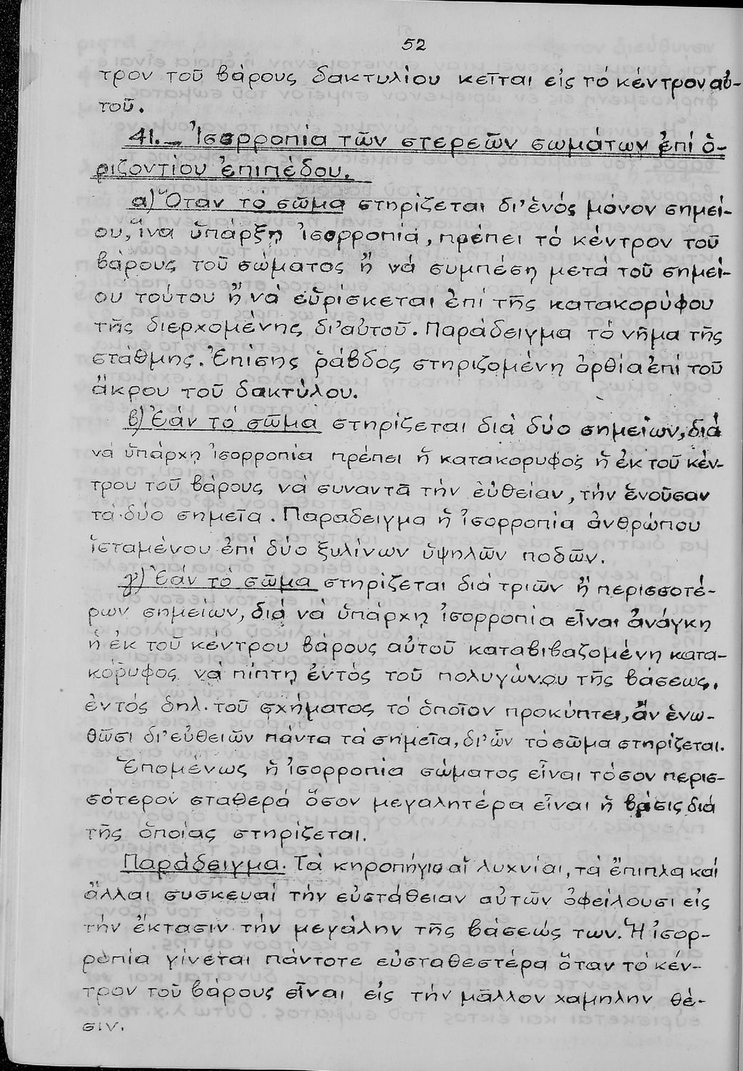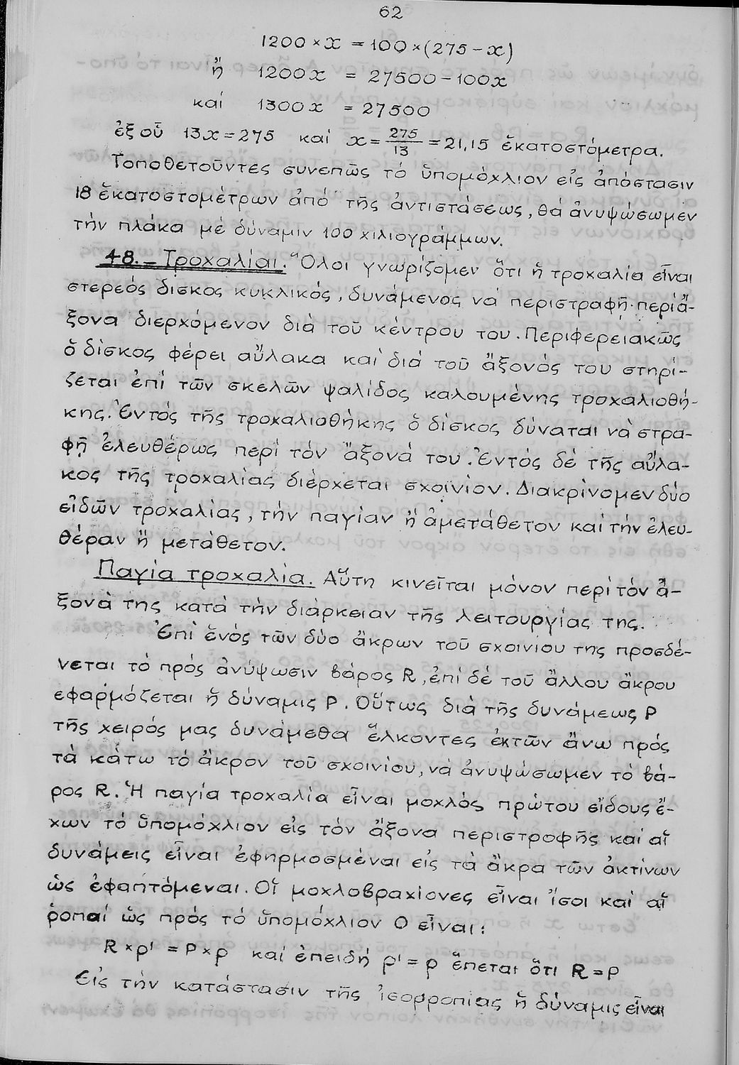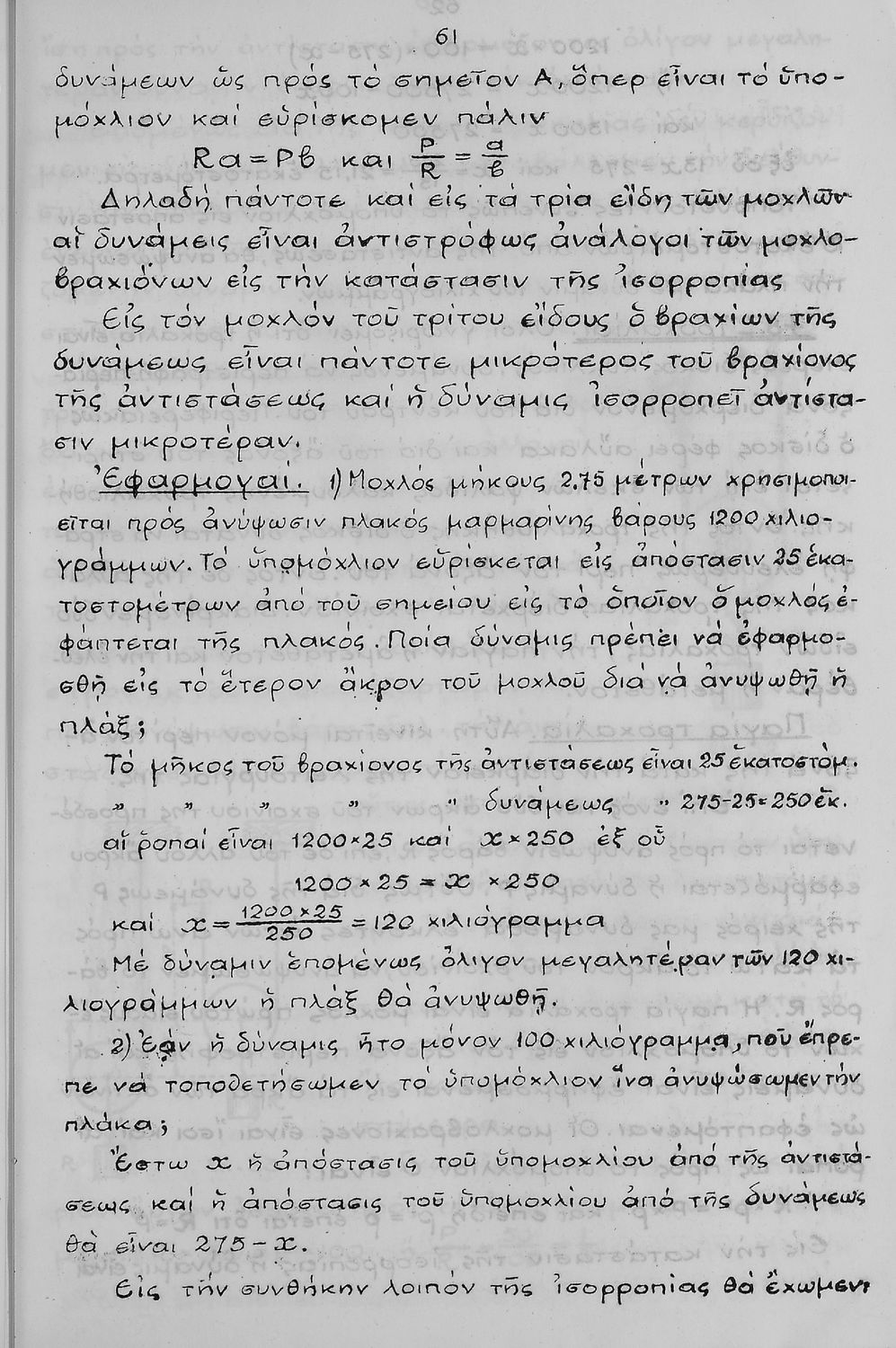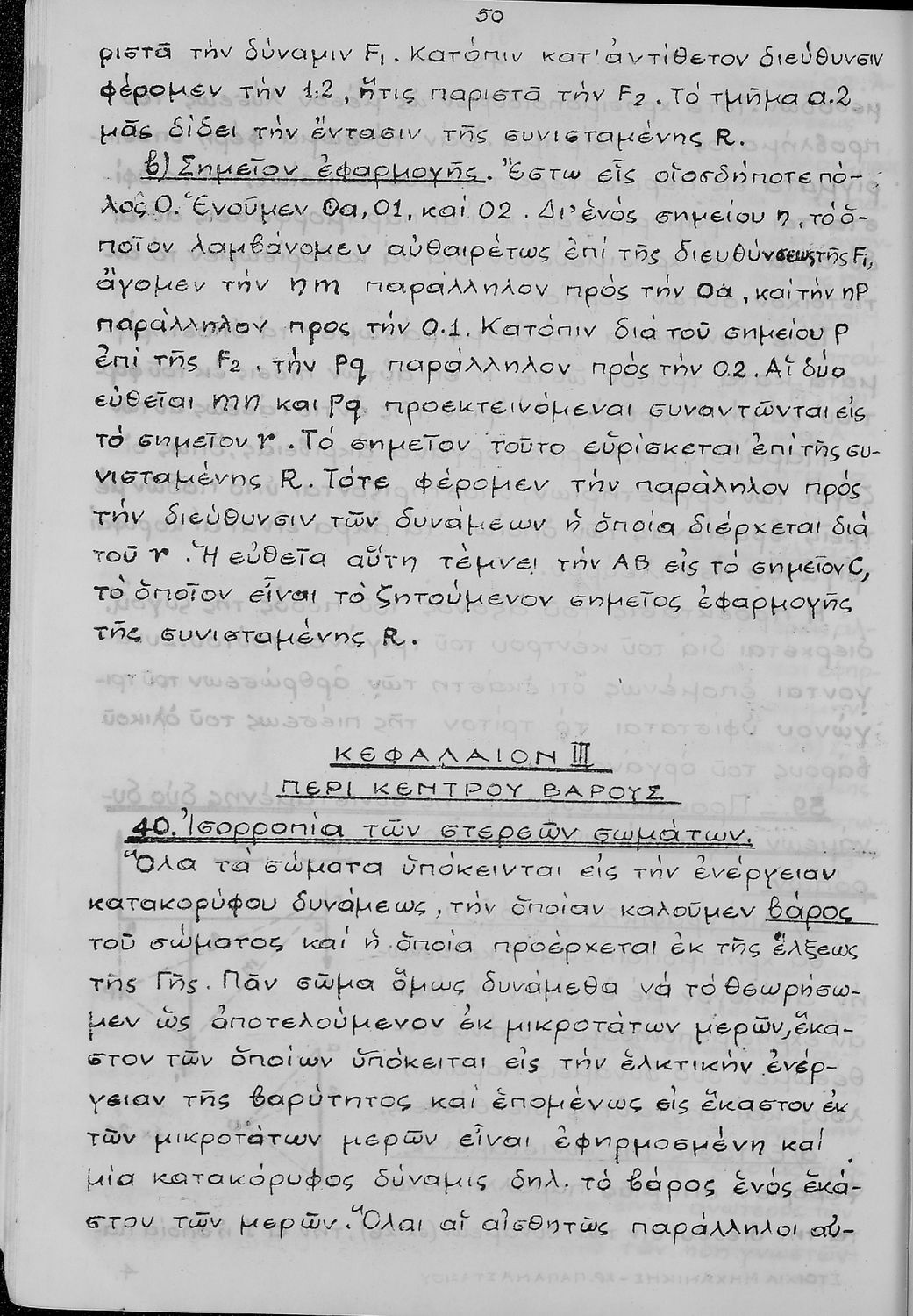 Μαθητικό βοήθημα για το μάθημα της Φυσικής. Το σύγγραμμα ήταν μελέτη του συγγραφέα από τη σχολή Μηχανικών και απευθυνόταν στους σπουδαστές. Περιλαμβάνει σημείωσες για τη μηχανική, σχετικά με τις κινήσεις, τις δυνάμεις, το βάρος, το έργο, την ισχύ, τη μάζα, τα εκκρεμή, την τριβή κ.α.