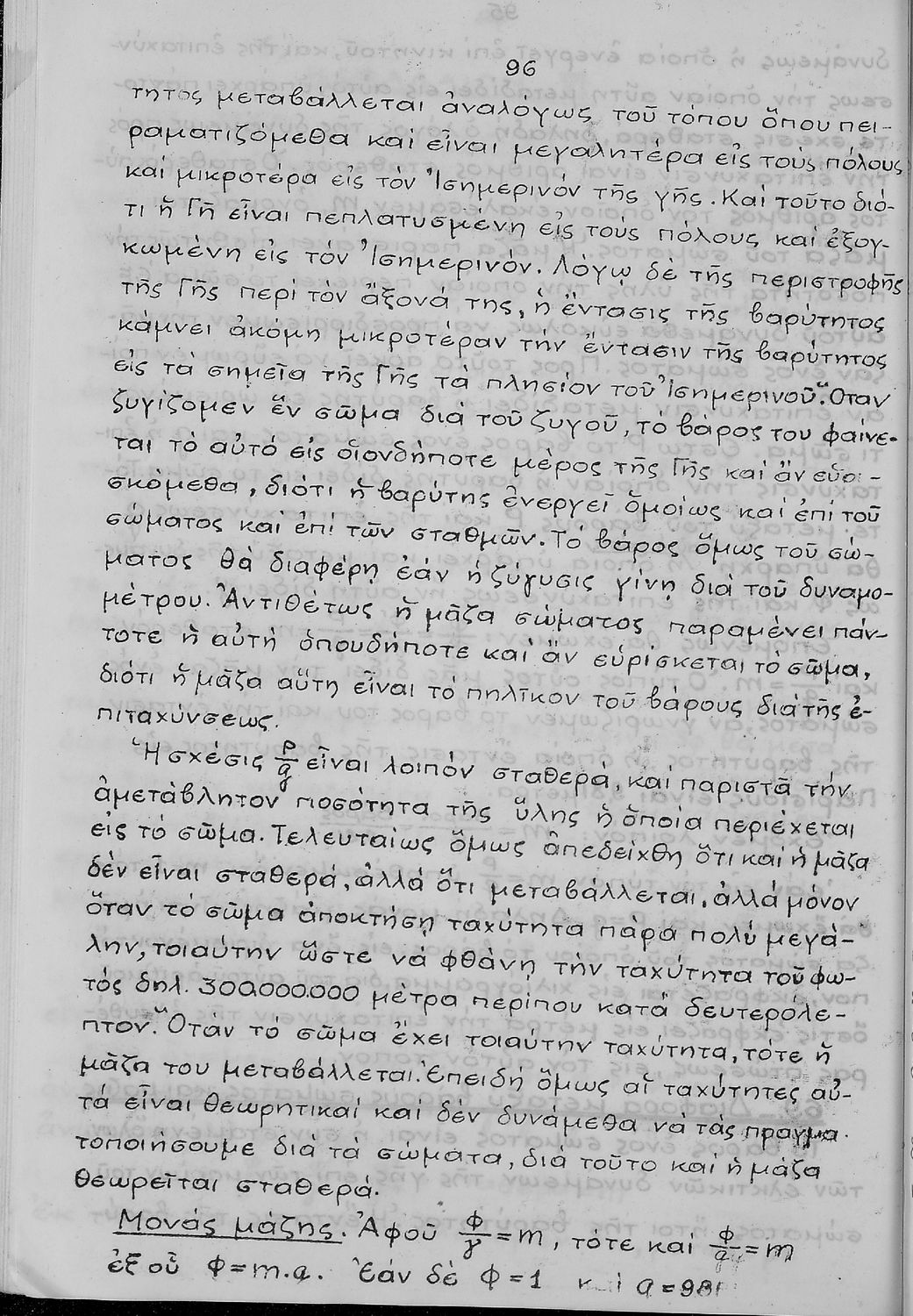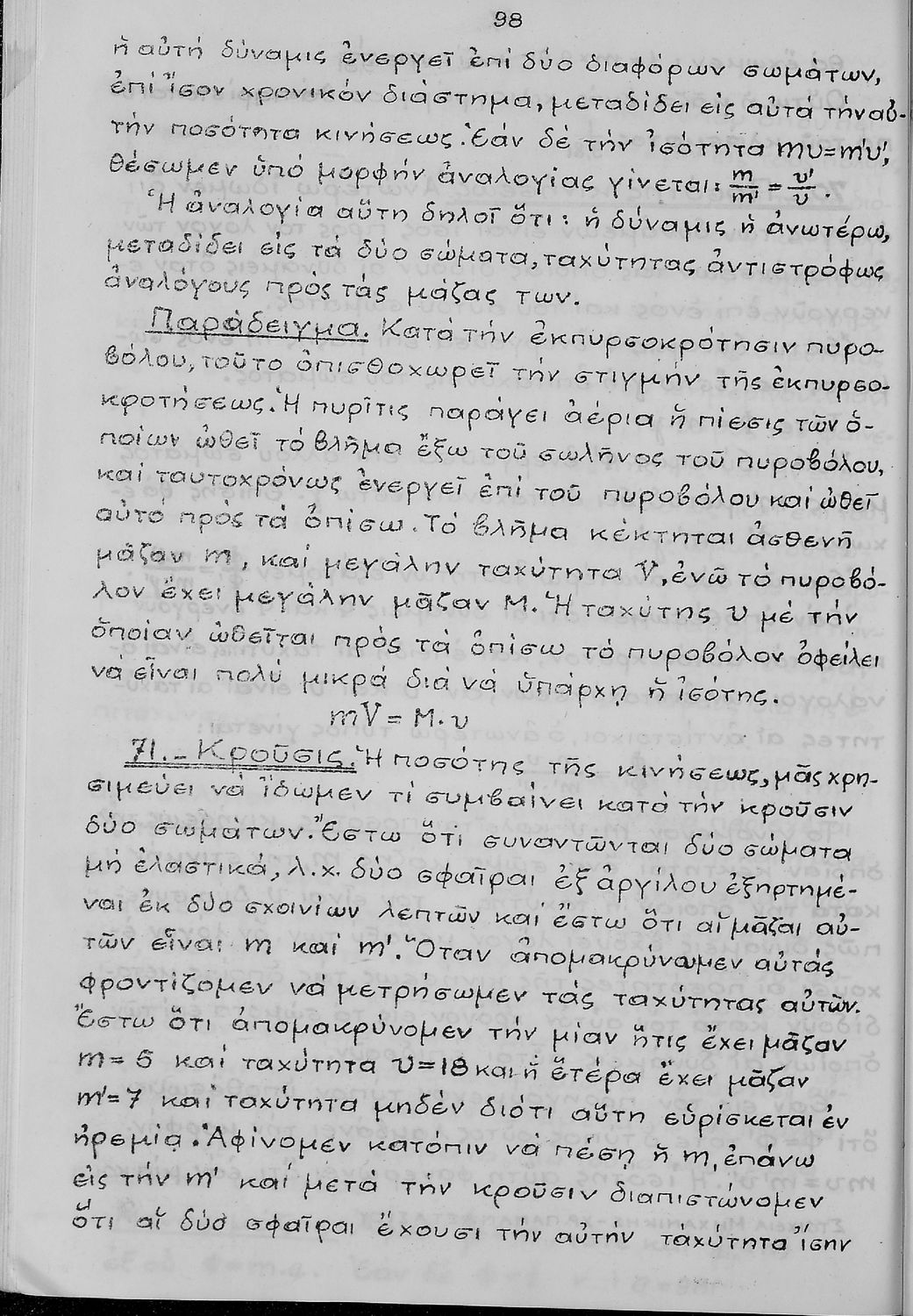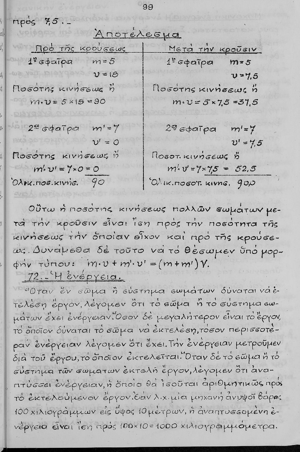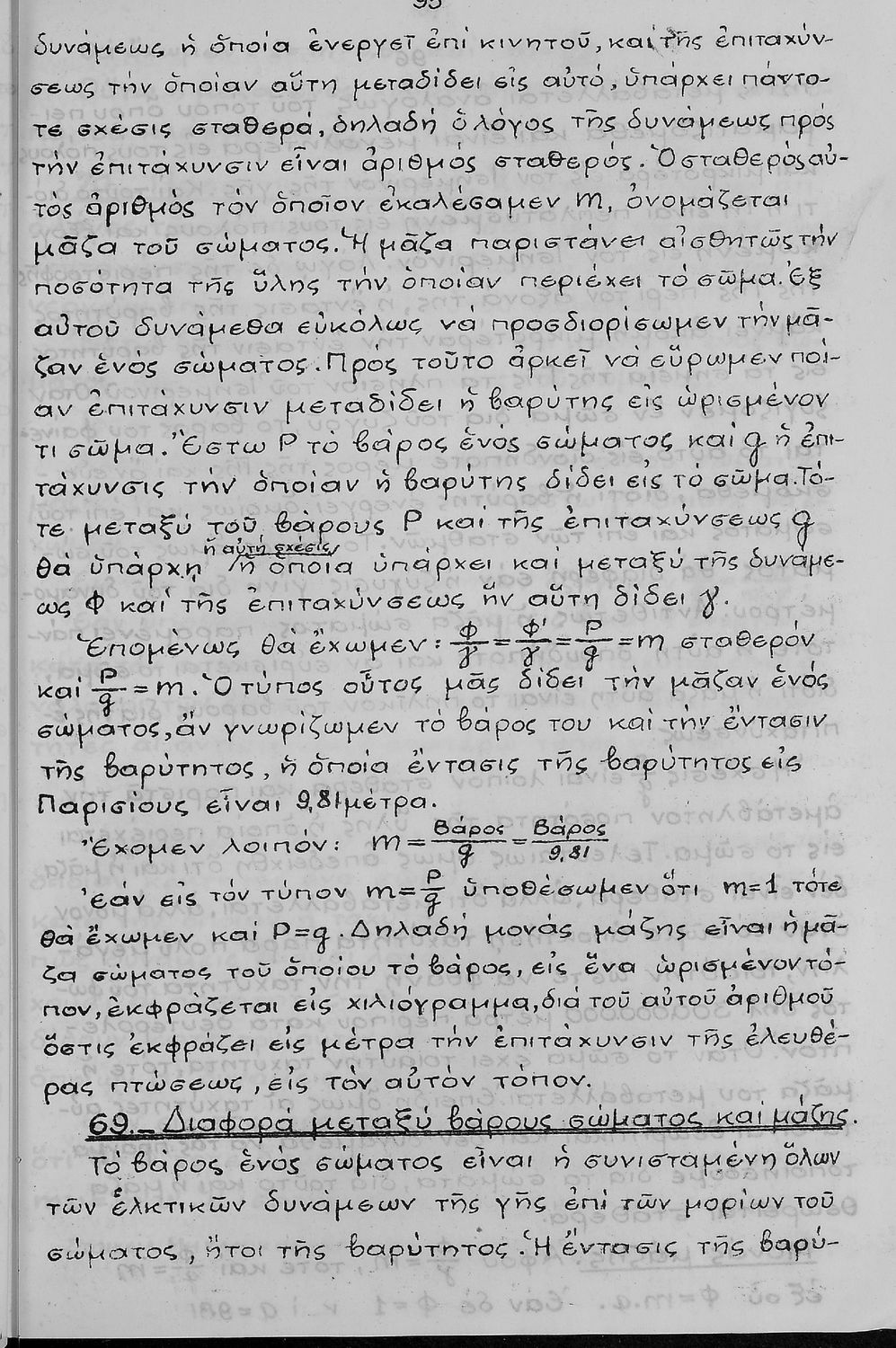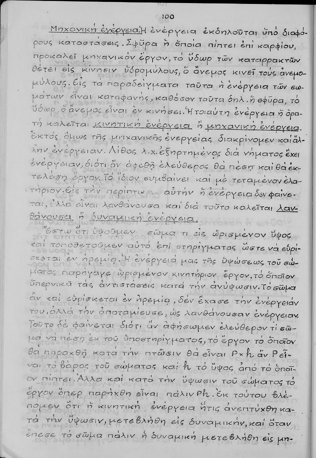 Παρουσίαση περιεχομένου: Μαθητικό βοήθημα για το μάθημα της Φυσικής. Το σύγγραμμα ήταν μελέτη του συγγραφέα από τη σχολή Μηχανικών και απευθυνόταν στους σπουδαστές. Περιλαμβάνει σημείωσες για τη μηχανική, σχετικά με τις κινήσεις, τις δυνάμεις, το βάρος, το έργο, την ισχύ, τη μάζα, τα εκκρεμή, την τριβή κ.α.