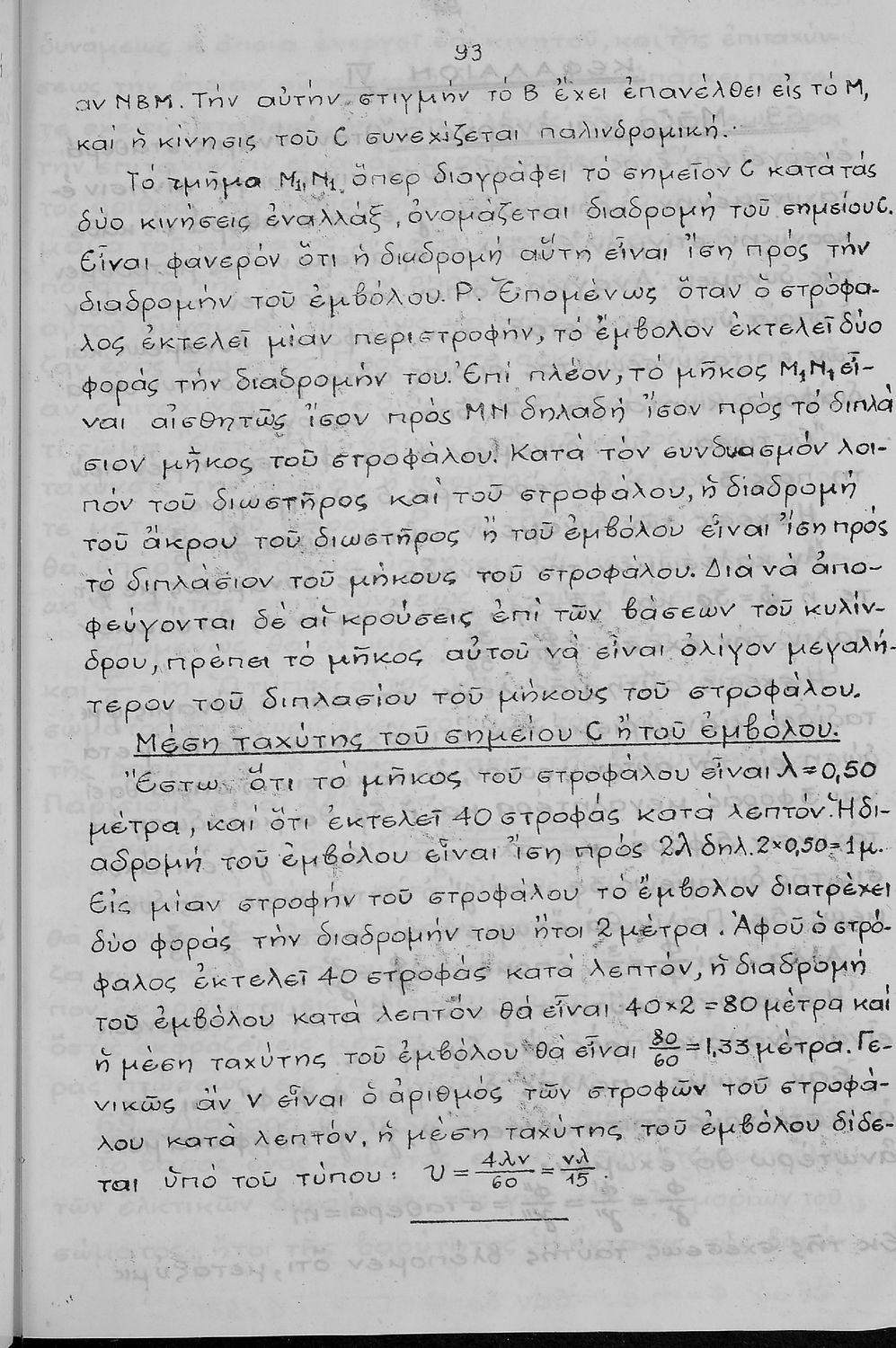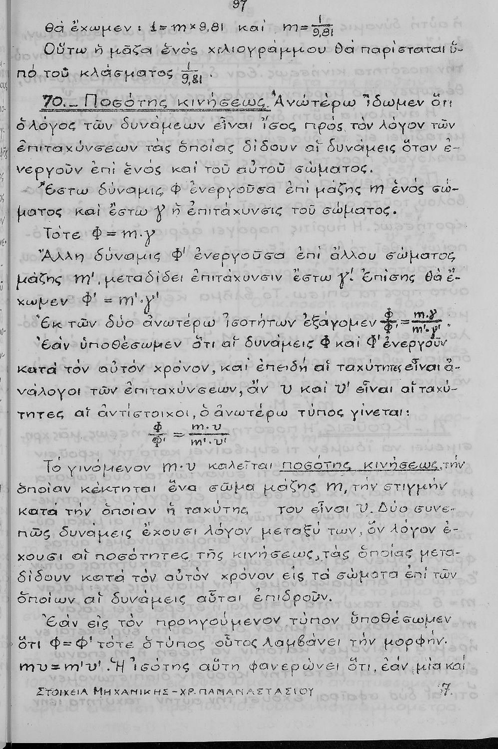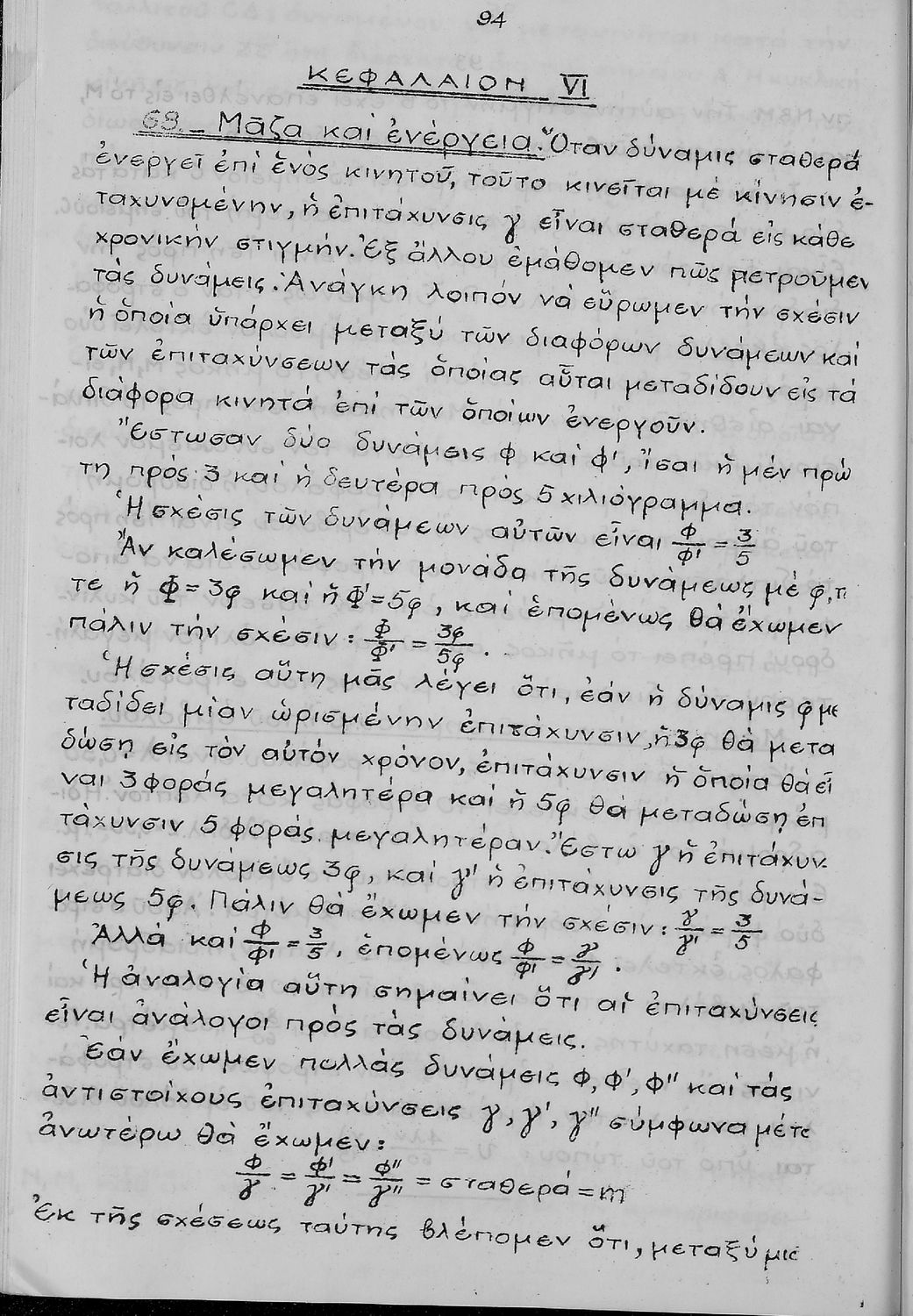 Μαθητικό βοήθημα για το μάθημα της Φυσικής. Το σύγγραμμα ήταν μελέτη του συγγραφέα από τη σχολή Μηχανικών και απευθυνόταν στους σπουδαστές. Περιλαμβάνει σημείωσες για τη μηχανική, σχετικά με τις κινήσεις, τις δυνάμεις, το βάρος, το έργο, την ισχύ, τη μάζα, τα εκκρεμή, την τριβή κ.α.