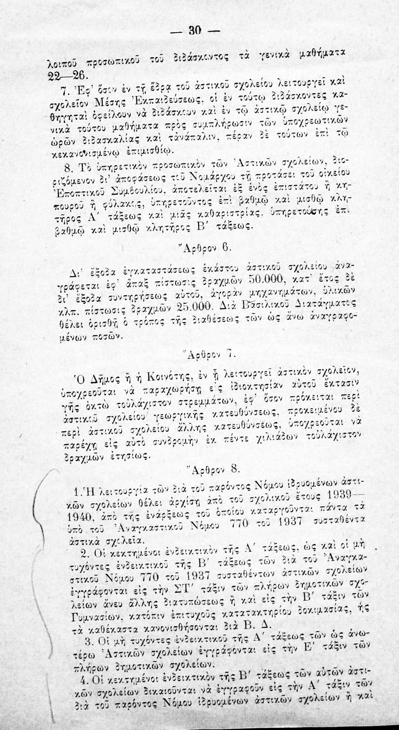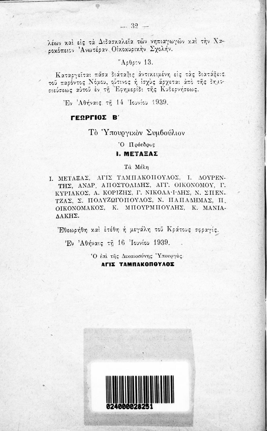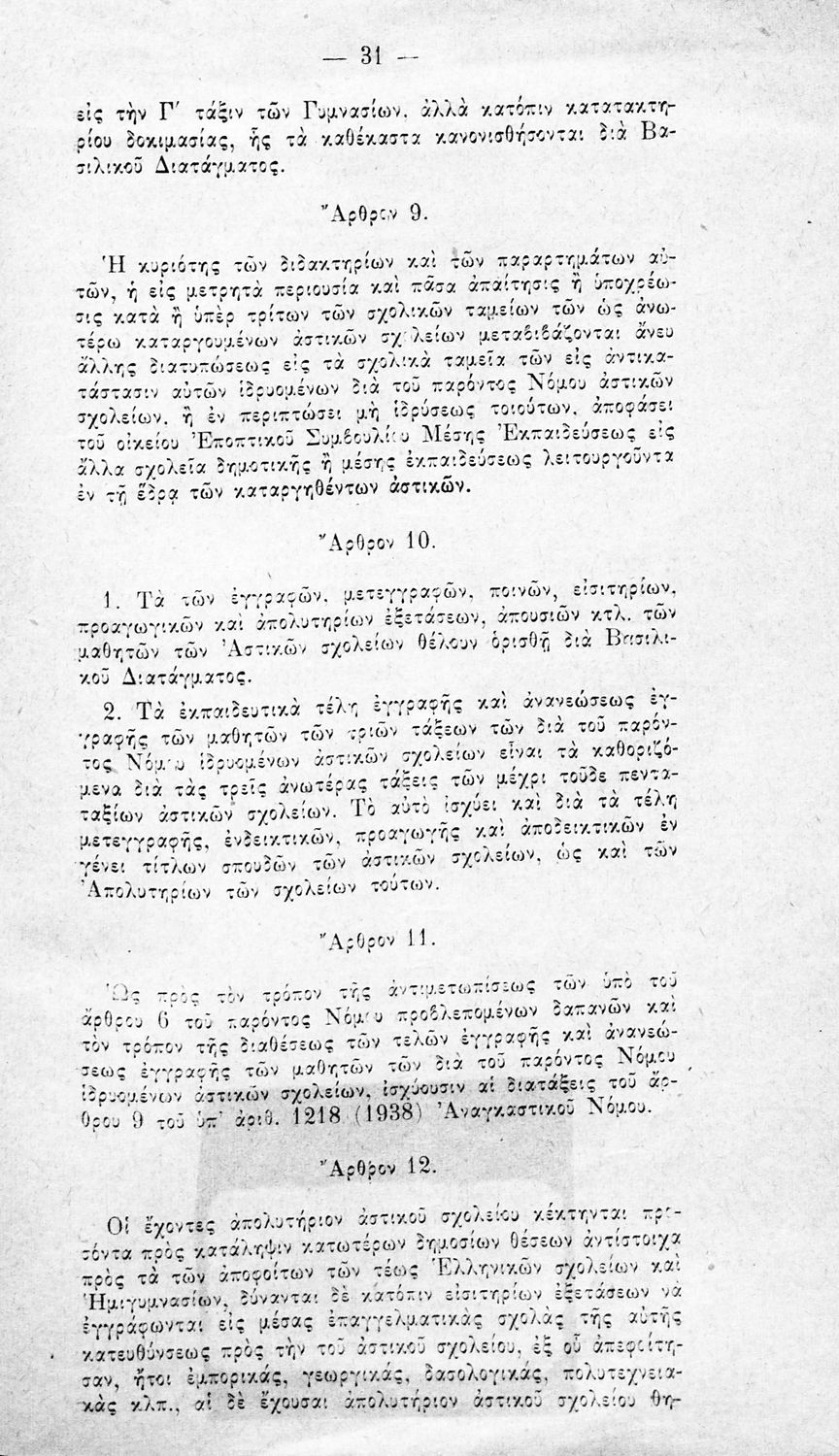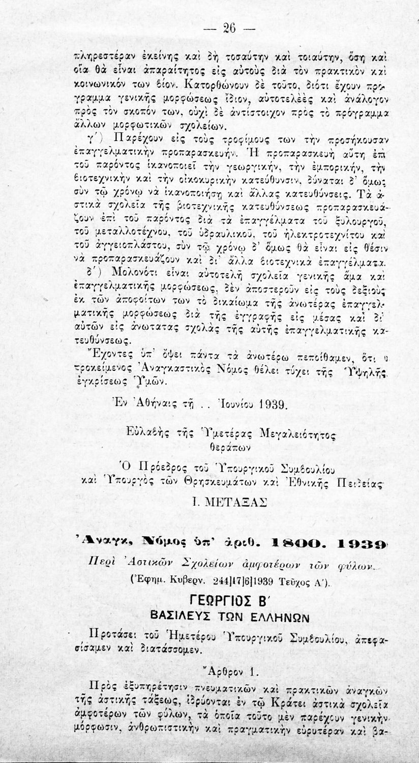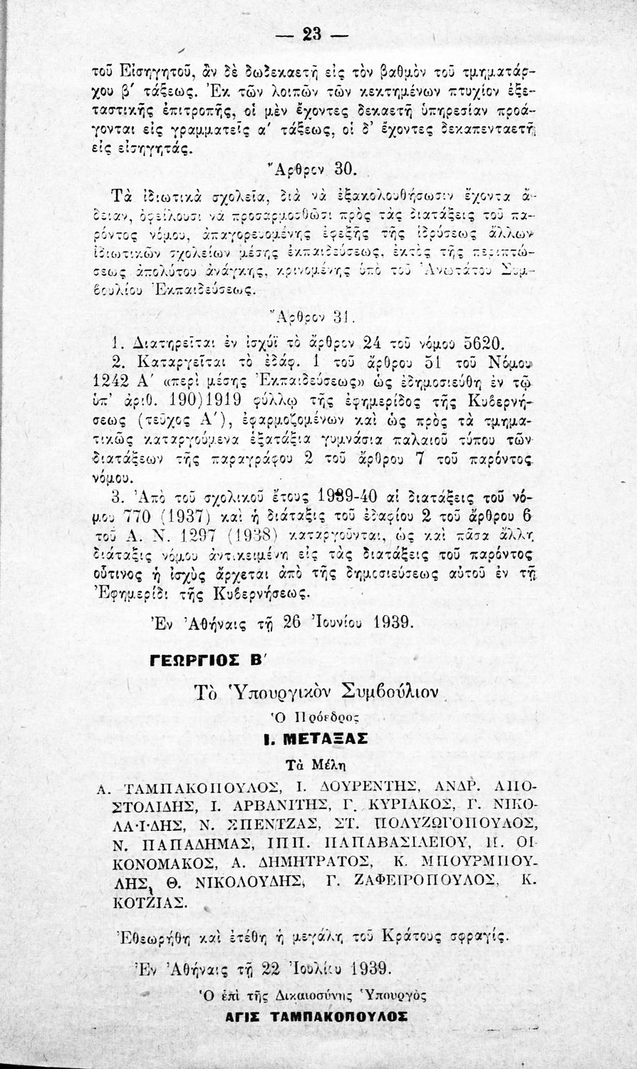 Έκδοση του Υπουργείου Παιδείας (Διεύθυνση Μέσης Εκπαιδεύσεως –Τμήμα Διοικητικού) που περιλαμβάνει τους αναγκαστικούς νόμους 1800/1939 και 1849/1939 καθώς και τις αιτιολογικές τους εκθέσεις.