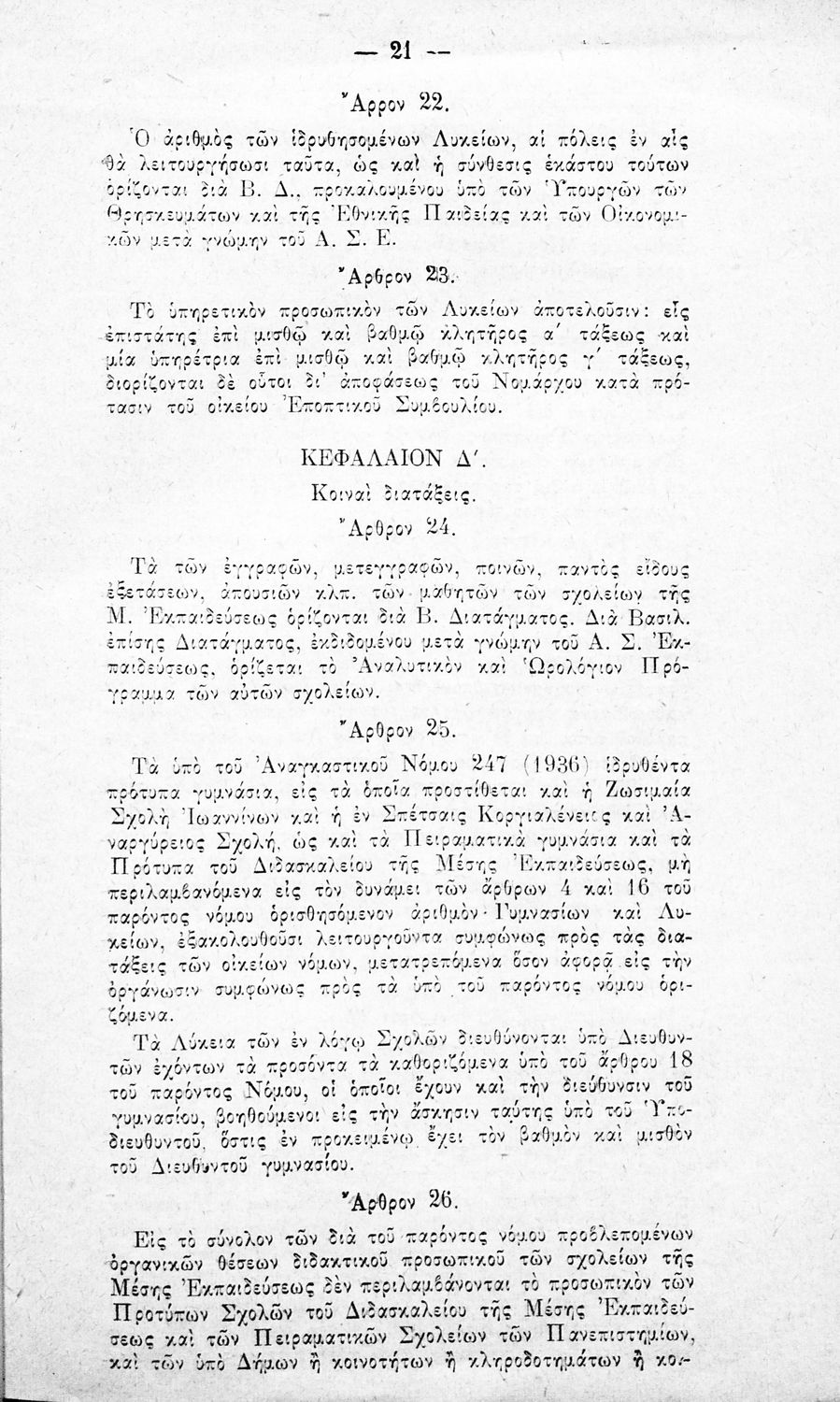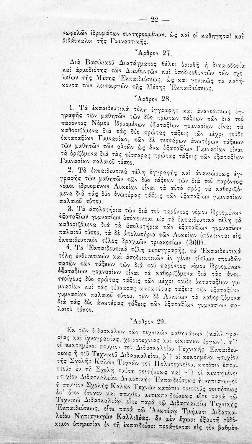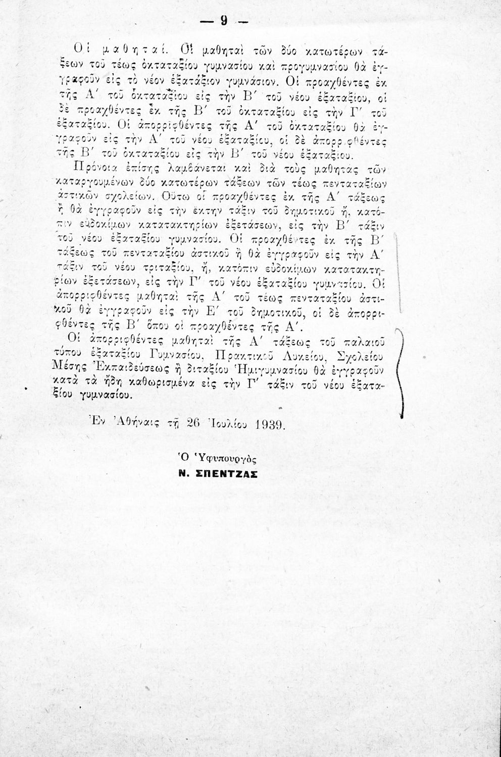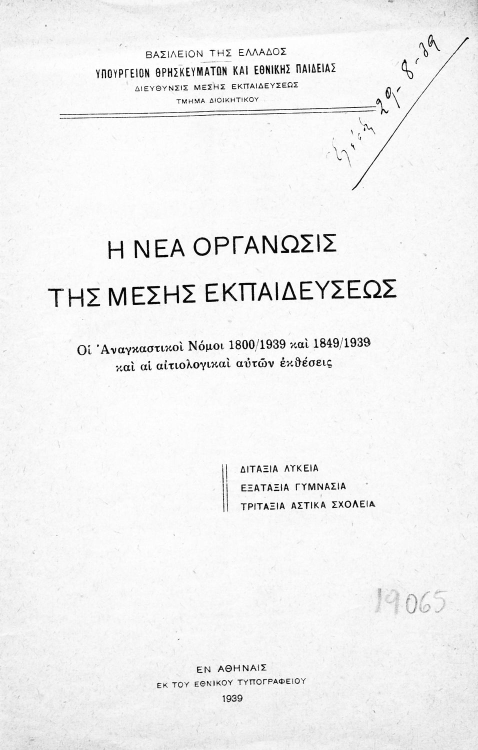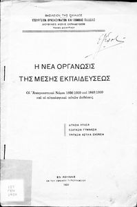 Έκδοση του Υπουργείου Παιδείας (Διεύθυνση Μέσης Εκπαιδεύσεως –Τμήμα Διοικητικού) που περιλαμβάνει τους αναγκαστικούς νόμους 1800/1939 και 1849/1939 καθώς και τις αιτιολογικές τους εκθέσεις.