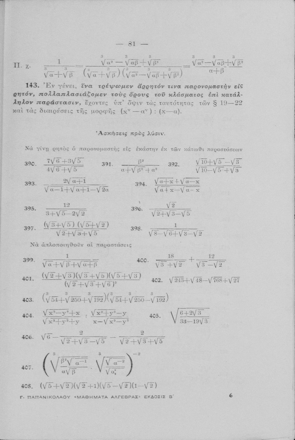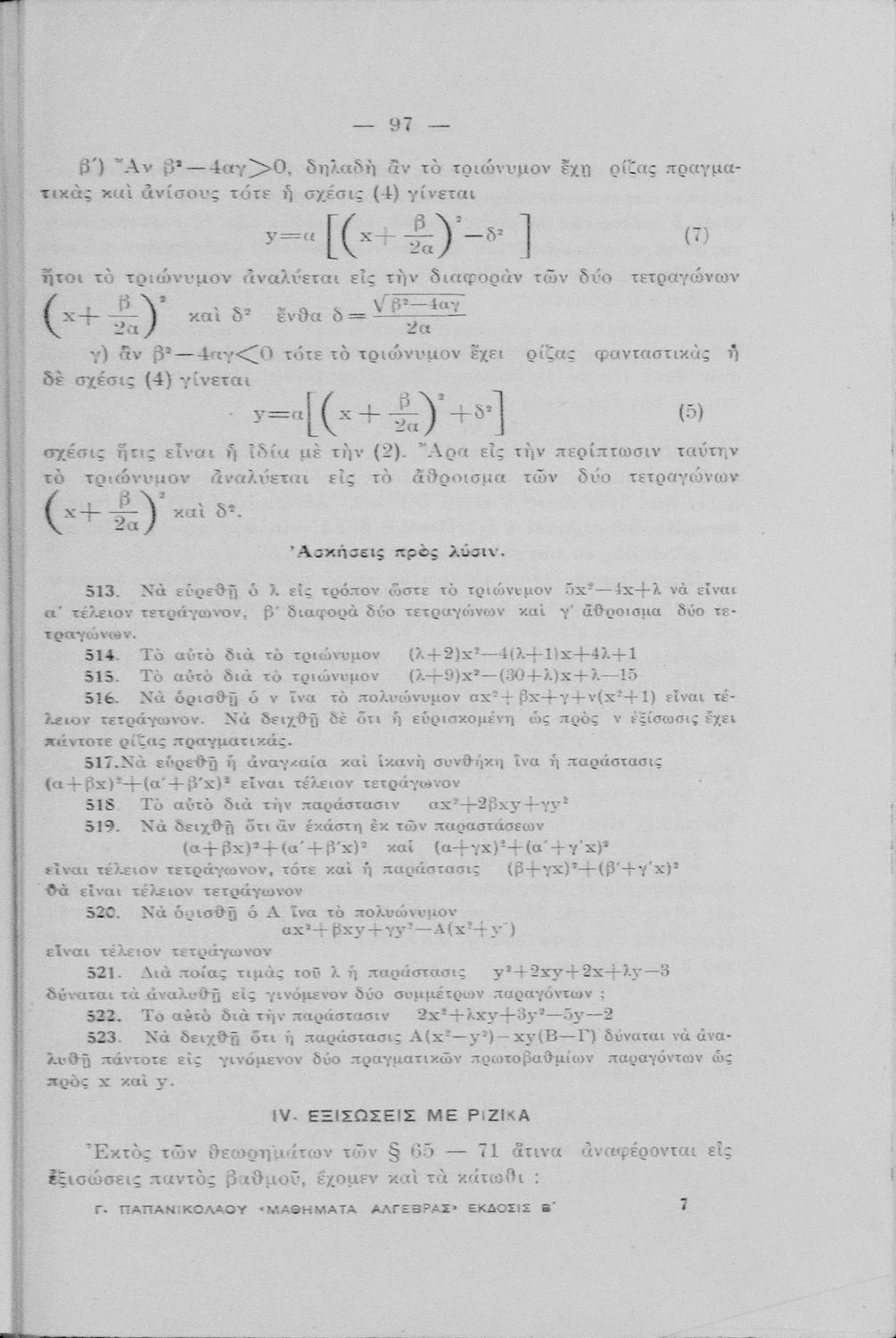 Μαθήματα Άλγεβρας δια τους μαθητάς των Πρακτικών Λυκείων, τους υποψηφίους των ανωτάτων σχολών του κράτους, τους φοιτητάς των Μαθηματικών κ.λ.π.