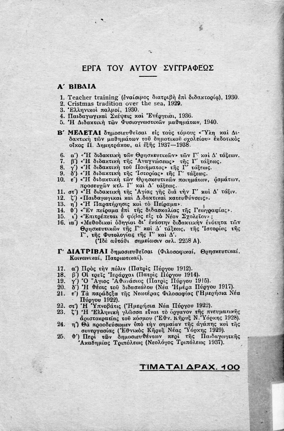 Παιδαγωγικό βοήθημα που αναφέρεται σε θέματα μεθοδολογίας και διδακτικής των διαφόρων μαθημάτων του Δημοτικού Σχολείου. Ο συγγραφέας ήταν Διευθυντής σε Δημοτικό Σχολείο του Μαρκόπουλου.