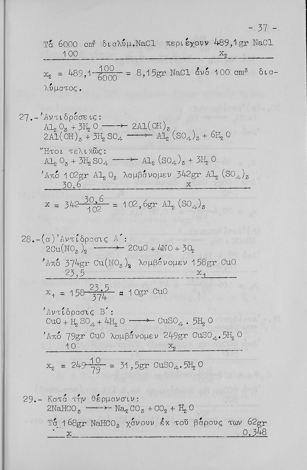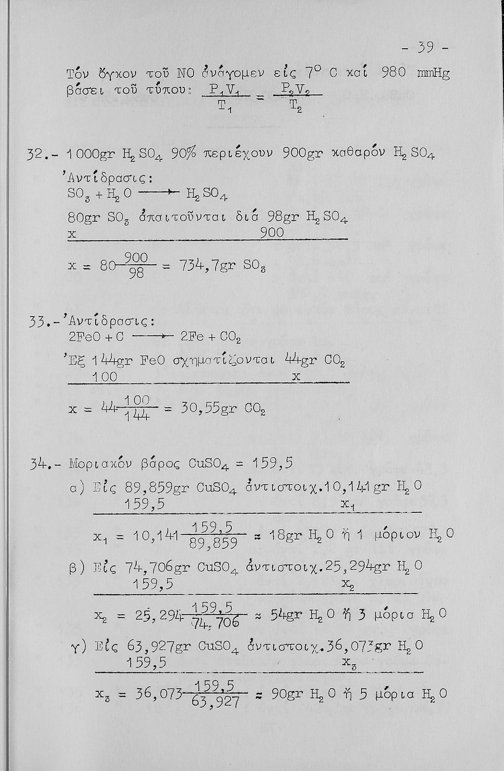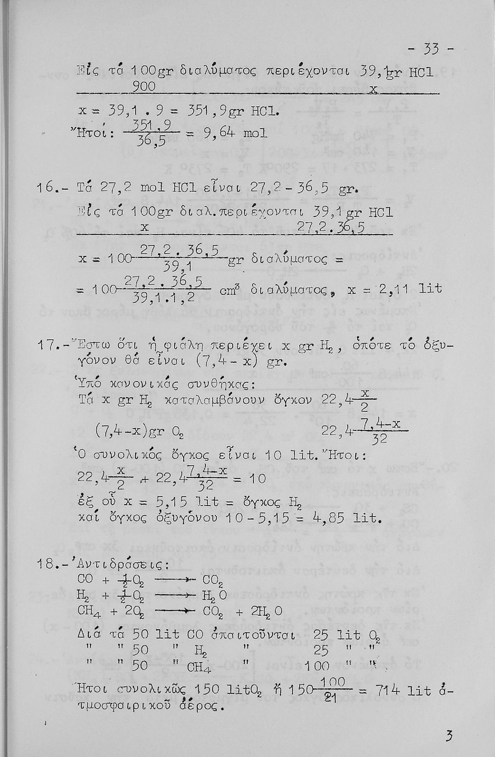 Βαθμίδα εκπαίδευσης: Δευτεροβάθμια Τάξη: Γυμνάσιο Μάθημα: Χημεία Γλώσσα: Καθαρεύουσα Παρουσίαση περιεχομένου: Μαθητικό βοήθημα που περιλαμβάνει λύσεις ασκήσεων για την εφαρμογή χημικών νόμων (Gay-Lussac, Boyle-Mariotte), τον υπολογισμό χημικών αντιδράσεων, εμπειρικών και μοριακών τύπων καθώς και τον υπολογισμό όγκου, σχετικής πυκνότητας και αντιδράσεων μεταξύ των στοιχείων. |