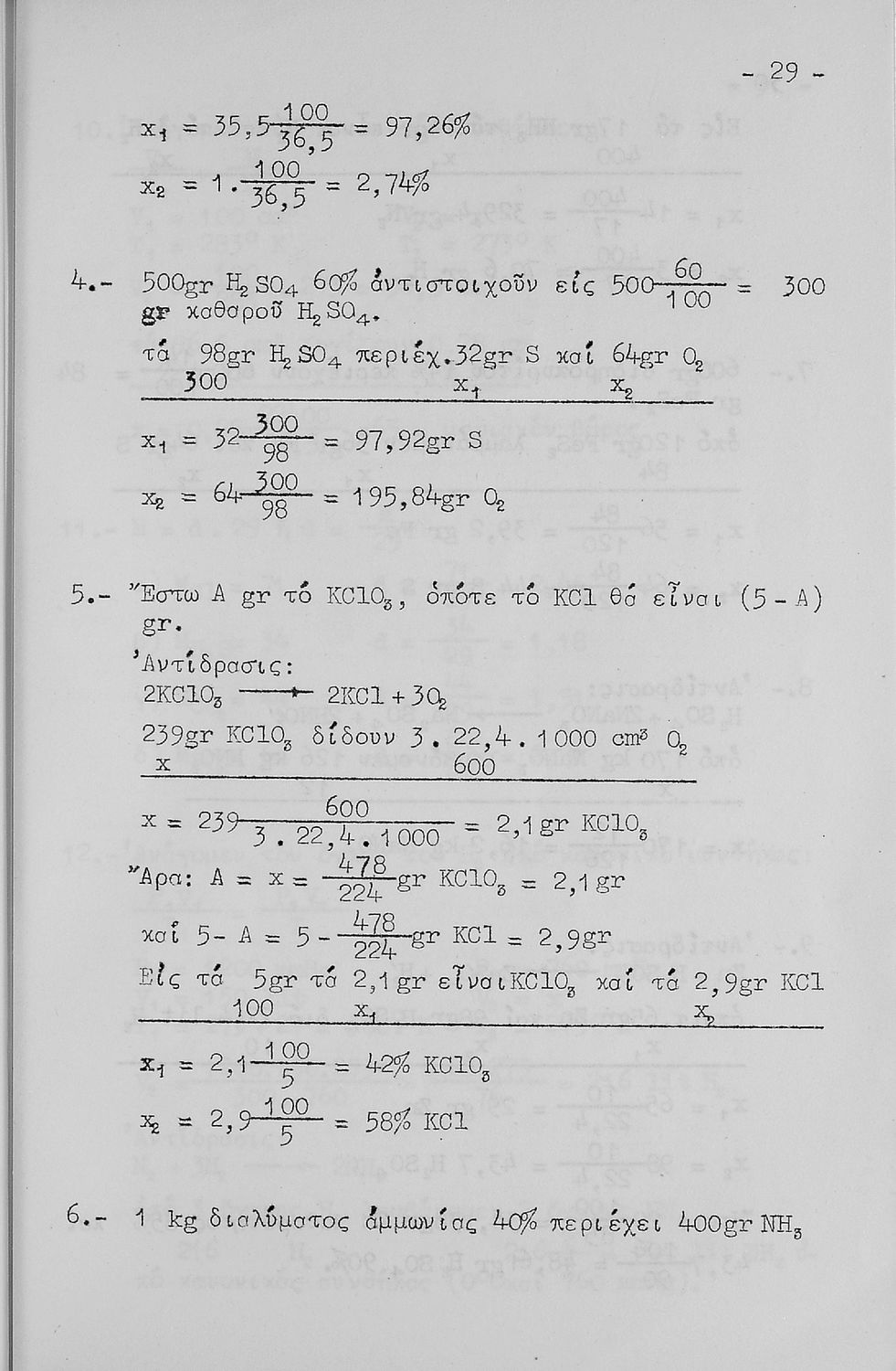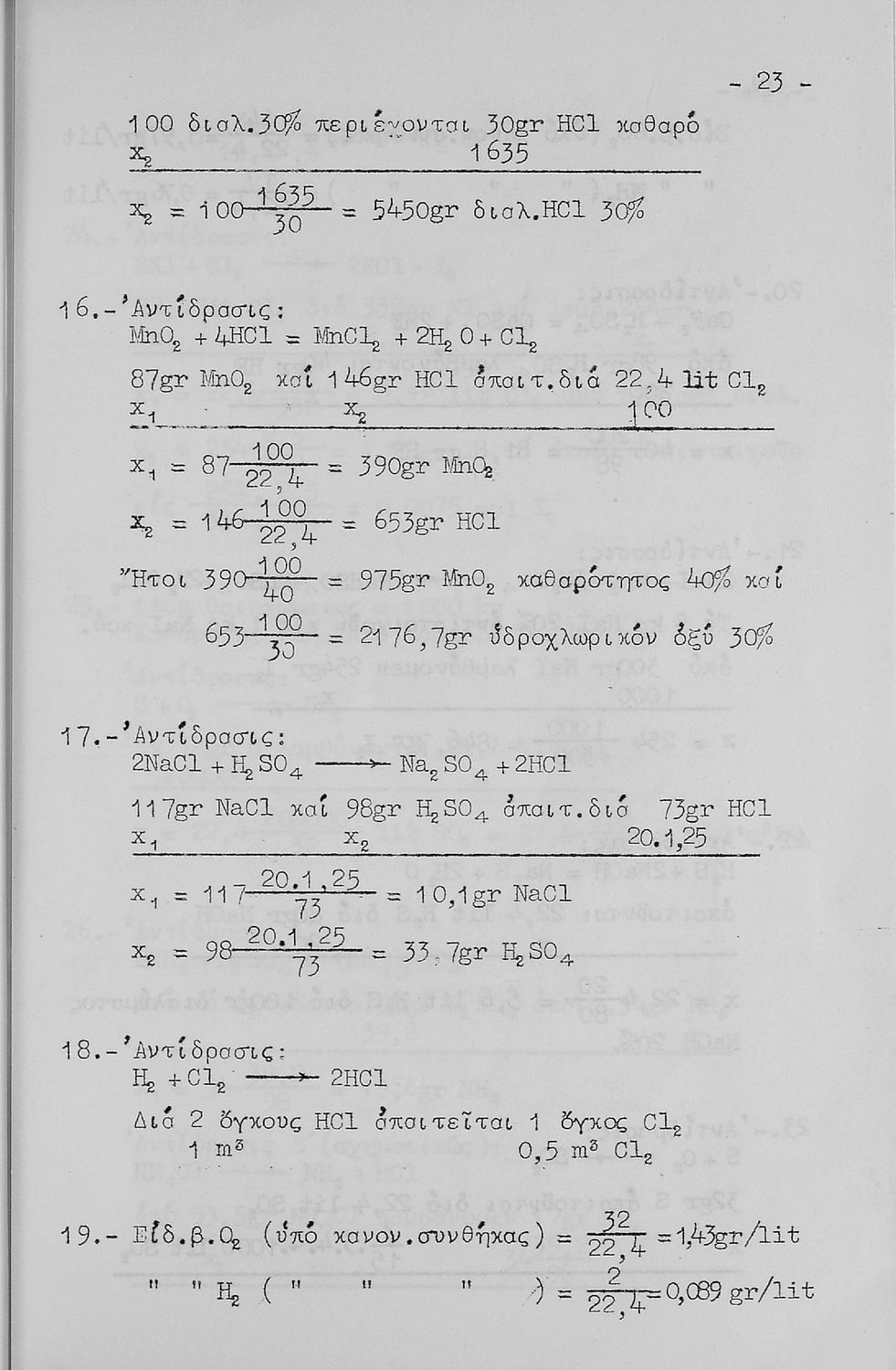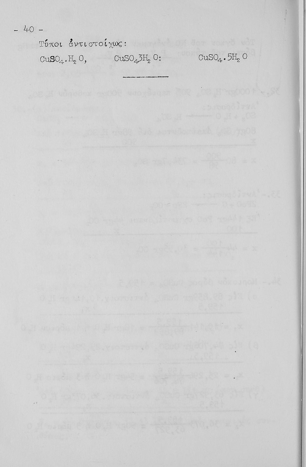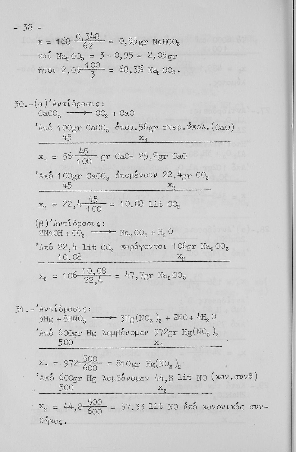 Βαθμίδα εκπαίδευσης: Δευτεροβάθμια Τάξη: Γυμνάσιο Μάθημα: Χημεία Γλώσσα: Καθαρεύουσα Παρουσίαση περιεχομένου: Μαθητικό βοήθημα που περιλαμβάνει λύσεις ασκήσεων για την εφαρμογή χημικών νόμων (Gay-Lussac, Boyle-Mariotte), τον υπολογισμό χημικών αντιδράσεων, εμπειρικών και μοριακών τύπων καθώς και τον υπολογισμό όγκου, σχετικής πυκνότητας και αντιδράσεων μεταξύ των στοιχείων. |