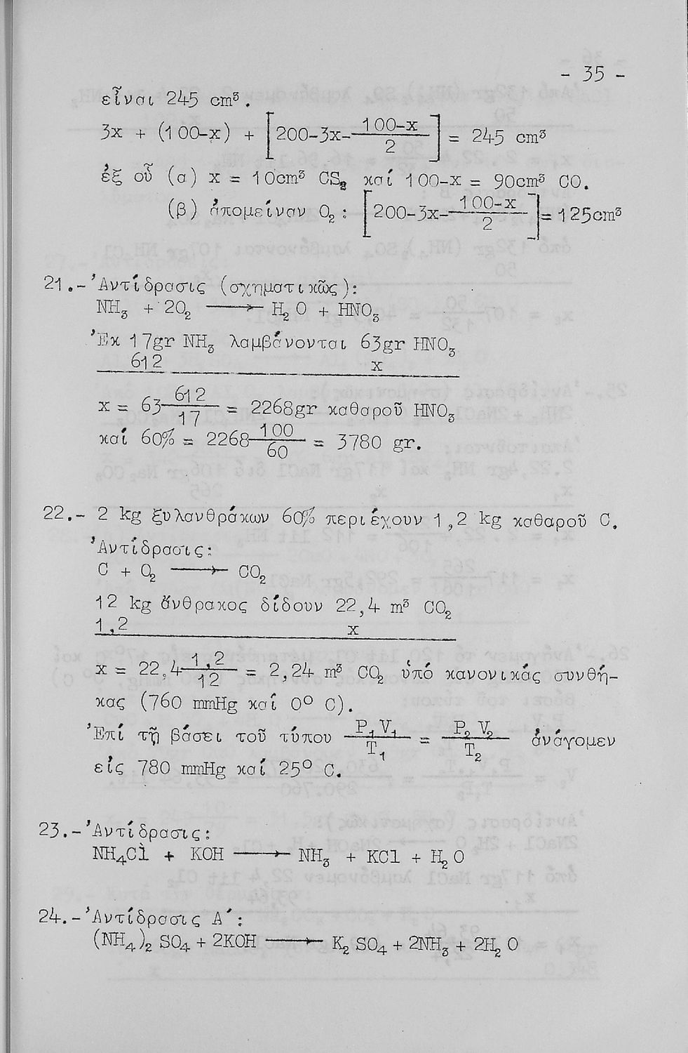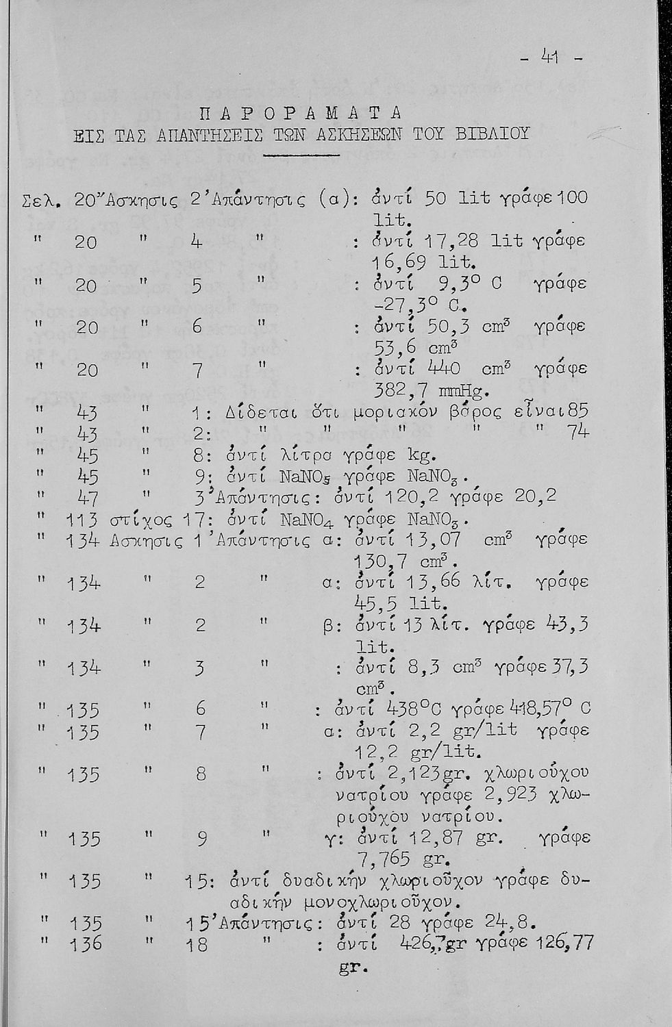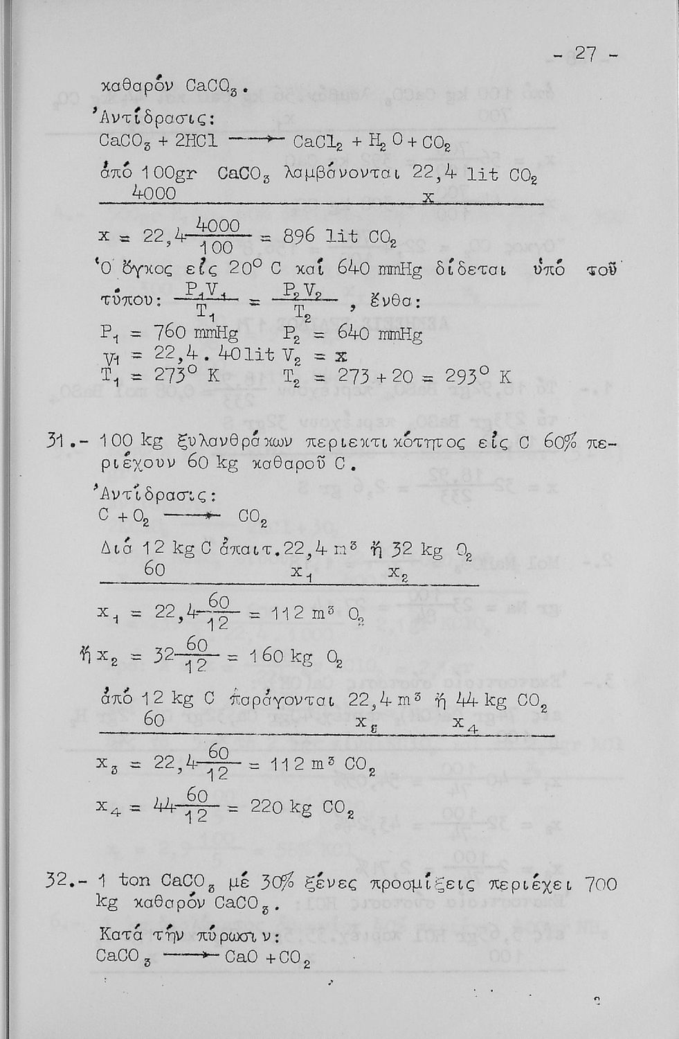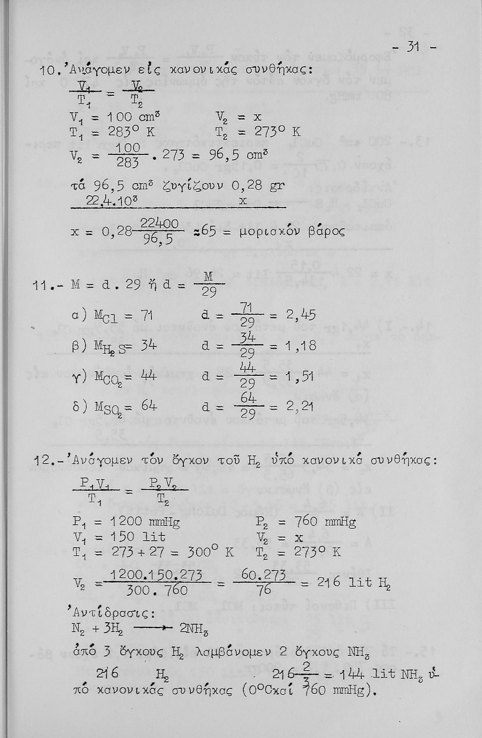 Μαθητικό βοήθημα που περιλαμβάνει λύσεις ασκήσεων για την εφαρμογή χημικών νόμων (Gay-Lussac, Boyle-Mariotte), τον υπολογισμό χημικών αντιδράσεων, εμπειρικών και μοριακών τύπων καθώς και τον υπολογισμό όγκου, σχετικής πυκνότητας και αντιδράσεων μεταξύ των στοιχείων.