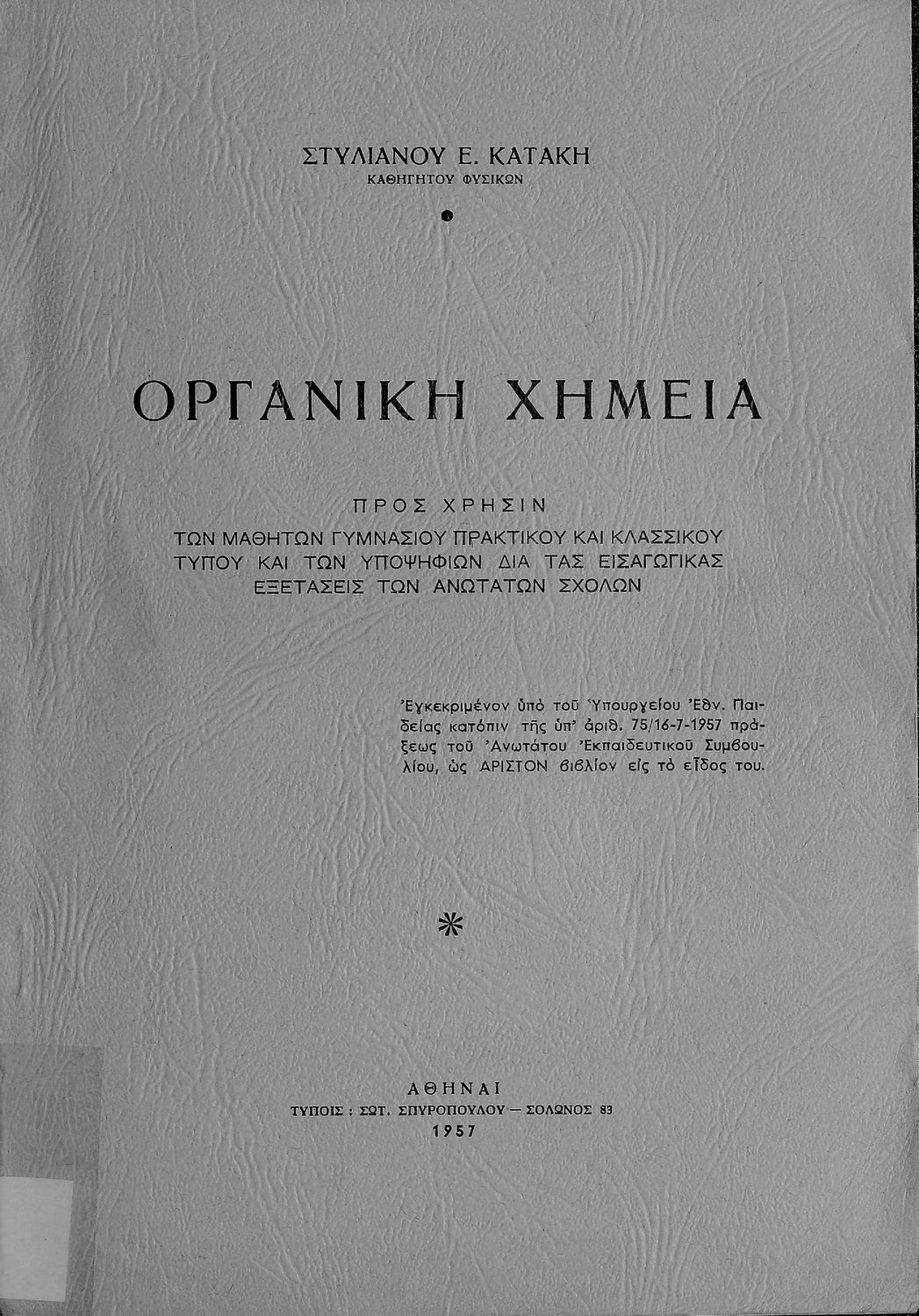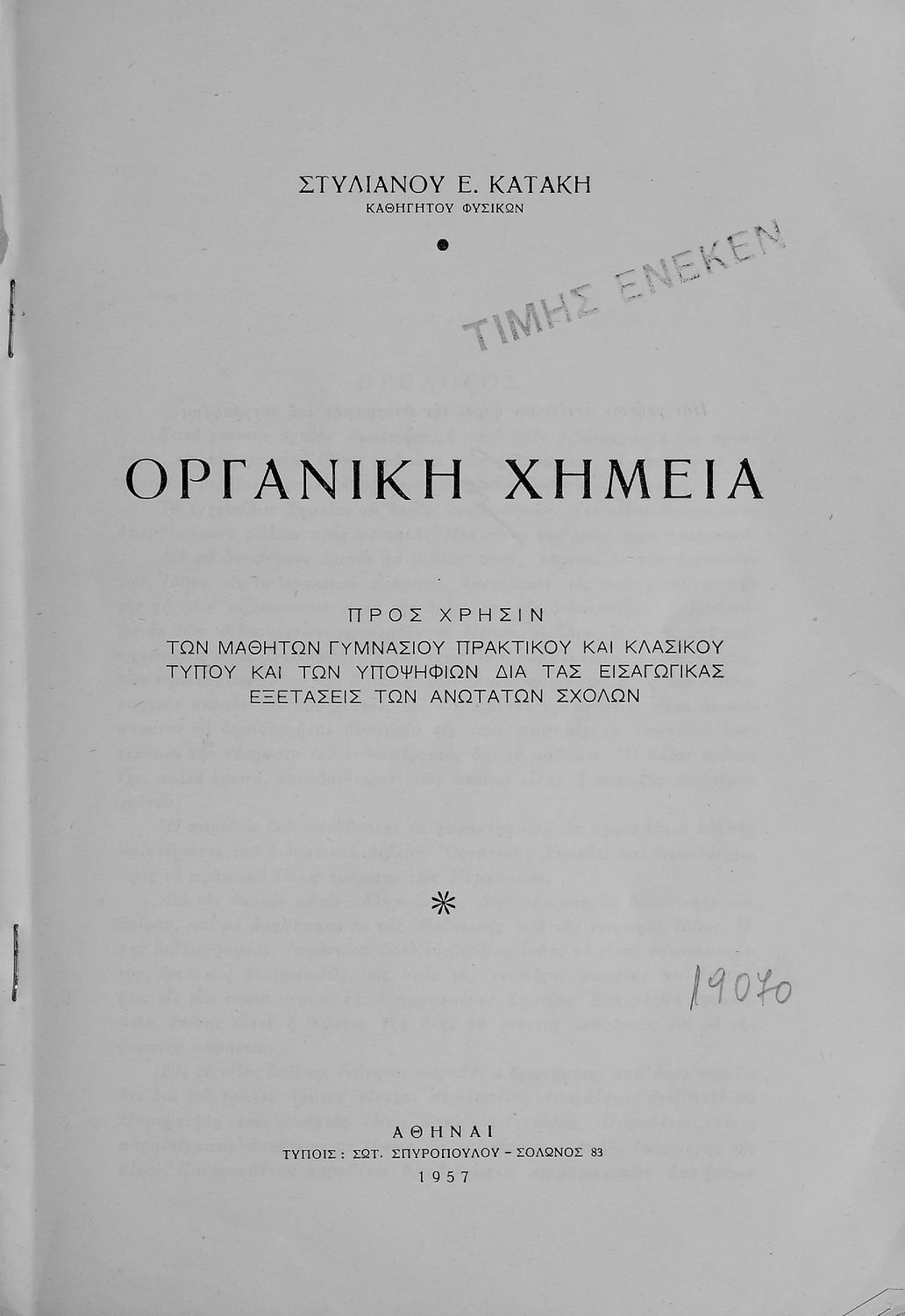 Τίτλος: Οργανική Χημεία προς χρήσιν των μαθητών Πρακτικού και Κλασικού τύπου και των υποψηφίων δια τας εισαγωγικάς εξετάσεις των Ανωτάτων Σχολών