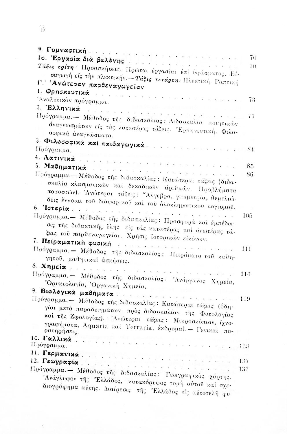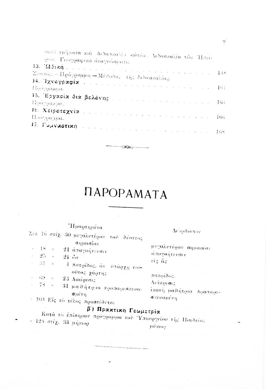 Αναλυτικό πρόγραμμα που εκδόθηκε με εντολή του Υπουργείου των Εκκλησιαστικών και της Δημόσιας Εκπαιδεύσεως από το τμήμα Δ΄, Μέσης Εκπαίδευσης, Γυμναστικής και Σκοποβολής. Στο εξώφυλλο υπάρχει το βασιλικό σήμα.